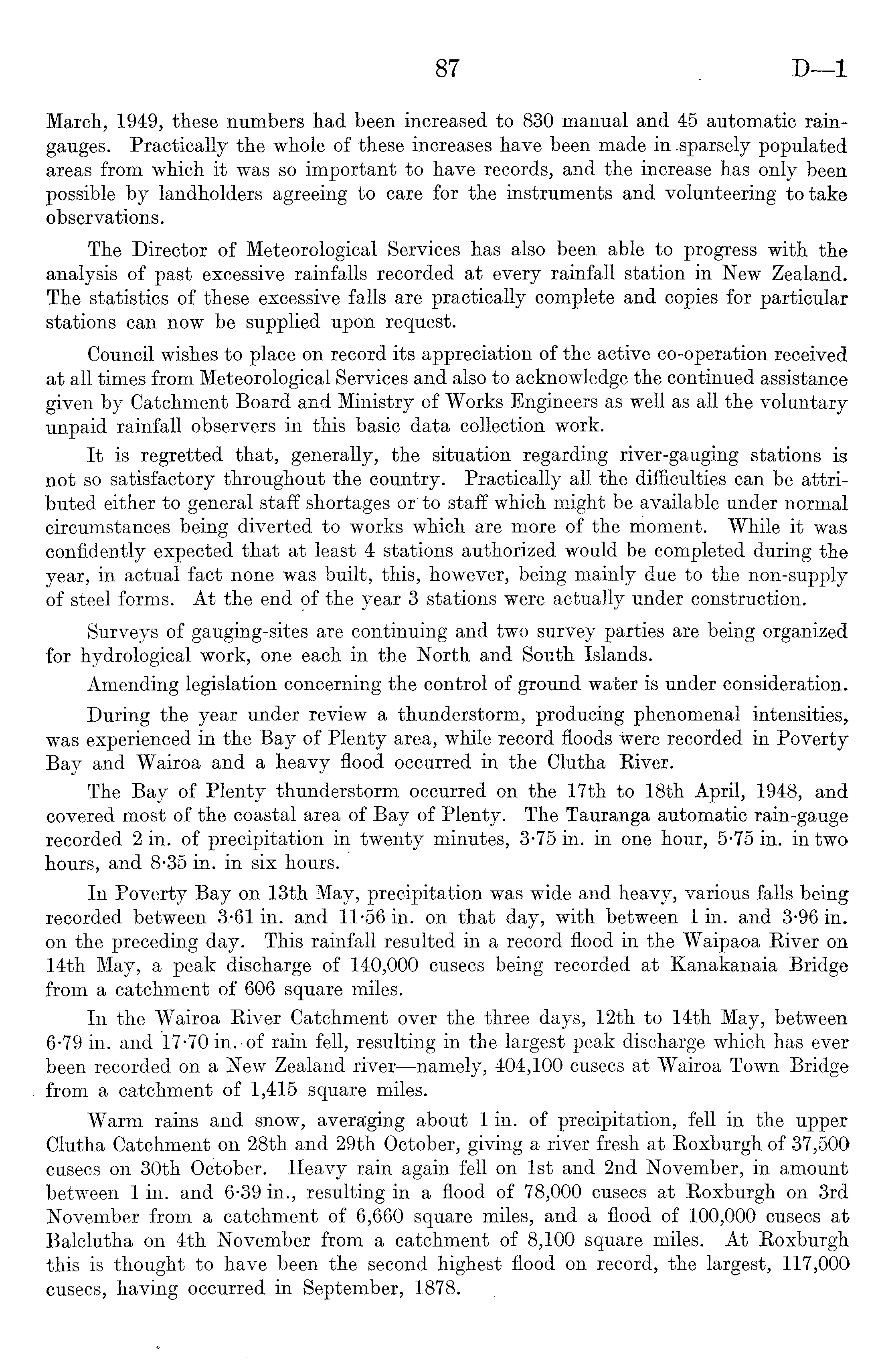 March, 1949, these numbers had been increased to 830 manual and 45 automatic raingauges. Practically the whole of these increases have been made in .sparsely populated areas from which it was so important to have records, and the increase has only been possible by landholders agreeing to care for the instruments and volunteering to take observations. The Director of Meteorological Services has also been able to progress with the analysis of past excessive rainfalls recorded at every rainfall station in New Zealand. The statistics of these excessive falls are practically complete and copies for particular stations can now be supplied upon request. Council wishes to place on record its appreciation of the active co-operation received at all times from Meteorological Services and also to acknowledge the continued assistance given by Catchment Board and Ministry of Works Engineers as well as all the voluntary unpaid rainfall observers in this basic data collection work. It is regretted that, generally, the situation regarding river-gauging stations is not so satisfactory throughout the country. Practically all the difficulties can be attributed either to general staff shortages or to staff which might be available under normal circumstances being diverted to works which are more of the moment. While it was confidently expected that at least 4 stations authorized would be completed during the year, in actual fact none was built, this, however, being mainly due to the non-supply of steel forms. At the end of the year 3 stations were actually under construction. Surveys of gauging-sites are continuing and two survey parties are being organized for hydrological work, one each in the North and South Islands. Amending legislation concerning the control of ground water is under consideration. During the year under review a thunderstorm, producing phenomenal intensities, was experienced in the Bay of Plenty area, while record floods were recorded in Poverty Bay and Wairoa and a heavy flood occurred in the Clutha River. The Bay of Plenty thunderstorm occurred on the 17th to 18th April, 1948, and covered most of the coastal area of Bay of Plenty. The Tauranga automatic rain-gauge recorded 2 in. of precipitation in twenty minutes, 3-75 in. in one hour, 5-75 in. in two hours, and 8-35 in. in six hours. In Poverty Bay on 13th May, precipitation was wide and heavy, various falls being recorded between 3-61 in. and 11-56 in. on that day, with between 1 in. and 3-96 in. on the preceding day. This rainfall resulted in a record flood in the Waipaoa River on 14th May, a peak discharge of 140,000 cusecs being recorded at Kanakanaia Bridge from a catchment of 606 square miles. In the Wairoa River Catchment over the three days, 12th to 14th May, between 6*79 in. and 17-70 in. of rain fell, resulting in the largest peak discharge which has ever been recorded on a New Zealand river—namely, 404,100 cusecs at Wairoa Town Bridge from a catchment of 1,415 square miles. Warm rains and snow, averaging about 1 in. of precipitation, fell in the upper Clutha Catchment on 28th and 29th October, giving a river fresh at Roxburgh of 37,500 cusecs on 30th October. Heavy rain again fell on Ist and 2nd November, in amount between 1 in. and 6-39 in., resulting in a flood of 78,000 cusecs at Roxburgh on 3rd November from a catchment of 6,660 square miles, and a flood of 100,000 cusecs at Balclutha on 4th November from a catchment of 8,100 square miles. At Roxburgh this is thought to have been the second highest flood on record, the largest, 117,000 cusecs, having occurred in September, 1878.