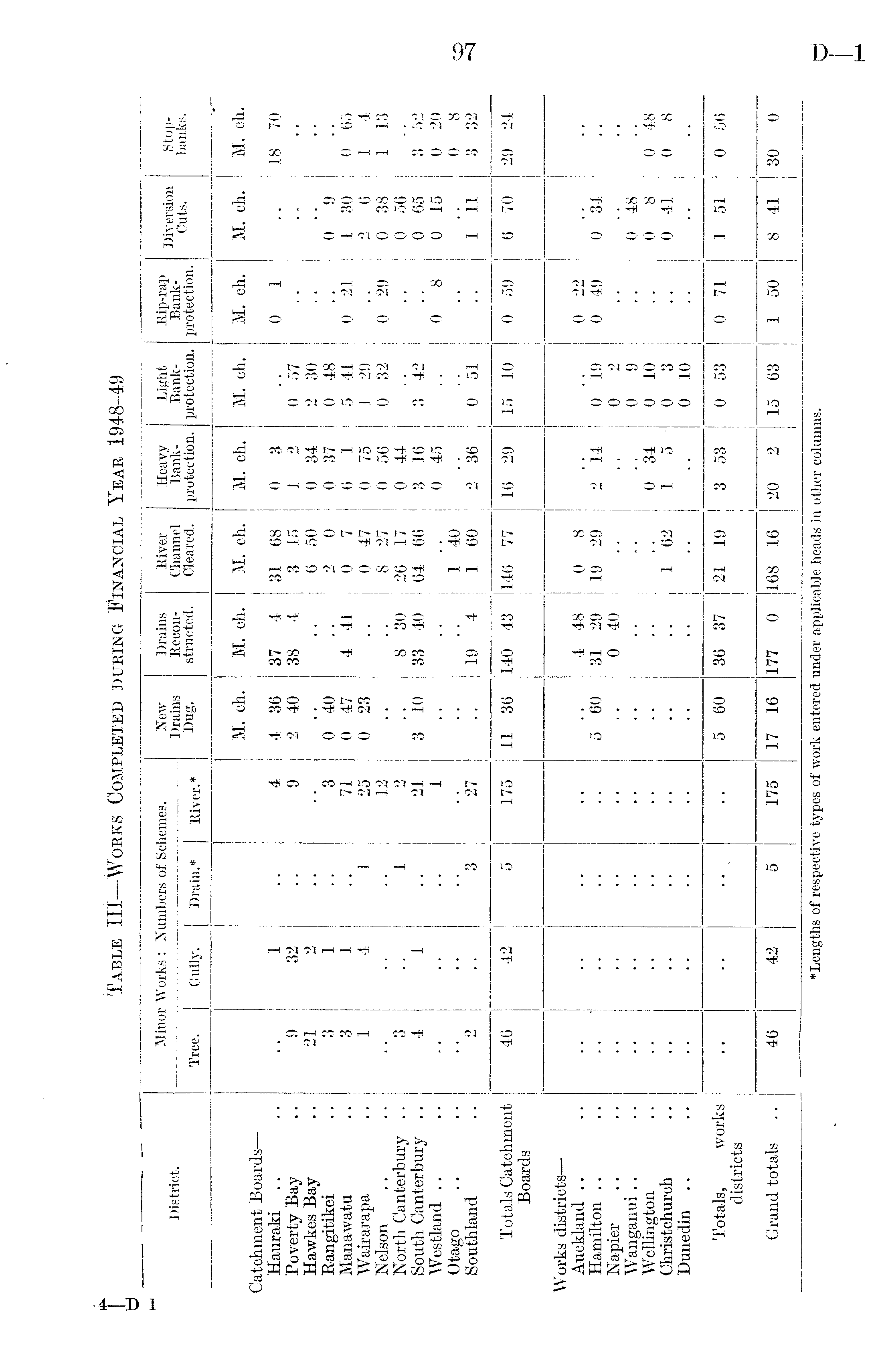 District. Minor Works : Numbers of Schemes. New Drains Dug. Drains Reconstructed. River Channel Cleared. Heavy Bankprotection. Light Bankprotection. Rip-rap Bankprotection. Diversion Cuts. Stopbanks. Tree. Gully. Drain.* River.* Catchment Boards — Hauraki Poverty Bay Hawkes Bay Rangitikei Manawatu Wairarapa Nelson North Canterbury .. South Canterbury .. Westland Otago Southland Totals Catchment Boards Works districts — Auckland Hamilton Napier Wanganui Wellington Christchurch Dunedin Totals, works districts Grand totals ' 9 21 3 3 1 3 4 2 1 32 2 1 1 4 "l "l 1 3 4 9 ' 3 71 25 12 2 21 1 *27 M. ch. 4 36 2 40 0 40 0 47 0 23 3 io M. ch. 37 4 38 4 4 41 8 30 33 40 19 4 M. ch. 31 68 3 15 6 50 2 0 0 7 0 47 8 27 26 17 64 66 1 '40 1 60 M. ch. 0 3 1 2 0 34 0 37 6 1 0 75 0 56 0 44 3 16 0 45 2 36 M. ch. 0 57 2 30 0 48 5 41 1 29 0 32 3 42 0 51 M. ch. 0 1 0 21 0 29 0 8 M. ch. 0 "9 1 30 2 6 0 38 0 06 0 65 0 15 1 11 M. ch. 18 70 0 65 1 4 1 13 3 52 • 0 20 0 8 3 32 46 42 5 175 11 36 140 43 146 77 16 29 15 10 0 59 6 70 29 24 [' 5 60 4 48 31 29 0 40 0 8 19 29 1 62 2 14: 0 34 1 5 0 19 0 2 0 9 0 10 0 3 0 10 0 22 0 49 0 *34 0 48 0 8 0 41 0 *48 0 8 •• 5 60 36 37 21 19 3 53 0 53 0 71 1 51 0 56 46 42 5 175 17 16 177 0 168 16 20 2 15 63 1 50 8 41 30 0 "Lengths of respective types of work entered under applicable heads in other columns.