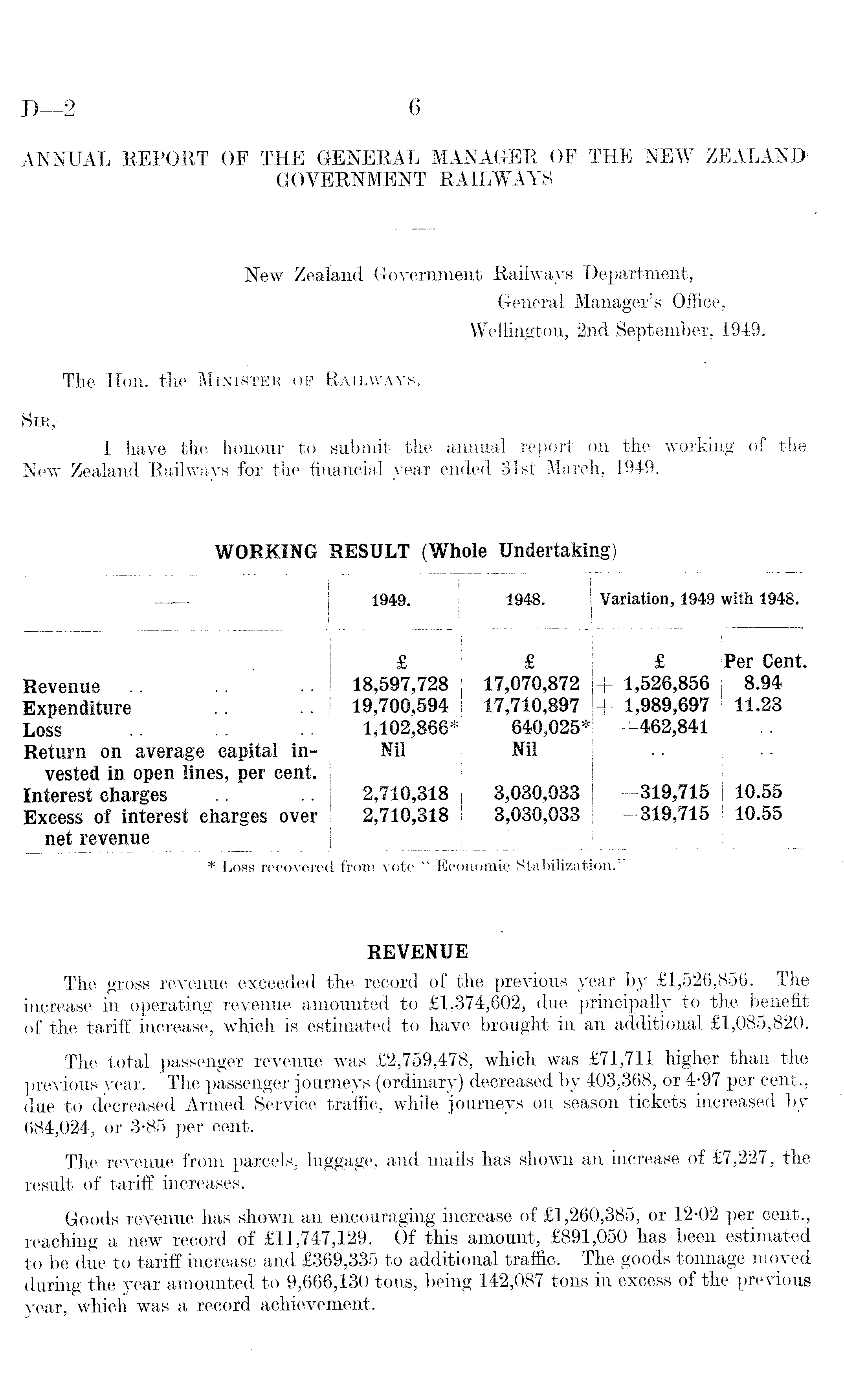 1 1949. 1948. Variation, 1949 with 1948. £ £ £ Per Cent. Revenue 18,597,728 17,070,872 + 1,526,856 8.94 Expenditure 19,700,594 17,710,897 + 1,989,697 11.23 Loss 1402,866* 640,025* +462,841 Return on average capital inNil Nil vested in open lines, per cent. Interest charges 2,710,318 3,030,033 -319,715 10.55 Excess of interest charges over 2,710,318 3,030,033 -319,715 10.55 net revenue * Loss recovered from vote " Economic Stabilization."