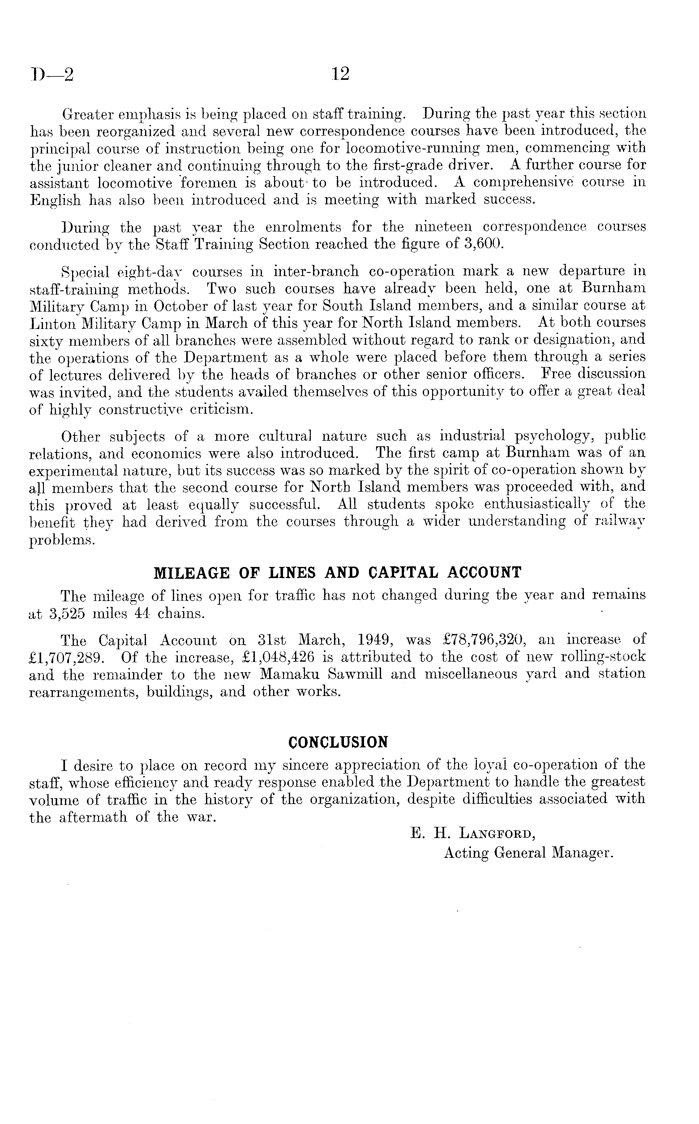 Greater emphasis is being placed on staff training. During the past year this section has been reorganized and several new correspondence courses have been introduced, the principal course of instruction being one for locomotive-running men, commencing with the junior cleaner and continuing through to the first-grade driver. A further course for assistant locomotive foremen is about'to be introduced. A comprehensive' course in English has also been introduced and is meeting with marked success. During the past year the enrolments for the nineteen correspondence courses conducted by the Staff Training Section reached the figure of 3,600. Special eigbt-day courses in inter-branch co-operation mark a new departure in staff-training methods. Two such courses have already been held, one at Burnham Military Camp in October of last year for South Island members, and a similar course at Linton Military Camp in March of this year for North Island members. At both courses sixty members of all branches were assembled without regard to rank or designation, and the operations of the Department as a whole were placed before them through a series of lectures delivered by the heads of branches or other senior officers. Free discussion was invited, and the students availed themselves of this opportunity to offer a great deal of highly constructive criticism. Other subjects of a more cultural nature such as industrial psychology, public relations, and economics were also introduced. The first camp at Burnham was of an experimental nature, but its success was so marked by the spirit of co-operation shown by all members that the second course for North Island members was proceeded with, and this proved at least equally successful. All students spoke enthusiastically of the benefit they had derived from the courses through a wider understanding of railway problems. MILEAGE OF LINES AND CAPITAL ACCOUNT The mileage of lines open for traffic has not changed during the year and remains at 3,525 miles 44 chains. The Capital Account on 31st March, 1949, was £78,796,320, an increase of £1,707,289. Of the increase, £1,048,426 is attributed to the cost of new rolling-stock and the remainder to the new Mamaku Sawmill and miscellaneous yard and station rearrangements, buildings, and other works. CONCLUSION I desire to place on record my sincere appreciation of the loyal co-operation of the staff, whose efficiency and ready response enabled the Department to handle the greatest volume of traffic in the history of the organization, despite difficulties associated with the aftermath of the war. E. H. Langford, Acting General Manager.