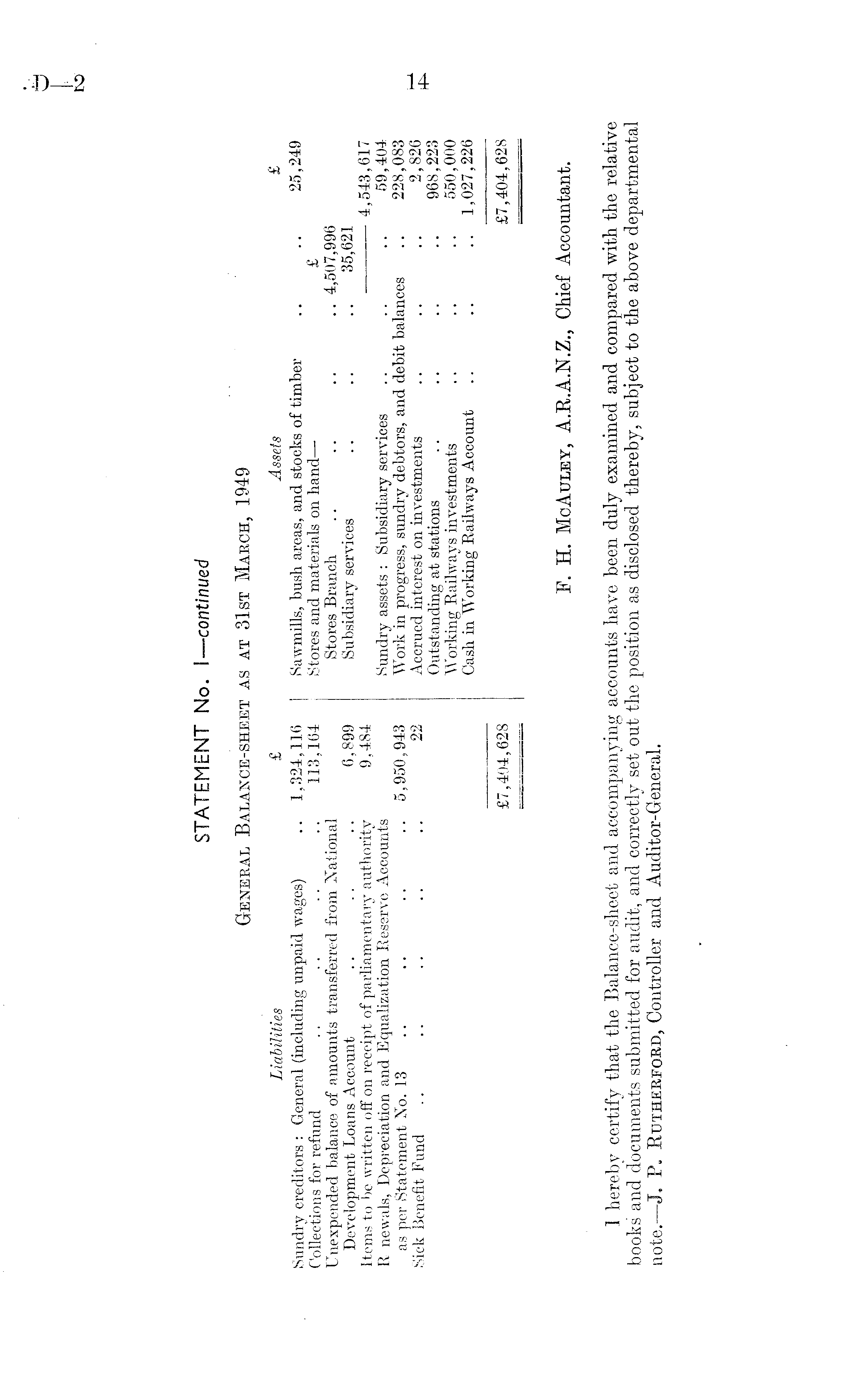 STATEMENT No. I— continued General Balance-sheet as at 31st March, 1949 Liabilities £ Assets £ Sundry creditors : General (including unpaid wages) .. 1,324,116 Sawmills, bush areas, and stocks of timber .. .. 25,249 Collections for refund .. .. .. .. 113,164 Stores and materials on hand— £ Unexpended balance of amounts transferred from National Stores Branch .. .. .. .. 4,507,996 Development Loans Account .. .. .. 6,899 Subsidiary services .. .. .. 35,621 Items to be written off on receipt of parliamentary authority 9,484 4,543,617 R newals, Depreciation and Equalization Reserve Accounts Sundry assets : Subsidiary services .. .. .. 59,404 as per Statement No. 13 .. .. .. .. 5,950,943 Work in progress, sundry debtors, and debit balances .. 228,083 Sick Benefit Fund .. .. .. .. .. 22 Accrued interest on investments .. .. .. 2,826 Outstanding at stations .. .. .. .. 968, 223 Working Railways investments .. .. .. 550, 000 Cash in Working Railways Account .. .. .. 1,027,226 £7,404,628 £7,404,628 F. H. McAuley, A.R.A.N.Z., Chief Accountant. I hereby certify that the Balance-sheet and accompanying accounts have been duly examined and compared with the relative books and documents submitted for audit, and correctly set out the position as disclosed thereby, subject to the above departmental note.— J. P. Rutherford, Controller and Auditor- General.