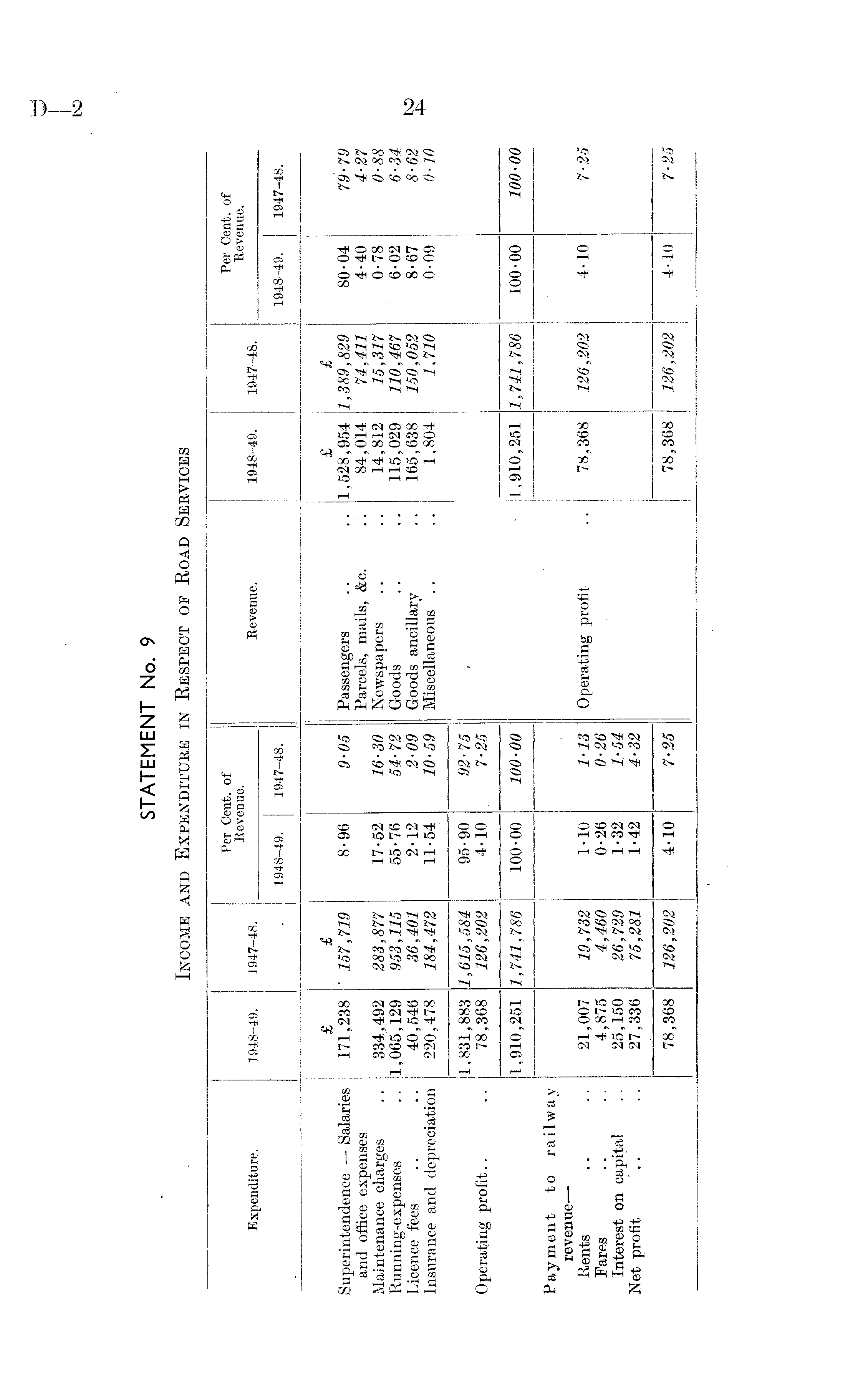 Expenditure. 1948-49. 1947-48. Per Cent, of Revenue. Revenue. 1948-49. 1947-48. Per Cent, of Revenue. 1948-49. 1947-48. 1948-49. 1947-48. Superintendence — Salaries and office expenses Maintenance charges Running-expenses Licence fees Insurance and depreciation £ 171,238 334,492 1,065,129 40,546 220,478 £ ■ 157,719 283,877 953,115 36,401 184,472 8-96 17-52 55-76 2-12 11-54 9-05 16-30 54-72 2-09 10-59 Passengers Parcels, mails, &c. Newspapers Goods Goods ancillary Miscellaneous £ 1,528,954 84,014 14,812 115,029 165,638 1,804 £ 1,389,829 74,411 15,317 110,467 150,052 1,710 80-04 4-40 0-78 6-02 8-67 0-09 79- 79 4-27 0-88 6-34 8-62 0-10 Operating profit 1,831,883 78,368 1,615,584 126,202 95-90 4-10 92-75 7-25 1,910,251 1,741,786 100-00 100-00 1,910,251 1,741,786 100-00 100-00 Payment to. railway revenue — Rents Fares Interest on capital Net profit 21,007 4,875 25,150 27,336 19,732 4,460 26,729 75,281 M0 0-26 1-32 1-42 1-13 0-26 1:54 4-32 Operating profit 78,368 126,202 4-10 7-25 78,368 126,202 4-10 7-25 78,368 126,202 4-10 7-25