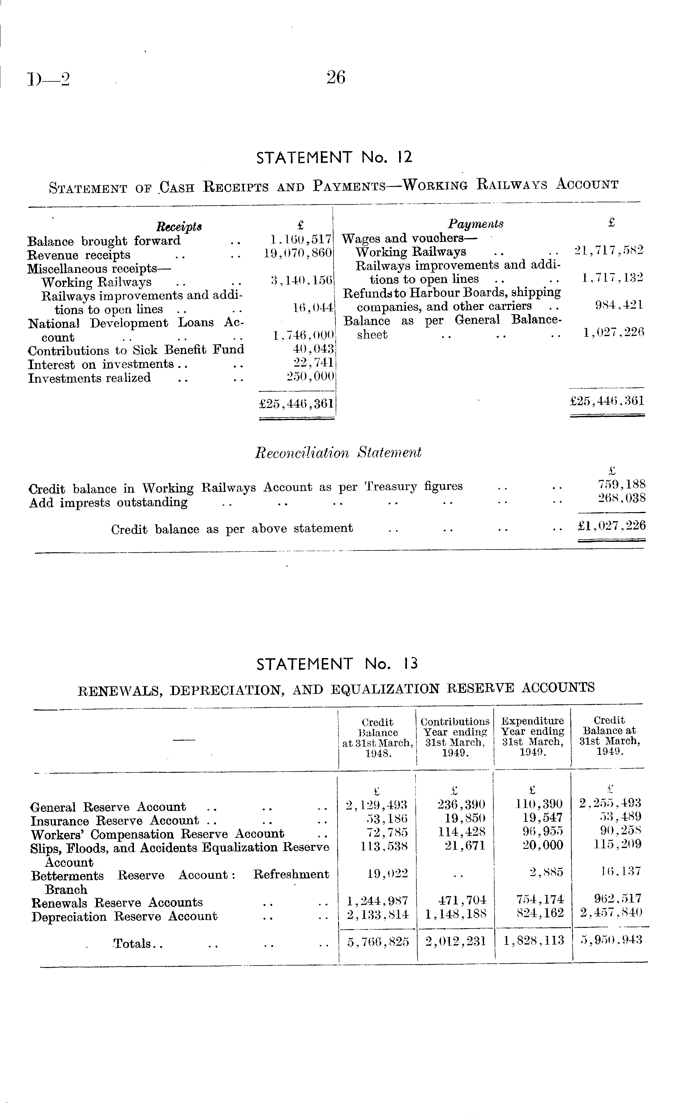STATEMENT No. 12 Statement of ,Cash Receipts and Payments—Working Railways Account Receipts £ Payments £ Balance brought forward .. 1,160,517 Wages and vouchers Revenue receipts .. .. 19,070,860 Working Railways .. .. 21,717,582 Miscellaneous receipts— Railways improvements and addiWorking Railways .. .. 3,140,156 tions to open lines .. .. 1,717,132 Railways improvements and addi- Refundsto Harbour Boards, shipping tions to open lines .. .. 16,044 companies, and other carriers .. 984,421 National Development Loans Ac- Balance as per General Balancecount .. .. -• 1,746,000 sheet .. .. •• 1,027,226 Contributions to Sick Benefit Fund 40,043 Interest on investments.. .. 22,741 Investments realized .. .. 250,000 £25,446,361 ' £25,446,361 Reconciliation Statement £ Credit balance in Working Railways Account as per Treasury figures .. .. 759,188 Add imprests outstanding .. .. . • •• •• •• •• 268,038 Credit balance as per above statement .. .. .. •• £1,027,226