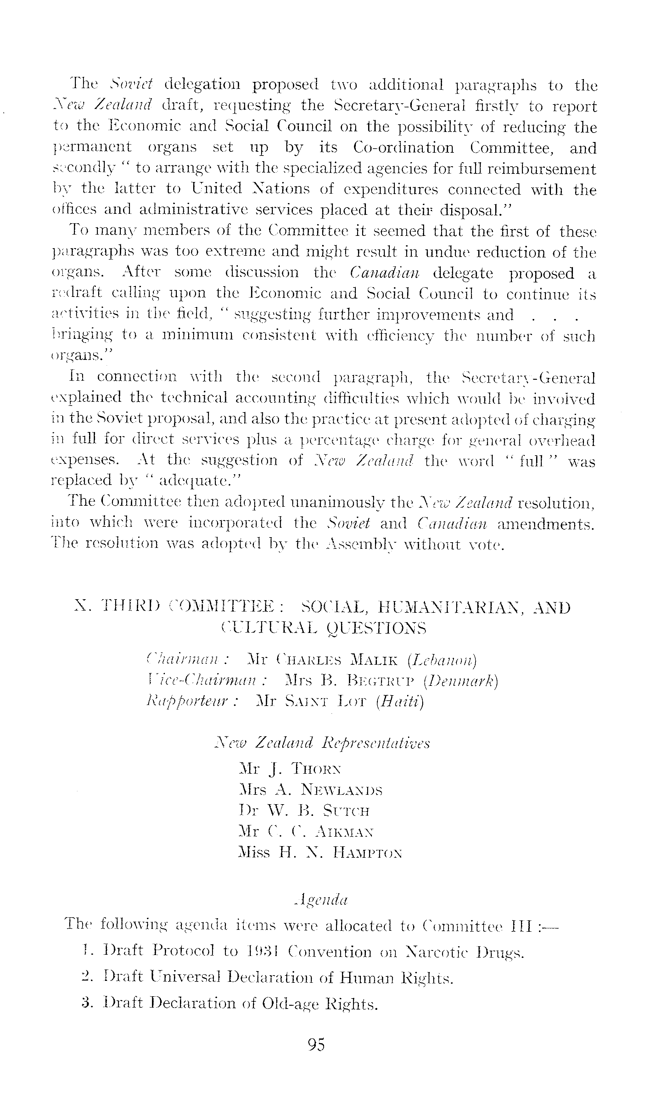 The Soviet delegation proposed two additional paragraphs to the New. Zealand draft, requesting the Secretary-General firstly to report to the Economic and Social Council on the possibility of reducing the permanent organs set up by its Co-ordination Committee, and secondly " to arrange with the specialized agencies for full reimbursement by the latter to United Nations of expenditures connected with the offices and administrative services placed at their disposal." To many members of the Committee it seemed that the first of these paragraphs was too extreme and might result in undue reduction of the organs. After some discussion the Canadian delegate proposed a redraft calling upon the Economic and Social Council to continue its activities in the field, " suggesting further improvements and . . . bringing to a minimum consistent with efficiency the number of such organs." In connection with the second paragraph, the Secretary-General explained the technical accounting difficulties which would be involved in the Soviet proposal, and also the practice at present adopted of charging in full for direct services plus a percentage charge for general overhead expenses. At the suggestion of New Zealand the word " full " was replaced by " adequate." The Committee then adopted unanimously the New Zealand resolution, into which were incorporated the Soviet and Canadian amendments. The resolution was adopted by the Assembly without vote. X. THIRD COMMITTEE : SOCIAL, HUMANITARIAN, AND CULTURAL QUESTIONS Chairman : Mr Charles Malik (Lebanon) Vice-Chairman: Mrs B. Begtrup (Denmark) Rapporteur : Mr Saint Lot (Haiti) New Zealand Representatives Mr J. Thorn Mrs A. Newlands Dr W. B. Sutch Mr C. C. Airman Miss H. N. Hampton Agenda The following agenda items were allocated to Committee 111 : 1. Draft Protocol to 1931 Convention on Narcotic Drugs. 2. Draft Universal Declaration of Human Rights. 3. Draft Declaration of Old-age Rights.