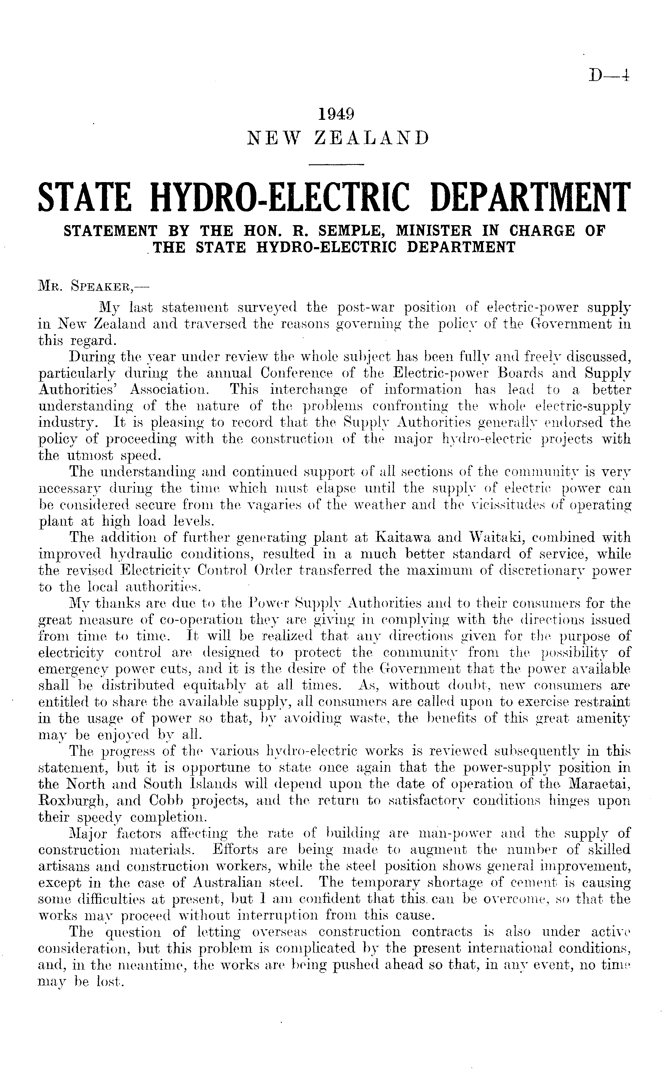Mr. Speaker,— My last statement surveyed the post-war position of electric-power supply in New Zealand and traversed the reasons governing the policy of the Government in this regard. During the year under review the whole subject has been fully and freely discussed, particularly during the annual Conference of the Electric-power Boards and Supply Authorities' Association. This interchange of information has lead to a better understanding of the nature of the problems confronting the whole electric-supply industry. It is pleasing to record that the Supply Authorities generally endorsed the policy of proceeding with the construction of the major hydro-electric projects with the utmost speed. The understanding and continued support of all sections of the community is very necessary during the time which must elapse until the supply of electric power can be considered secure from the vagaries of the weather and the vicissitudes of operating plant at high load levels. The addition of further generating plant at Kaitawa and Waitaki, combined with improved hydraulic conditions, resulted in a much better standard of service, while the revised Electricity Control Order transferred the maximum of discretionary power to the local authorities. My thanks are due to the Power Supply Authorities and to their consumers for the great measure of co-operation they are giving in complying with the directions issued from time to time. It will be realized that any directions given for the purpose of electricity control are designed to protect the community from the possibility of emergency power cuts, and it is the desire of the Government that the power available shall be distributed equitably at all times. As, without doubt, new consumers are entitled to share the available supply, all consumers are called upon to exercise restraint in the usage of power so that, by avoiding waste, the benefits of this great amenity may be enjoyed by all. The progress of the various hydro-electric works is reviewed subsequently in this statement, but it is opportune to state once again that the power-supply position in the North and South Islands will depend upon the date of operation of the Maraetai, Roxburgh, and Cobb projects, and the return to satisfactory conditions hinges upon their speedy completion. Major factors affecting the rate of building are man-power and the supply of construction materials. Efforts are being made to augment the number of skilled artisans and construction workers, while the steel position shows general improvement, except in the case of Australian steel. The temporary shortage of cement is causing some difficulties at present, but I am confident that this, can be overcome, so that the works may proceed without interruption from this cause. The question of letting overseas construction contracts is also under active consideration, but this problem is complicated by the present international conditions, and, in the meantime, the works are being pushed ahead so that, in any event, no time may be lost.