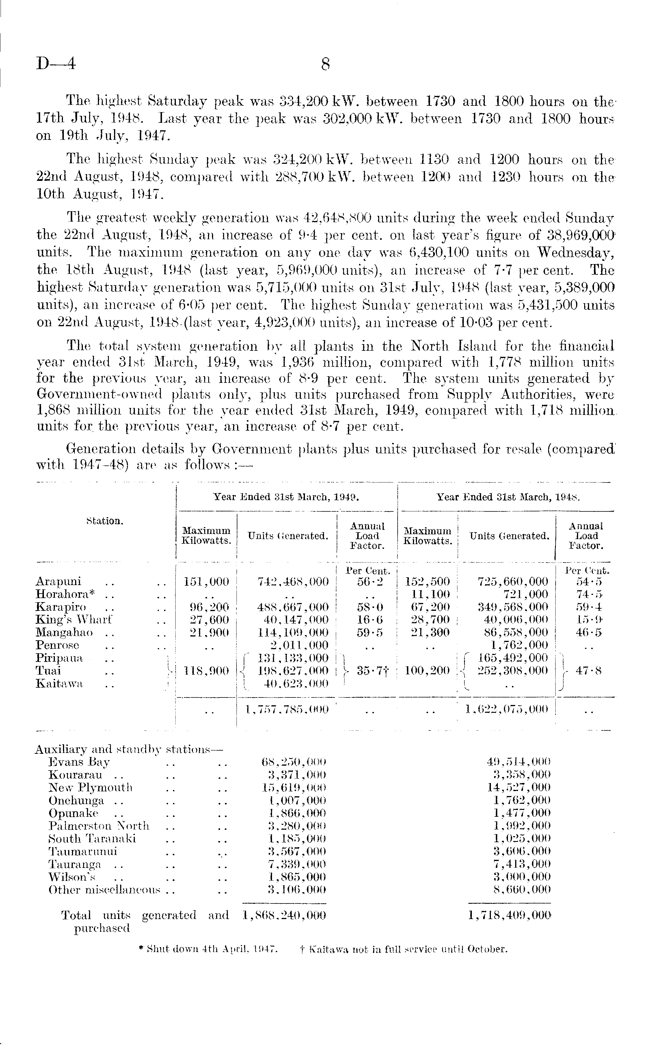 The highest Saturday peak was 334,200 kW. between 1730 and 1800 hours on the' 17th July, 1948. Last year the peak was 302,000 kW. between 1730 and 1800 hours on 19th July, 1947. The highest Sunday peak was 324,200 kW. between 1130 and 1200 hours on the 22nd August, 1948, compared with 288,700 kW. between 1200 and 1230 hours on the 10th August, 1947. The greatest weekly generation was 42,648,800 units during the week ended Sunday the 22nd August, 1948, an increase of 9-4 per cent, on last year's figure of 38,969,000 units. The maximum generation on any one day was 6,430,100 units on Wednesday, the 18th August, 1948 (last year, 5,969,000 units), an increase of 7-7 per cent. The highest Saturday generation was 5,715,000 units on 31st July, 1948 (last year, 5,389,000 units), an increase of 6-05 per cent. The highest Sunday generation was 5,431,500 units on 22nd August, 1948-(last year, 4,923,000 units), an increase of 10-03 per cent. The total system generation by all plants in the North Island for the financial year ended 31st March, 1949, was 1,936 million, compared with 1,778 million units for the previous year, an increase of 8-9 per cent. The system units generated by Government-owned plants only, plus units purchased from Supply Authorities, were 1,868 million units for the year ended 31st March, 1949, compared with 1,718 million, units for. the previous year, an increase of 8-7 per cent.