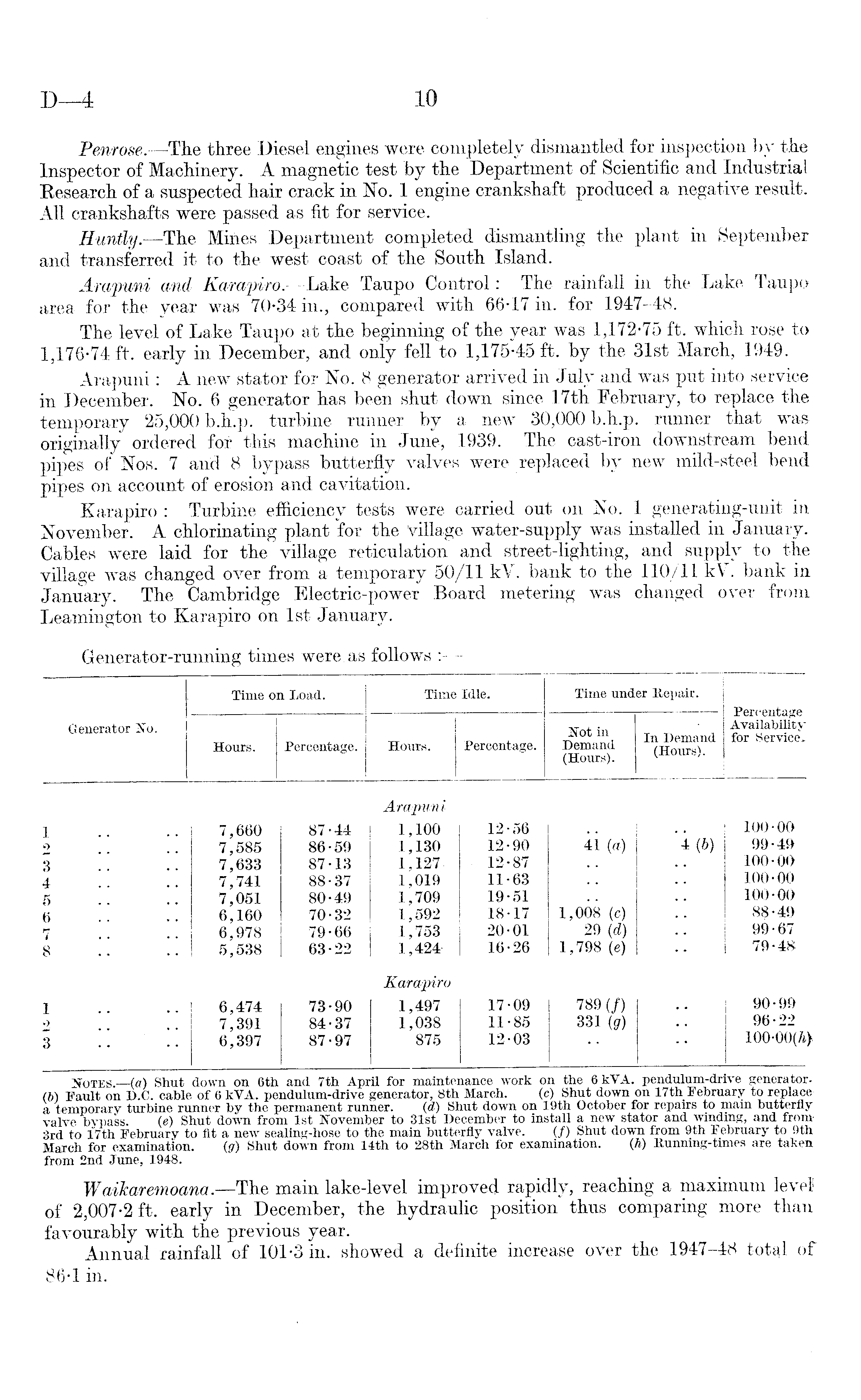 Penrose. —The three Diesel engines were completely dismantled for inspection by the Inspector of Machinery. A magnetic test by the Department of Scientific and Industrial Eesearch of a suspected hair crack in No. 1 engine crankshaft produced a negative result. All crankshafts were passed as fit for service. Huntly. —The Mines Department completed dismantling the plant in September and transferred it to the west coast of the South Island. Arapuni and Karapiro. —Lake Taupo Control: The rainfall in the Lake Taupo area for the year was 70-34 in., compared with 66-17 in. for 1947-48. The level of Lake Taupo at the beginning of the year was 1,172-75 ft. which rose to 1,176-74 ft, early in December, and only fell to 1,175-45 ft. by the 31st March, 1949. Arapuni: A new stator for No. 8 generator arrived in July and was put into service in December. No. 6 generator has been shut down since 17th February, to replace the temporary 25,000 b.h.p. turbine runner by a new 30,000 b.h.p. runner that was originally ordered for this machine in June, 1939. The cast-iron downstream bend pipes of Nos. 7 and 8 bypass butterfly valves were replaced by new mild-steel bend pipes on account of erosion and cavitation. Karapiro : Turbine efficiency tests were carried out on No. 1 generating-unit in November. A chlorinating plant for the village water-supply was installed in January. Cables were laid for the village reticulation and street-lighting, and supply to the village was changed over from a temporary 50/11 kV. bank to the 110/11 kV. bank in January. The Cambridge Electric-power Board metering was changed over from Leamington to Karapiro on Ist January.