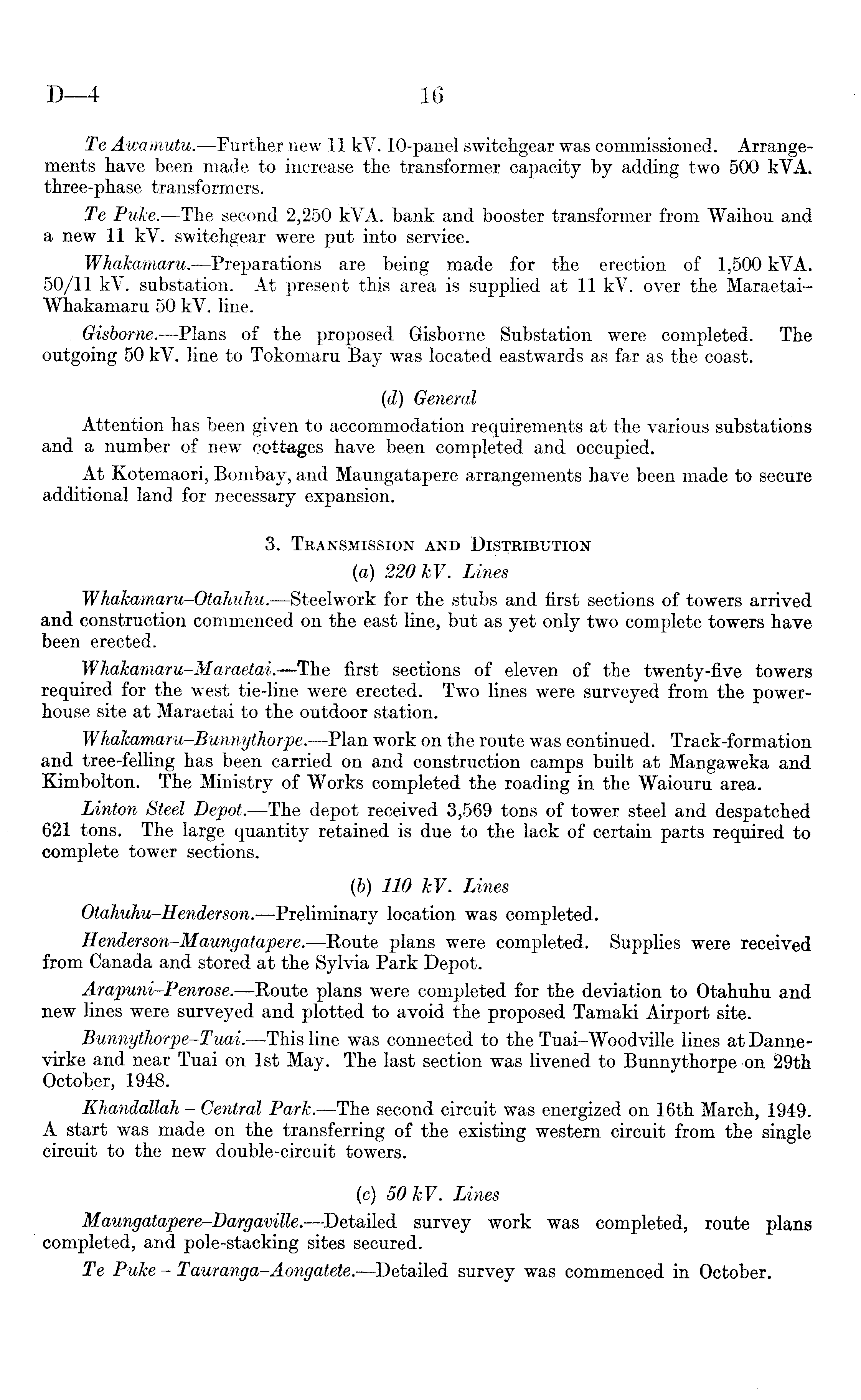 Te Awamutu. —Further new 11 kV. 10-panel switchgear was commissioned. Arrangements have been made to increase the transformer capacity by adding two 500 kVA. three-phase transformers. Te Puke. —The second 2,250 kVA. bank and booster transformer from Waihou and a new 11 kV. switchgear were put into service. Whakatnaru. —Preparations are being made for the erection of 1,500 kVA. 50/11 kV. substation. At present this area is supplied at 11 kV. over the MaraetaiWhakamaru 50 kV. line. Gisborne. —Plans of the proposed Gisborne Substation were completed. The outgoing 50 kV. line to Tokomaru Bay was located eastwards as far as the coast. (d) General Attention has been given to accommodation requirements at the various substations and a number of new cottages have been completed and occupied. At Kotemaori, Bombay, and Maungatapere arrangements have been made to secure additional land for necessary expansion. 3. Transmission and Distribution (a) 220 kV. Lines Whakamaru-Otahuhu. —Steelwork for the stubs and first sections of towers arrived and construction commenced on the east line, but as yet only two complete towers have been erected. Whakaniaru-Maraetai. —The first sections of eleven of the twenty-five towers required for the west tie-line were erected. Two lines were surveyed from the powerhouse site at Maraetai to the outdoor station. Whakamaru-Bunnythorpe. —Plan work on the route was continued. Track-formation and tree-felling has been carried on and construction camps built at Mangaweka and Kimbolton. The Ministry of Works completed the roading in the Waiouru area. Linton Steel Depot. —The depot received 3,569 tons of tower steel and despatched 621 tons. The large quantity retained is due to the lack of certain parts required to complete tower sections. (b) 110 kV. Lines Otahuhu-Henferson.—Preliminary location was completed. Henderson-Maungatapere. —Koute plans were completed. Supplies were received from Canada and stored at the Sylvia Park Depot. Arapuni-Penrose. —Route plans were completed for the deviation to Otahuhu and new lines were surveyed and plotted to avoid the proposed Tamaki Airport site. Bunnythorpe-Tuai. —This line was connected to the Tuai-Woodville lines at Dannevirke and near Tuai on Ist May. The last section was livened to Bunnythorpe on 29th October, 1948. Khdndallah - Central Park. —The second circuit was energized on 16th March, 1949. A start was made on the transferring of the existing western circuit from the single circuit to the new double-circuit towers. (c) 50 kV. Lines Maungatapere-Dargaville. —Detailed survey work was completed, route plans completed, and pole-stacking sites secured. Te Puke - Tauranga-Aongatete. —Detailed survey was commenced in October.