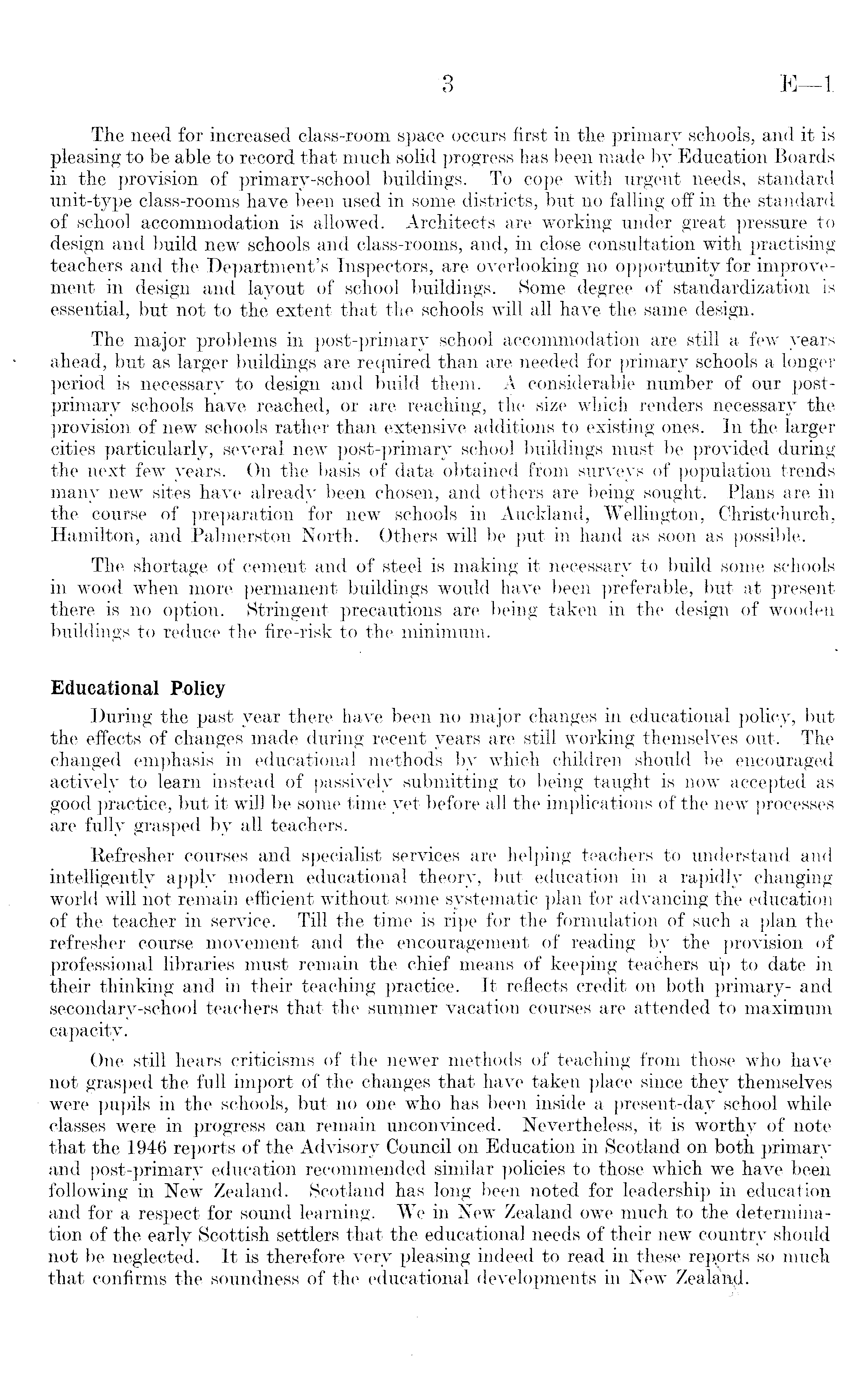 The need for increased class-room space occurs first in the primary schools, and it is pleasing to be able to record that much solid progress has been made by Education Boards in the provision of primary-school buildings. To cope with urgent needs, standard unit-type class-rooms have been used in some districts, but no falling off in the standard of school accommodation is allowed. Architects are working under great pressure to design and build new schools and class-rooms, and, in close consultation with practising teachers and the Department's Inspectors, are overlooking no opportunity for improvement in design and layout of school buildings. Some degree of standardization is essential, but not to the extent that the schools will all have the same design. The major problems in post-primary school accommodation are still a few years ahead, but as larger buildings are required than are needed for primary schools a longer period is necessary to design and build them. A considerable number of our postprimary schools have reached, or are reaching, the size which renders necessary the provision of new schools rather than extensive additions to existing ones. In the larger cities particularly, several new post-primary school buildings must be provided during the next few years. On the basis of data obtained from surveys of population trends many new sites have already been chosen, and others are being sought. Plans are in the course of preparation for new schools in Auckland, Wellington, Christchurch, Hamilton, and Palmerston North. Others will be put in hand as soon as possible. The shortage of cement and of steel is making it necessary to build some schools in wood when more permanent buildings would have been preferable, but at present there is no option. Stringent precautions are being taken in the design of wooden buildings to reduce the fire-risk to the minimum. Educational Policy During the past year there have been no major changes in educational policy, but the effects of changes made during recent years are still working themselves out. The changed emphasis in educational methods by which children should be encouraged actively to learn instead of passively submitting to being taught is now accepted as good practice, but it will be some time yet before all the implications of the new processes are fully grasped by all teachers. Refresher c6urses and specialist services are helping teachers to understand and intelligently apply modern educational theory, but education in a rapidly changing world will not remain efficient without some systematic plan for advancing the education of the teacher in service. Till the time is ripe for the formulation of such a plan the refresher course movement and the encouragement of reading by the provision of professional libraries must remain the chief means of keeping teachers up to date in their thinking and in their teaching practice. It reflects credit on both primary- and secondary-school teachers that the summer vacation courses are attended to maximum capacity. One still hears criticisms of the newer methods of teaching from those who have not grasped the full import of the changes that have taken place since they themselves were pupils in the schools, but no one who has been inside a present-day school while classes were in progress can remain Unconvinced. Nevertheless, it is worthy of note that the 1946 reports of the Advisory Council on Education in Scotland on both primary and post-primary education recommended similar policies to those which we have been following in New Zealand. Scotland has long been noted for leadership in education and for a respect for sound learning. We in New Zealand owe much to the determination of the early Scottish settlers that the educational needs of their new country should not be neglected. It is therefore very pleasing indeed to read in these reports so much that confirms the soundness of the educational developments in New Zealal\d.