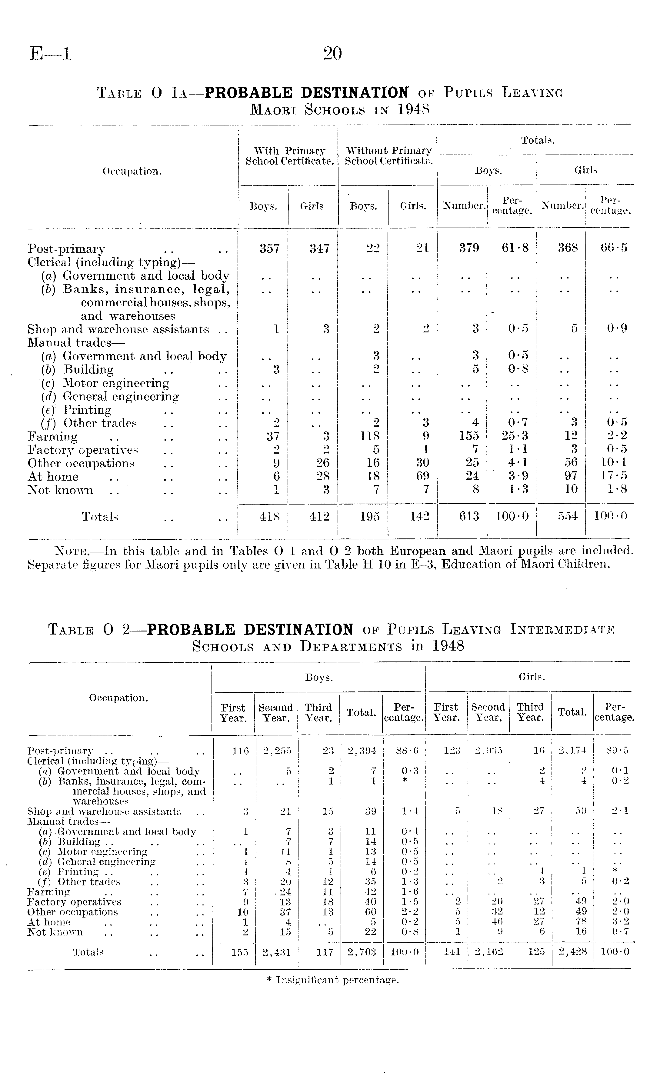 Occupation. With Primary School Certificate. Without Primary School Certificate. Totals. Boys. Girls Boys. Girls Boys. Girls. Number. Percentage. Number. Percentage. Post-primary Clerical (including typing)— (a) Government and local body (b) Banks, insurance, legal, commercial houses, shops, and warehouses Shop and warehouse assistants .. Manual trades — (a) Government and local body (b) Building (c) Motor engineering (d) General engineering (e)' Printing (/) Other trades Farming Factory operatives Other occupations At home Not known Totals 357 1 3 2 37 2 9 6 1 347 3 3 2 26 28 3 22 2 3 2 2 118 5 16 18 7 21 2 "3 9 1 30 69 7 379 3 3 5 4 155 7 25 24 8 61-8 0-5 0-5 0-8 0-7 25-3 1-1 4-1 3-9 1-3 368 5 "3 12 3 56 97 10 66-5 0-9 0-5 2-2 0-5 10-1 17-5 1-8 418 412 195 142 613 100-0 554 100-0 Note. —In this table and in Tables 0 1 and 0 2 both European and Maori pupils are included. Separate figures for Maori pupils only are given in Table H 10 in E-3, Education of Maori Children.