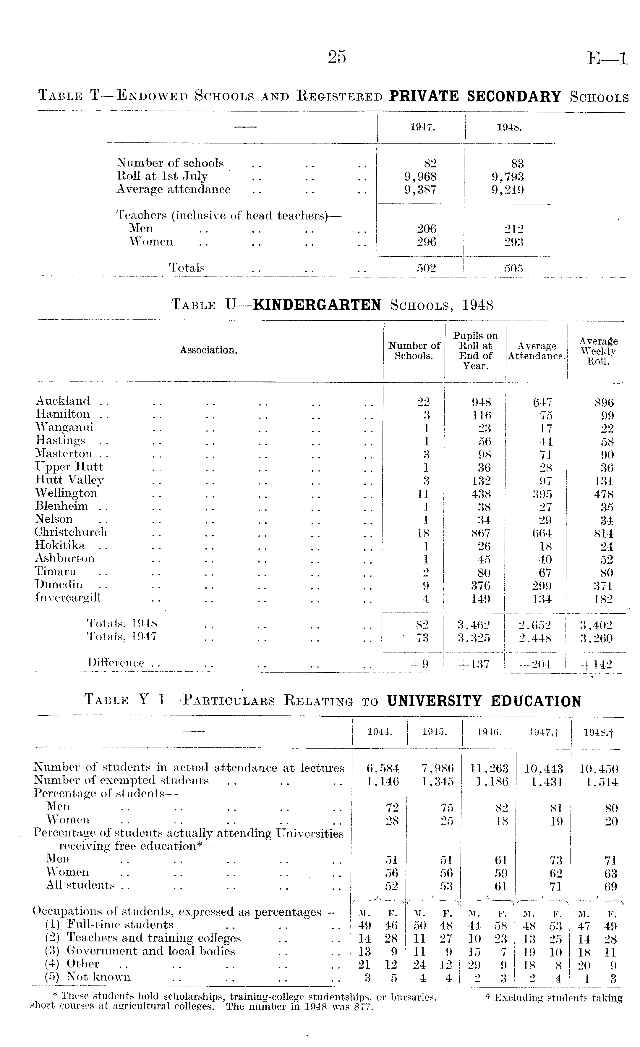— 1947. 1948. Number of schools 82 83 Roll at 1st July 9,968 9,793 Average attendance 9,387 9,219 Teachers (inclusive of head teachers) — Men 206 212 Women .. .. 296 293 Totals 502 505