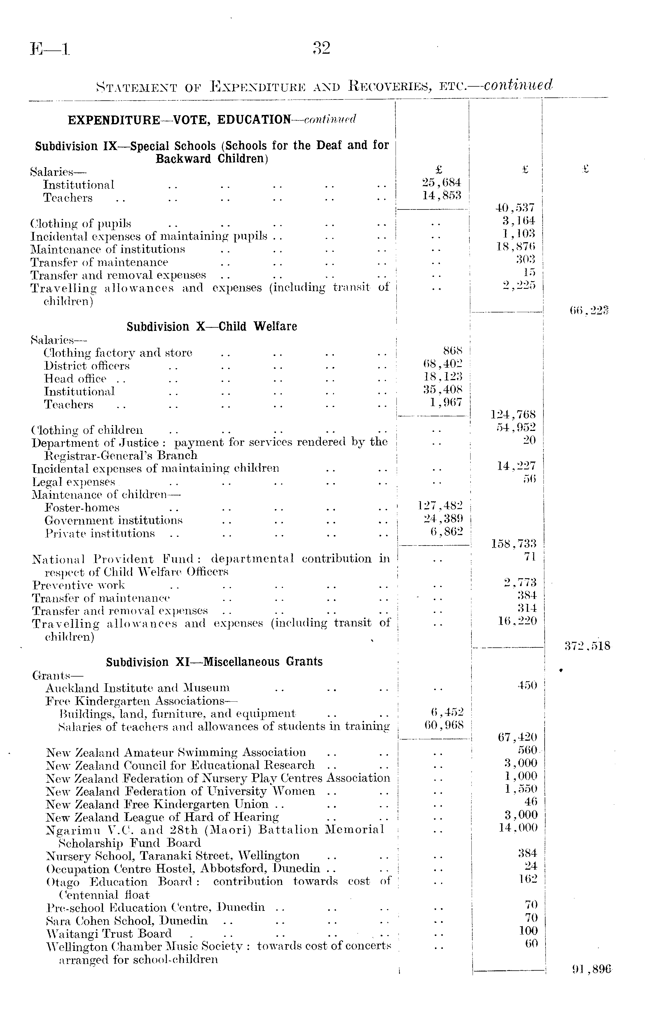 EXPENDITURE —VOTE, EDUCATION —continued Subdivision IX —Special Schools (Schools for the Deaf and for Backward Children) £ Salaries — £ £ Institutional 25,684 Teachers 14,853 40,537 Clothing of pupils 3,164 Incidental expenses of maintaining pupils 1,103 Maintenance of institutions 18,876 Transfer of maintenance 303 Transfer and removal expenses 15 Travelling allowances and expenses (including transit of 2,225 children) 66 223' Subdivision X—Child Welfare Salaries — Clothing factory and store 868 District officers 68,402 Head office 18,123 Institutional 35,408 Teachers 1,967 124,768 Clothing of children 54'952 Department of Justice : payment for services rendered by the 20 Registrar-General's Branch 14,227 Incidental expenses of maintaining children Legal expenses. 56 Maintenance of children—• Foster-homes 127,482 Government institutions .. 24,389 Private institutions .. 6,862 158,733 National Provident Fund : departmental contribution in 71 respect of Child Welfare Officers 2,773 Preventive work . . .. .. Transfer of maintenance .. 384 Transfer and removal expenses .. 314 Travelling allowances and expenses (including transit of 16,220 children) 372,518. Subdivision XI—Miscellaneous Grants Grants — 450 « Auckland Institute and Museum Free Kindergarten Associations — 6,452 Buildings, land, furniture, and equipment Salaries of teachers and allowances of students in training 60,968 67,420 New Zealand Amateur Swimming Association 560» New Zealand Council for Educational Research 3,000 New Zealand Federation of Nursery Play Centres Association 1,000 New Zealand Federation of University Women 1,550 New Zealand Free Kindergarten Union 46 New Zealand League of Hard of Hearing 3,000 Ngarimu V.C. and 28th (Maori) Battalion Memorial 14,000 Scholarship Fund Board 384 Nursery School, Taranaki Street, Wellington Occupation Centre Hostel, Abbotsford, Dunedin 24 Otago Education Board: contribution towards cost of 162 Centennial float 70 Pre-school Education Centre, Dunedin Sara Cohen School, Dunedin 70 Waitangi Trust Board . .. .. . - , . • 100 Wellington Chamber Music Society : towards cost of concerts 60 arranged for school-children | 91,896