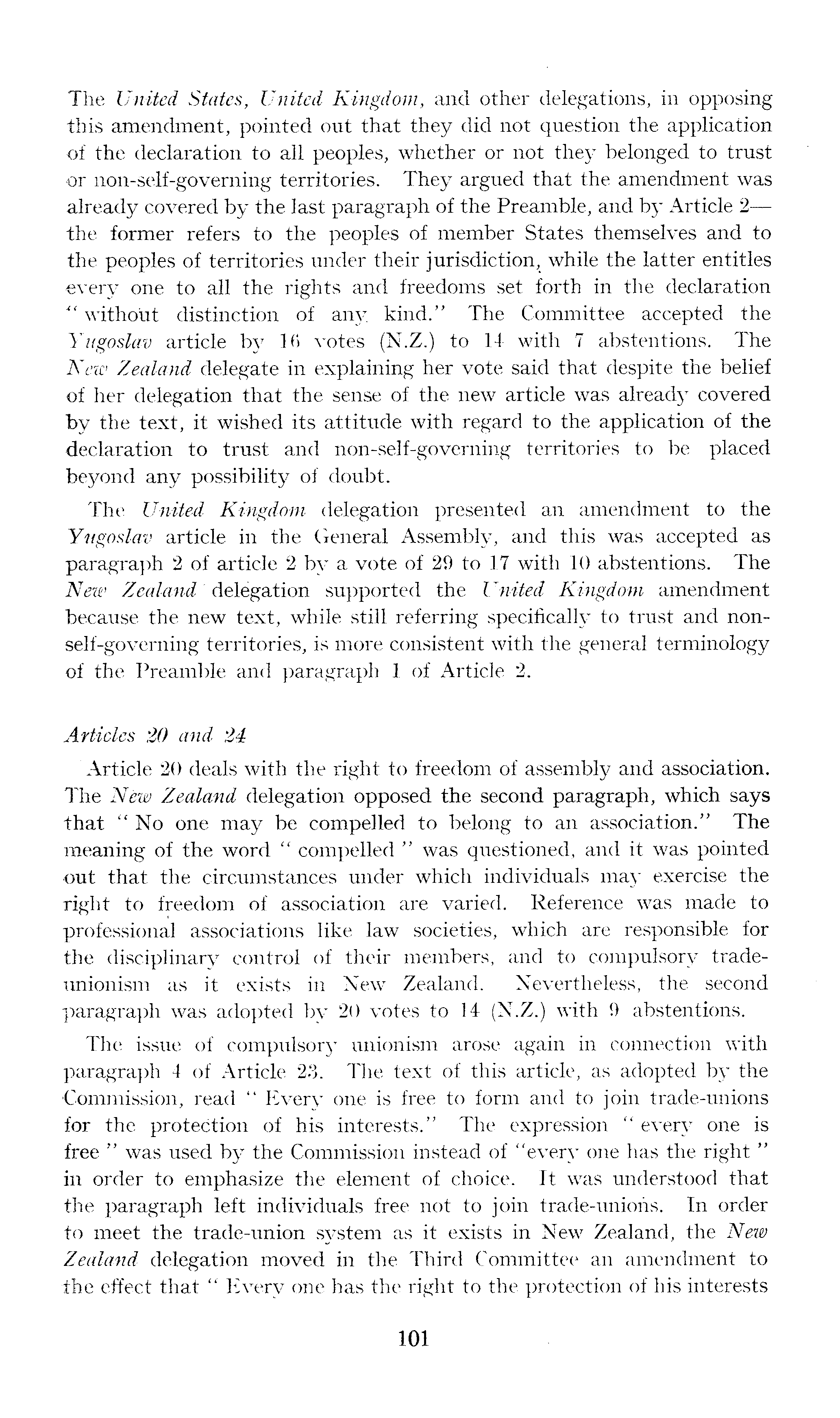 The United States, United Kingdom, and other delegations, in opposing this amendment, pointed out that they did not question the application of the declaration to all peoples, whether or not they belonged to trust or non-self-governing territories. They argued that the amendment was already covered by the last paragraph of the Preamble, and by Article 2 the former refers to the peoples of member States themselves and to the peoples of territories under their jurisdiction, while the latter entitles every one to all the rights and freedoms set forth in the declaration " without distinction of any kind." The Committee accepted the Yugoslav article by 16 votes (N.Z.) to 14 with 7 abstentions. The New Zealand delegate in explaining her vote said that despite the belief of her delegation that the sense of the new article was already covered by the text, it wished its attitude with regard to the application of the declaration to trust and non-self-governing territories to be placed beyond any possibility of doubt. The United Kingdom delegation presented an amendment to the Yugoslav article in the General Assembly, and this was accepted as paragraph 2of article 2by a vote of 29 to 17 with 10 abstentions. The New Zealand delegation supported the United Kingdom amendment because the new text, while still referring specifically to trust and non-self-governing territories, is more consistent with the general terminology of the Preamble and paragraph 1 of Article 2. Articles 20 and 24 Article 20 deals with the right to freedom of assembly and association. The New Zealand delegation opposed the second paragraph, which says that "No one may be compelled to belong to an association." The meaning of the word " compelled " was questioned, and it was pointed out that the circumstances under which individuals may exercise the right to freedom of association are varied. Reference was made to professional associations like law societies, which are responsible for the disciplinary control of their members, and to compulsory tradeunionism as it exists in New Zealand. Nevertheless, the second paragraph was adopted by 20 votes to 14 (N.Z.) with 9 abstentions. The issue of compulsory unionism arose again in connection with paragraph 4of Article 23. The text of this article, as adopted by the •Commission, read " Every one is free to form and to join trade-unions for the protection of his interests." The expression " every one is free " was used by the Commission instead of "every one has the right " in order to emphasize the element of choice. It was understood that the paragraph left individuals free not to join trade-unions. In order to meet the trade-union system as it exists in New Zealand, the New Zealand delegation moved in the Third Committee an amendment to the effect that " livery one has the right to the protection of his interests