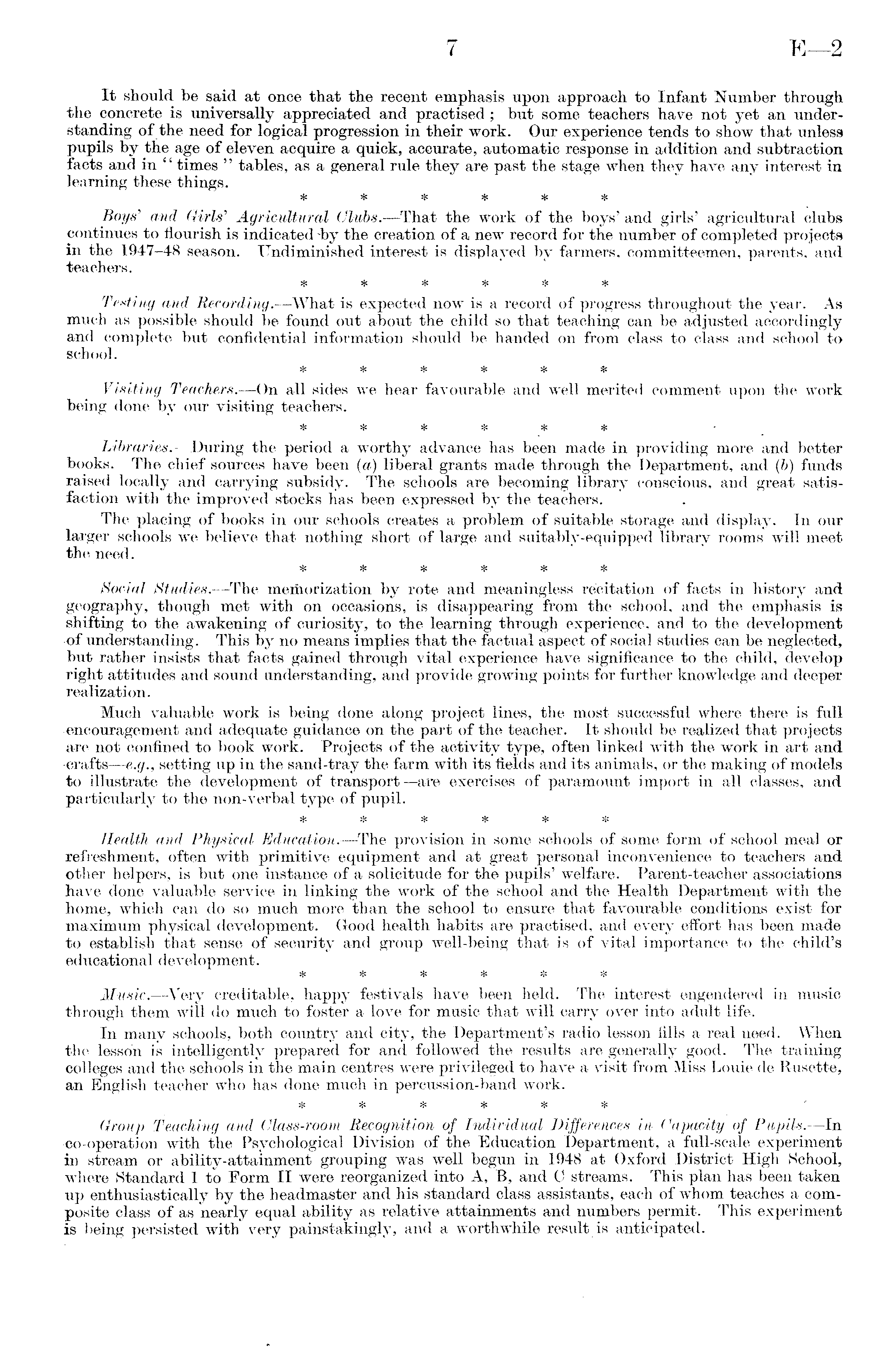 It should be said at once that the recent emphasis upon, approach to Infant Number through the concrete is universally appreciated and practised; but some teachers have not yet an understanding of the need for logical progression in their work. Our experience tends to show that unless pupils by the age of eleven acquire a quick, accurate, automatic response in addition and subtraction facts and in "times " tables, as a general rule they are past the stage when they have any interest in learning these things. ****** Boys' and Girls' Agricultural Clubs. —That the work of the boys' and girls' agricultural clubs continues to flourish is indicated-by the creation of a new record for the number of completed projects in the 1947-48 season. Undiminished interest is displayed by farmers, committeemen, parents, and teachers. ****** Testing and Recording.—What is expected now is a record of progress throughout the year. As much as possible should be found out about the child so that teaching can be adjusted accordingly and complete but confidential information should be handed on from class to class and school to school. ****** Visiting Teachers.—On all sides we hear favourable and well merited comment upon the work being done by our visiting teachers. * sic * * * * Libraries.—During the period a worthy advance has been made in providing more and better books. The chief sources have been (a) liberal grants made through the Department, and (b) funds raised locally and carrying subsidy. The schools are becoming library conscious, and great satisfaction with the improved stocks has been expressed by the teachers. The placing of books in our schools creates a problem of suitable storage and display. In our larger schools we believe that nothing short of large and suitably-equipped library rooms will meet the need. * * * * * * Social Studies. —The memorization by rote and meaningless recitation of facts in history and geography, though met with on occasions, is disappearing from the school, and the emphasis is shifting to the awakening of curiosity, to the learning through experience, and to the development of understanding. This by no means implies that the factual aspect of social studies can be neglected, but rather insists that facts gained through vital experience have significance to the child, develop right attitudes and sound understanding, and provide growing points for further knowledge and deeper realization. Much valuable work is being done along project lines, the most successful where there is full encouragement and adequate guidance on the part of the teacher. It should be realized that projects are not confined to book work. Projects of the activity type, often linked with the work in art and crafts—e.g., setting up in the sand-tray the farm with its fields and its animals, or the making of models to illustrate the development of transport—are exercises of paramount import in all classes, and particularly to the non-verbal type of pupil. ****** Health and Physical Education. —The provision in some schools of some form of school meal or refreshment, often with primitive equipment and at great personal inconvenience to teachers and other helpers, is but one instance of a solicitude for the pupils' welfare. Parent-teacher associations have done valuable service in linking the work of the school and the Health Department with the home, which can do so much more than the school to ensure that favourable conditions exist for maximum physical development. Good health habits are practised, and every effort has been made to establish that sense of security and group well-being that is of vital importance to the child's educational development. ****** Music. —Very creditable, happy festivals have been held. The interest engendered in music through them will do much to foster a love for music that will carry over into adult life. In many schools, both country and city, the Department's radio lesson fills a real need. When the lesson is intelligently prepared for and followed the results are generally good. The training colleges and the schools in the main centres were privileged to have a visit from Miss Louie de Rusette, an English teacher who has done much in percussion-band work. ****** Group Teaching and Class-room Recognition of Individual Differences in Capacity of Pupils.—ln -co-operation with the Psychological Division of the Education Department, a full-scale experiment in stream or ability-attainment grouping was well begun in 1948 at Oxford District High School, where Standard Ito Form II were reorganized into A, B, and C streams. This plan has been taken up enthusiastically by the headmaster and his standard class assistants, each of whom teaches a composite class of as nearly equal ability as relative attainments and numbers permit. This experiment is being persisted with very painstakingly, and a worthwhile result is anticipated.