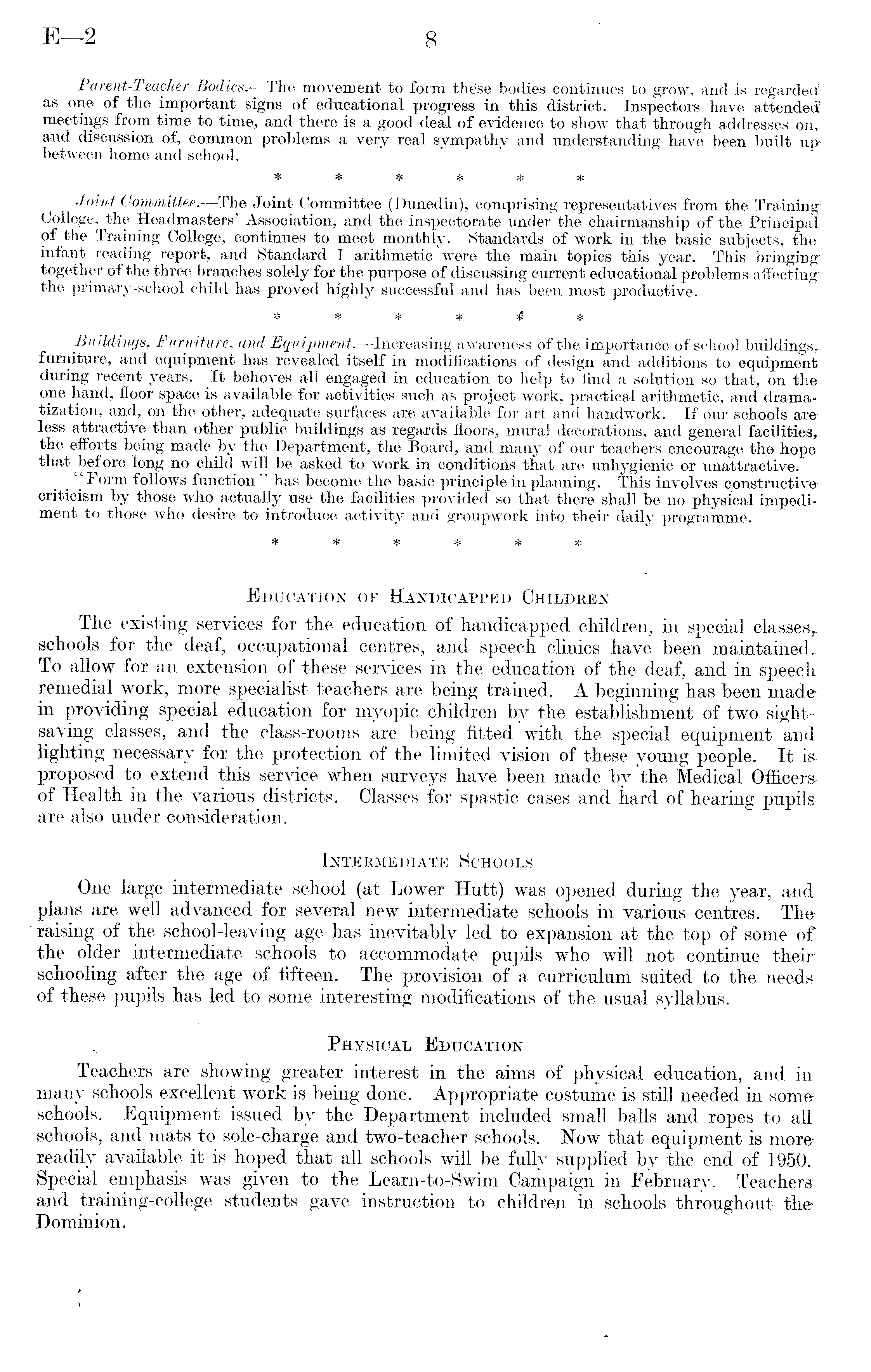Parent-Teacher Bodies. —The movement to form these bodies continues to grow, and is regarded as one of the important signs of educational progress in this district. Inspectors have attended meetings from time to time, and there is a good deal of evidence to show that through addresses on, and discussion of, common problems a very real sympathy and understanding have been built up between home and school. * * * * sjc sjs Joint Committee.—The Joint Committee (Dunedin), comprising representatives from the Training College, the Headmasters' Association, and the inspectorate under the chairmanship of the Principal of the Training College, continues to meet monthly. Standards of work in the basic subjects, the infant reading report, and Standard 1 arithmetic were the main topics this year. This bringing together of the three branches solely for the purpose of discussing current educational problems affecting the primary-school child has proved highly successful and has been most productive. ****£* Buildings, Furniture, and Equipment.—lncreasing awareness of the importance of school buildings,, furniture, and equipment has revealed itself in modifications of design and additions to equipment during recent years. It behoves all engaged in education to help to find a solution so that, on the one hand, floor space is available for activities such as project work, practical arithmetic, and dramatization, and, on the other, adequate surfaces are available for art and handwork. If our schools areless attractive than other public buildings as regards floors, mural decorations, and general facilities, the efforts being made by the Department, the Board, and many of our teachers encourage the hope that before long no child will be asked to work in conditions that are unhygienic or unattractive. " Form follows function " has become the basic principle in planning. This involves constructivecriticism by those who actually use the facilities provided so that there shall be no physical impediment to those who desire to introduce activity and groupwork into their daily programme. ****** Education op Handicapped Children The existing services for the education of handicapped children, in special classes,, schools for the deaf, occupational centres, and speech clinics have been maintained. To allow for an extension of these services in the education of the deaf, and in speech remedial work, more specialist teachers are being trained. A beginning has been made in providing special education for myopic children by the establishment of two sightsaving classes, and the class-rooms are being fitted with the special equipment and lighting necessary for the protection of the limited vision of these young people. It isproposed to extend this service when surveys have been made by the Medical Officers of Health in the various districts. Classes for spastic cases and hard of hearing pupilsare also under consideration. Intermediate Schools One large intermediate school (at Lower Hutt) was opened during the year, and plans are well advanced for several new intermediate schools in various centres. The raising of the school-leaving age has inevitably led to expansion at the top of some of the older intermediate schools to accommodate pupils who will not continue their schooling after the age of fifteen. The provision of a curriculum suited to the needs, of these pupils has led to some interesting modifications of the usual syllabus. Physical Education Teachers are showing greater interest in the aims of physical education, and in many schools excellent work is being done. Appropriate costume is still needed in some schools. Equipment issued by the Department included small balls and ropes to all schools, and mats to sole-charge and two-teacher schools. Now that equipment is more readily available it is hoped that all schools will be fully supplied by the end of 1950. Special emphasis was given to the Learn-to-Swim Campaign in February. Teachers and training-college students gave instruction to children in schools throughout the Dominion.