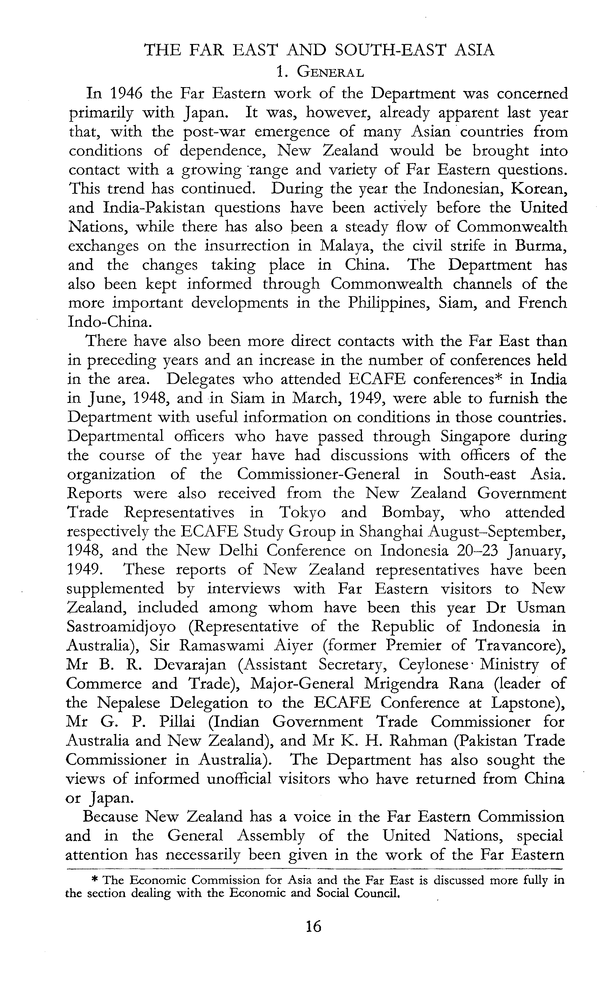 THE FAR EAST AND SOUTH-EAST ASIA 1. General In 1946 the Far Eastern work of the Department was concerned primarily with Japan. It was, however, already apparent last year that, with the post-war emergence of many Asian countries from conditions of dependence, New Zealand would be brought into contact with a growing range and variety of Far Eastern questions. This trend has continued. During the year the Indonesian, Korean, and India-Pakistan questions have been actively before the United Nations, while there has also been a steady flow of Commonwealth exchanges on the insurrection in Malaya, the civil strife in Burma, and the changes taking place in China. The Department has also been kept informed through Commonwealth channels of the more important developments in the Philippines, Siam, and French Indo-China. There have also been more direct contacts with the Far East than in preceding years and an increase in the number of conferences held in the area. Delegates who attended ECAFE conferences* in India in June, 1948, and in Siam in March, 1949, were able to furnish the Department with useful information on conditions in those countries. Departmental officers who have passed through Singapore during the course of the year have had discussions with officers of the organization of the Commissioner-General in South-east Asia. Reports were also received from the New Zealand Government Trade Representatives in Tokyo and Bombay, who attended respectively the ECAFE Study Group in Shanghai August-September, 1948, and the New Delhi Conference on Indonesia 20-23 January, 1949. These reports of New Zealand representatives have been supplemented by interviews with Far Eastern visitors to New Zealand, included among whom have been this year Dr Usman Sastroamidjoyo (Representative of the Republic of Indonesia in Australia), Sir Ramaswami Aiyer (former Premier of Travancore), Mr B. R. Devarajan (Assistant Secretary, Ceylonese* Ministry of Commerce and Trade), Major-General Mrigendra Rana (leader of the Nepalese Delegation to the ECAFE Conference at Lapstone), Mr G. P. Pillai (Indian Government Trade Commissioner for Australia and New Zealand), and Mr K. H. Rahman (Pakistan Trade Commissioner in Australia). The Department has also sought the views of informed unofficial visitors who have returned from China or Japan. Because New Zealand has a voice in the Far Eastern Commission and in the General Assembly of the United Nations, special attention has necessarily been given in the work of the Far Eastern