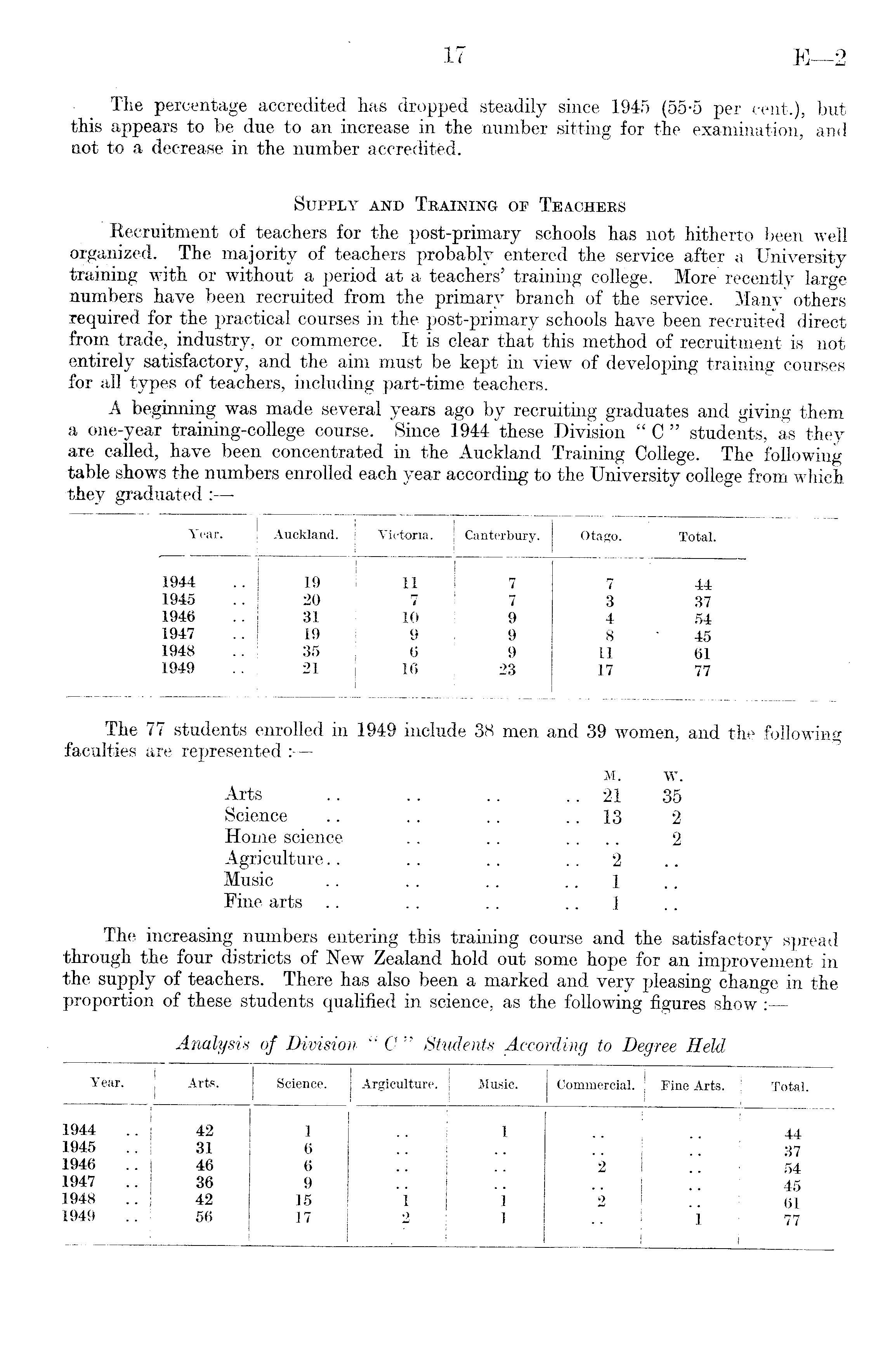 The 77 students enrolled in 1949 include 38 men and 39 women, and the following faculties are represented :■ — M. W. Arts .. .. .. .. 21 35 Science .. .. .. 13 2 Home science .. .. .... 2 Agriculture.. .. .. 2 Music .. .. .. 1 Fine arts .. .. .. 1 The increasing numbers entering this training course and the satisfactory spread through the four districts of New Zealand hold out some hope for an improvement in supply of teachers. There has also been a marked and very pleasing change in the proportion of these students qualified in science, as the following figures show :