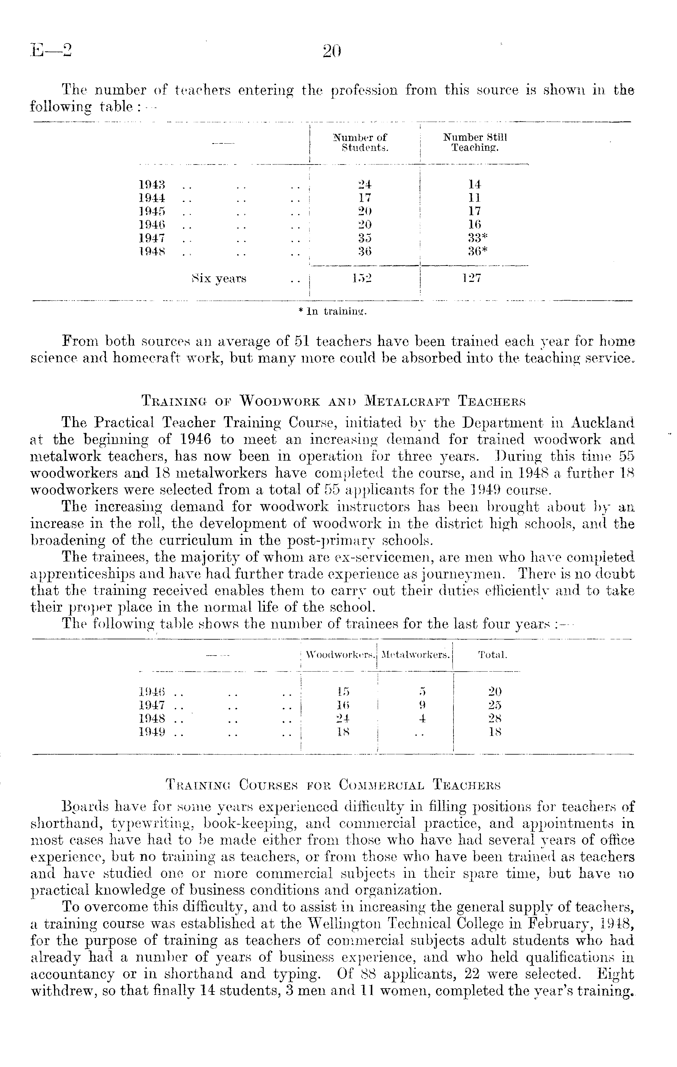 From both sources an average of 51 teachers have been trained each year for homescience and homecraft work, but many more could be absorbed into the teaching service. Training of Woodwork and Metalcraft Teachers The Practical Teacher Training Course, initiated by the Department in Auckland at the beginning of 1946 to meet an increasing demand for trained woodwork and metalwork teachers, has now been in operation for three years. During this time 55 woodworkers and 18 metalworkers have completed the course, and in 1948 a further 18 woodworkers were selected from a total of 55 applicants for the 1949 course. The increasing demand for woodwork instructors has been brought about by an increase in the roll, the development of woodwork in the district high schools, and the broadening of the curriculum in the post-primary schools. The trainees, the majority of whom are ex-servicemen, are men who have completed apprenticeships and have had further trade experience as journeymen. There is no doubt that the training received enables them to carry out their duties efficiently and to take their proper place in the normal life of the school.