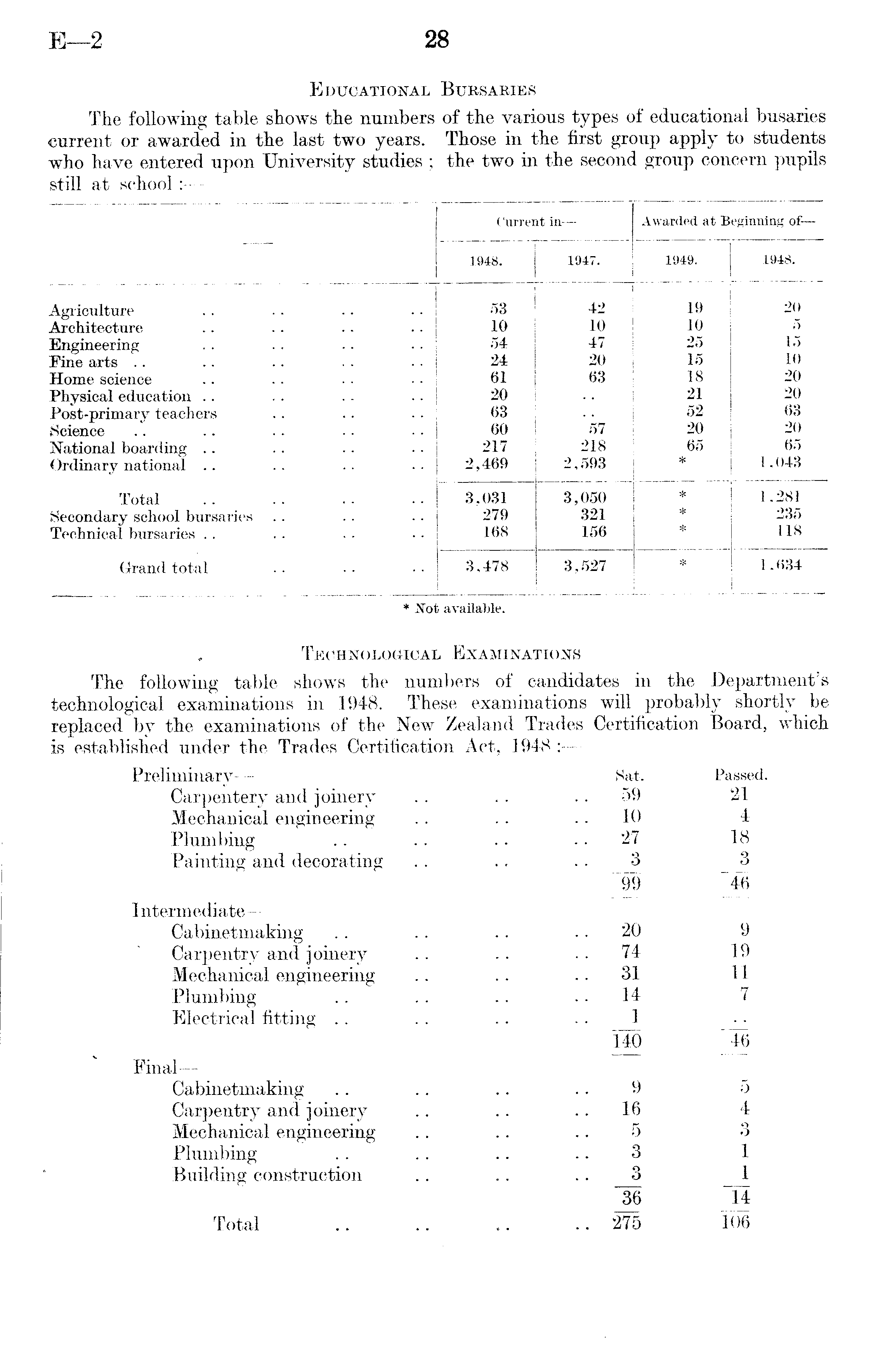 Current in— Awarded at Beginning of— 1948. 1947. 1949. 1948. Agriculture .. ■. 53 i 42 19 20 Architecture 10 10 10 5 Engineering 54 47 25 15 10 Fine arts 24 20 15 Home science 61 63 18 20 Physical education 20 21 20 Post-primary teachers 63 52 63 ' Science 60 57 20 20 National boarding 217 218 65 65 Ordinary national .. 2,469 2,593 ** 1,043 Total 3,031 3,050 * 1,281 Secondary school bursaries 279 321 * 235 Technical bursaries 168 156 * 118 Grand total 3,478 1 3,527 * 1,634 * Not available.
