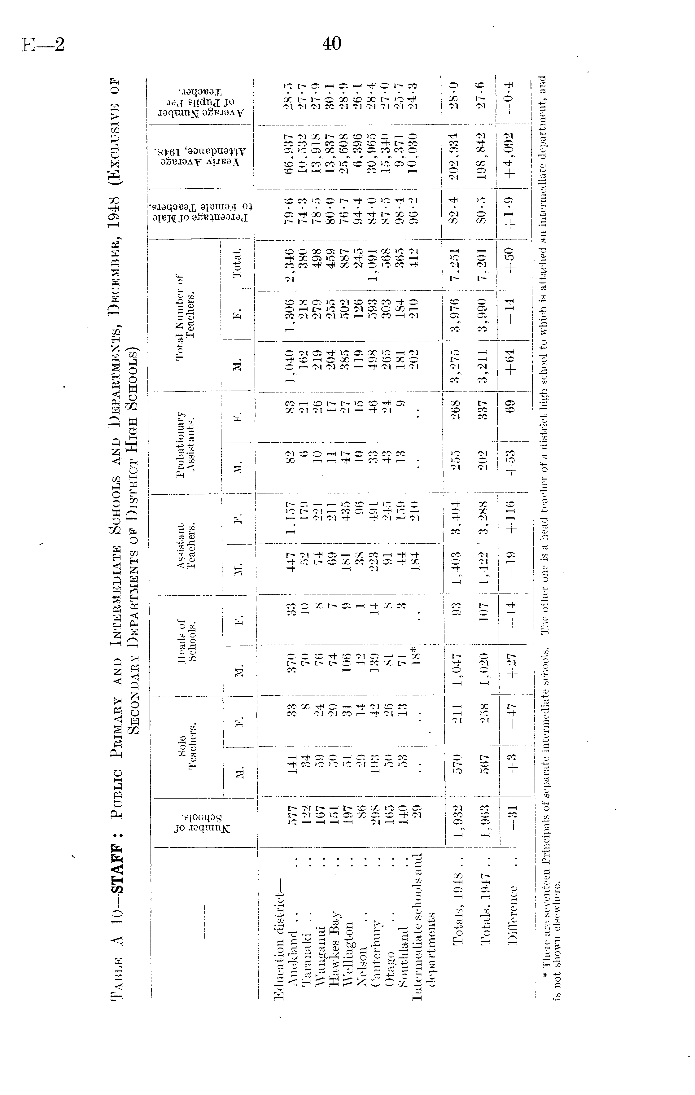 umber of Schools. Sole Teachers. Heads of Schools. Assistant Teachers. Probationary Assistants. Total Nlimber of Teachers. £ 2 C3 0> « o *S2 <x>\ H SPs a g g Yearly Average Attendance, 1948. rage Number Pupils Per Teacher. K M. F. M. F. M. F. M. F. M. F. Total. o «> S-t <12 0*0 0) <4-4 > o < Education district — Auckland Taranaki Wanganui Hawkes Bay • .. Wellington Nelson Canterbury Otago Southland Intermediate schools and departments 577 122 167 151 197 86 298 165 140 29 141 34 59 50 51 29 103 50 53 33 8 24 20 31 14 42 26 13 370 70 76 74 106 42 139 81 71 18* 33 10 8 7 9 1 14 8 3 447 52 74 69 181 38 223 91 44 184 1,157 179 221 211 435 96 491 245 159 210 82 6 10 11 47 10 33 43 13 83 21 26 17 27 15 46 24 9 1,040 162 219 204 385 119 498 265 181 202 1,306 218 279 255 502 126 593 303 184 210 2,346 380 498 459 887 245 1,091 568 365 412 79-6 74-3 78-5 80-0 76-7 94-4 84-0 87-5 98-4 96-2 66,937 10,532 13,918 13,837 25,608 6,396 30,965 15,340 9,371 10,030 28-5 27-7 27-9 30-1 28-9 26-1 28-4 27-0 25-7 24-3 Totals, 1948 .. 1,932 570 211 1,047 93 1,403 3,404 255 268 3,275 3,976 7,251 82-4 202,934 28-0 Totals, 1947 .. 1,963 567 258 1,020 107 1,422 3,288 202 337 3,211 3,990 7,201 80-5 198,842 27-6 Difference -31 +3 -47 +27 -14 -19 + 116 +53 -69 +64 -14 + 50 + 1-9 +4,092 + 0-4 * There are seventeen Principals of separate intermediate schools, is not shown elsewhere. The other one is a head teacher of a district high school to which is attached an intermediate department, and