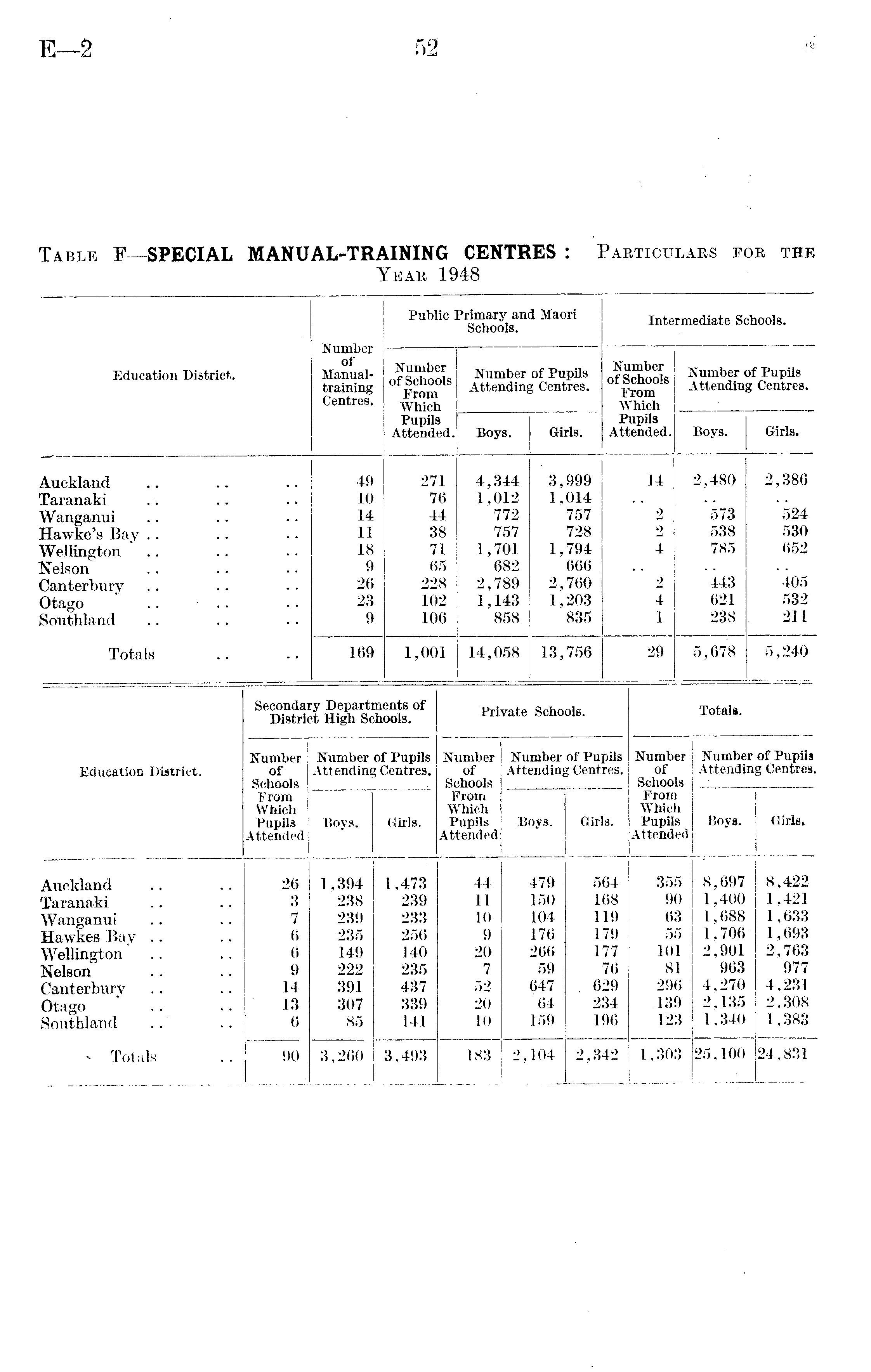 Education District. Number of Manualtraining Centres. Public Primary and Maori Schools. Intermediate Schools. Number of Schools Prom Which Pupils Attended. Number of Pupils Attending Centres. Number of Schools From Which Pupils Attended. Number of Pupils Attending Centres. Boys. Girls. Boys. Girls. Auckland Taranaki .. Wanganui Hawke's Bay Wellington Nelson Canterbury Otago .. Southland Totals 49 10 14 11 18 9 26 23 9 271 76 44 38 71 65 228 102 106 4,344 1,012 772 757 1,701 682 2,789 1,143 858 3,999 1,014 757 728 1,794 666 2,760 1,203 835 14 2 2 4 2 ' 4 1 2,480 573 538 785 443 621 238 2,386 524 530 652 405 532 211 169 1,001 14,058 13,756 29 5,678 5,240 Education District. Secondary Departments of District High Schools. Private Schools. Total#. Number of Schools From Which Pupils Attended Number of Pupils Attending Centres. Number of Schools From Which Pupils Attended Number of Pupils Attending Centres. Number of Schools From Which Pupils Attended Number of Pupils Attending Centres. Boys. Girls. Boys. Girls. Boys. Girls. Auckland 26 1,394 1,473 44 479 564 355 8,697 8,422 Taranaki 3 238 239 11 150 168 90 1,400 1.421 Wanganui 7 239 233 10 104 119 63 1,688 1,633 Hawkes Bay 6 235 256 9 176 179 55 1,706 1,693 Wellington 6 149 140 20 266 177 101 2,901 2,763 Nelson 9 222 235 7 59 76 81 963 977 Canterbury 14 391 437 52 647 629 296 4,270 4,231 Otago 13 307 339 20 64 234 139 2,135 2,308 Southland 6 85 141 10 159 196 123 1,340 1,383 * Totals 90 3,260 3,493 183 2 104 2,342 1,303 25,100 24,831