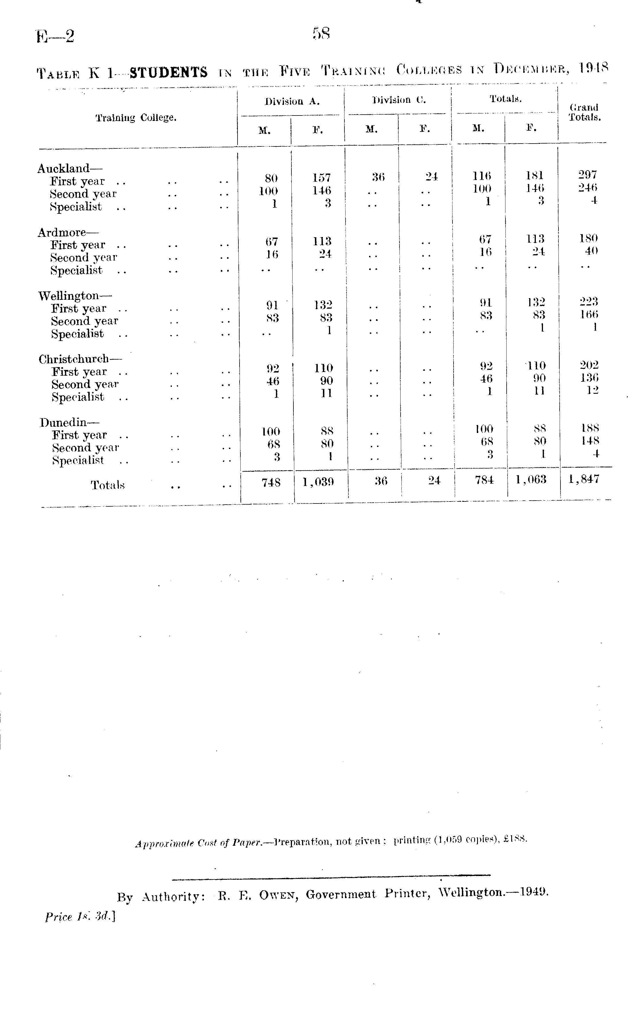 Training College. Division A. Division C. Totals. Grand M. F. M. F. M. Totals. Auckland — First year Second year Specialist 80 100 1 157 146 3 36 24 116 100 1 181 146 3 297 246 4 Ardmore — First year .. Second year Specialist 67 16 113 24 67 16 113 24 180 40 Wellington— First year Second year Specialist .. 91 83 132 83 1 91 83 132 . 83 1 223 166 1 Christchurch — First year Second year Specialist 92 46 1 110 90 11 92 46 1 110 90 11 202 136 12 Dunedin — First year Second year Specialist 100 68 3 88 80 1 100 68 3 88 80 1 188 148 4 Totals 748 1,039 36 24 784 1,063 1,847