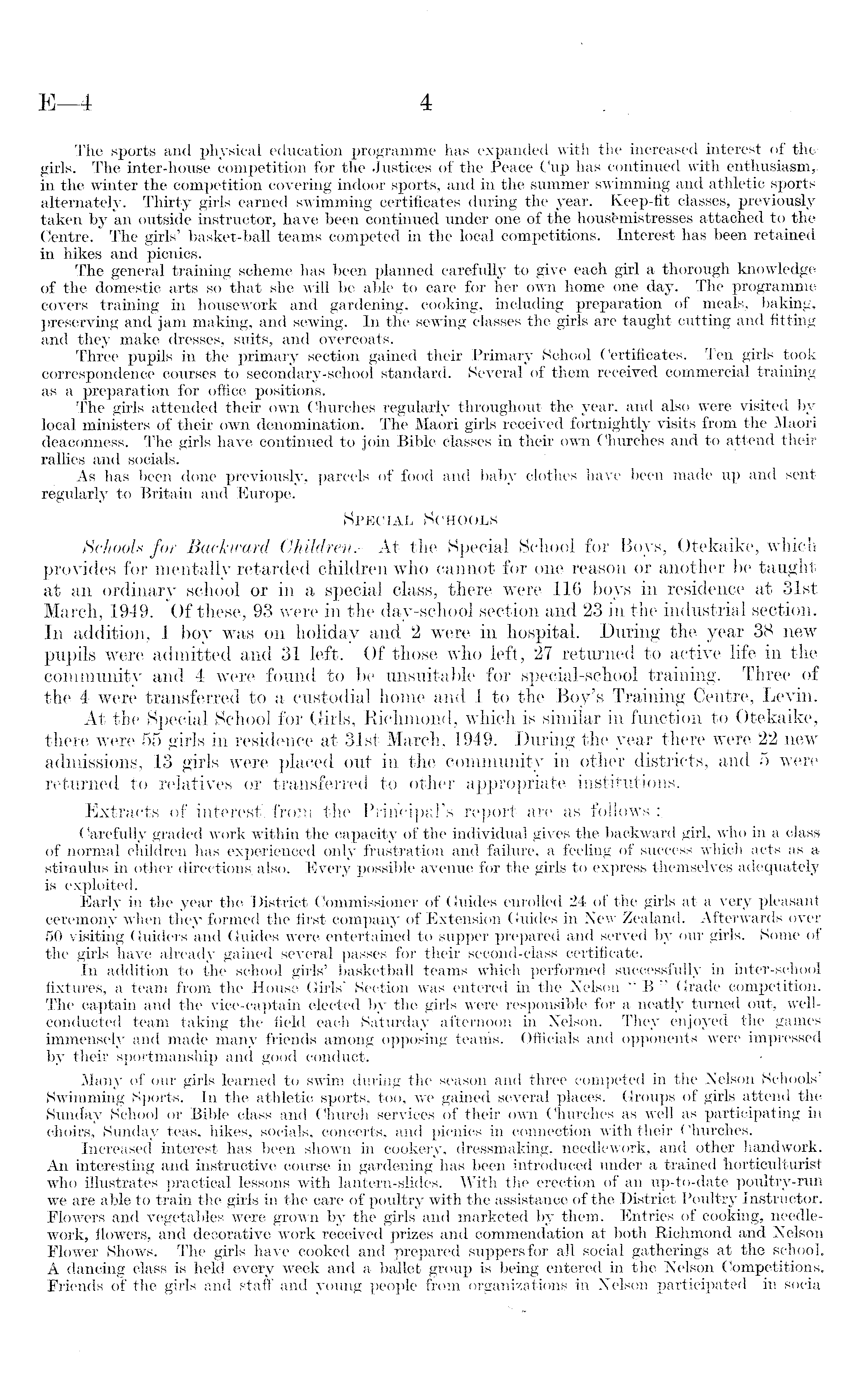 The sports and physical education programme has expanded with the increased interest of the girls. The inter-house competition for the Justices of the Peace Cup has continued with enthusiasm r in the winter the competition covering indoor sports, and in the summer swimming and athletic sports alternately. Thirty girls earned swimming certificates during the year. Keep-fit classes, previously taken by an outside instructor, have been continued under one of the housfemistresses attached to the Centre. The girls' basket-ball teams competed in the local competitions. Interest has been retained in hikes and picnics. The general training scheme has been planned carefully to give each girl a thorough knowledge of the domestic arts so that she will be able to care for her own home one day. The programme covers training in housework and gardening, cooking, including preparation of meals, baking, preserving and jam making, and sewing. In the sewing classes the girls are taught cutting and fitting and they make dresses, suits, and overcoats. Three pupils in the primary section gained their Primary School Certificates. Ten girls took correspondence courses to secondary-school standard. Several of them received commercial training as a preparation for office positions. The girls attended their own Churches regularly throughout the year, and also were visited by local ministers of their own denomination. The Maori girls received fortnightly visits from the Maori deaconness. The girls have continued to join Bible Classes in their own Churches and to attend their rallies and socials. As has been done previously, parcels of food and baby clothes have been made up and sent regularly to Britain and Europe. Special Schools Schools for Backward Children. —At the Special School for Boys, Otekaike, which provides for mentally retarded children who cannot for one reason or another be taught at an ordinary school or in a special class, there were 116 boys in residence at 31st March, 1949. Of these, 93 were in the day-school section and 23 in the industrial section. In addition, 1 boy was on holiday and 2 were in hospital. During the year 38 new pupils were admitted and 31 left. Of those who left, 27 returned to active life in the community and 4 were found to be unsuitable for special-school training. Three of the 4 were transferred to a custodial home and 1 to the Boy's Training Centre, Levin. At the Special School for Girls, Richmond, which is similar in function to Otekaike, there were 55 girls in residence at 31st March, 1949. During the year there were 22 new admissions, 13 girls were placed out in the community in other districts, and 5 were returned to relatives or transferred to other appropriate institutions. Extracts of interest, from the Principal's report are as follows : Carefully graded work within the capacity of the individual gives the backward girl, who in a class of normal children has experienced only frustration and failure, a feeling of success which acts as a stimulus in other directions also. Every possible avenue for the girls to express themselves adequately is exploited. Early in the year the District Commissioner of Guides enrolled 24 of the girls at a very pleasant ceremony when they formed the first company of Extension Guides in New Zealand. Afterwards over 50 visiting Guiders and Guides were entertained to supper prepared and served by our girls. Some of the girls have already gained several passes for their second-class certificate. In addition to the school girls' basketball teams which performed successfully in inter-school fixtures, a team from the House Girls' Section was entered in the Nelson " B " Grade competition. The captain and the vice-captain elected by the girls were responsible for a neatly turned out, wellconducted team taking the field each Saturday afternoon in Nelson. They enjoyed the games immensely and made many friends among opposing teams. Officials and opponents were impressed by their sportmanship and good conduct. Many of our. girls learned to swim during the season and three competed in the Nelson Schools' Swimming Sports. In the athletic sports, too, we gained several places. Groups of girls attend the Sunday School or Bible class and Church services of their own Churches as well as participating in choirs, Sunday teas, hikes, socials, concerts, and picnics in connection with their Churches. Increased interest has been shown in cookery, dressmaking, needlework, and other handwork. An interesting and instructive course in gardening has been introduced under a trained horticulturist who illustrates practical lessons with lantern-slides. With the erection of an up-to-date poultry-run we are able to train the girls in the care of poultry with the assistance of the District Poultry Instructor. Flowers and vegetables were grown by the girls and marketed by them. Entries of cooking, needlework, flowers, and decorative work received prizes and commendation at both Richmond and Nelson Flower Shows. The girls have cooked and prepared suppers for all social gatherings at the school. A dancing class is held every week and a ballet group is being entered in the Nelson Competitions. Friends of the girls and staff and young people from organizations in Nelson participated in socia