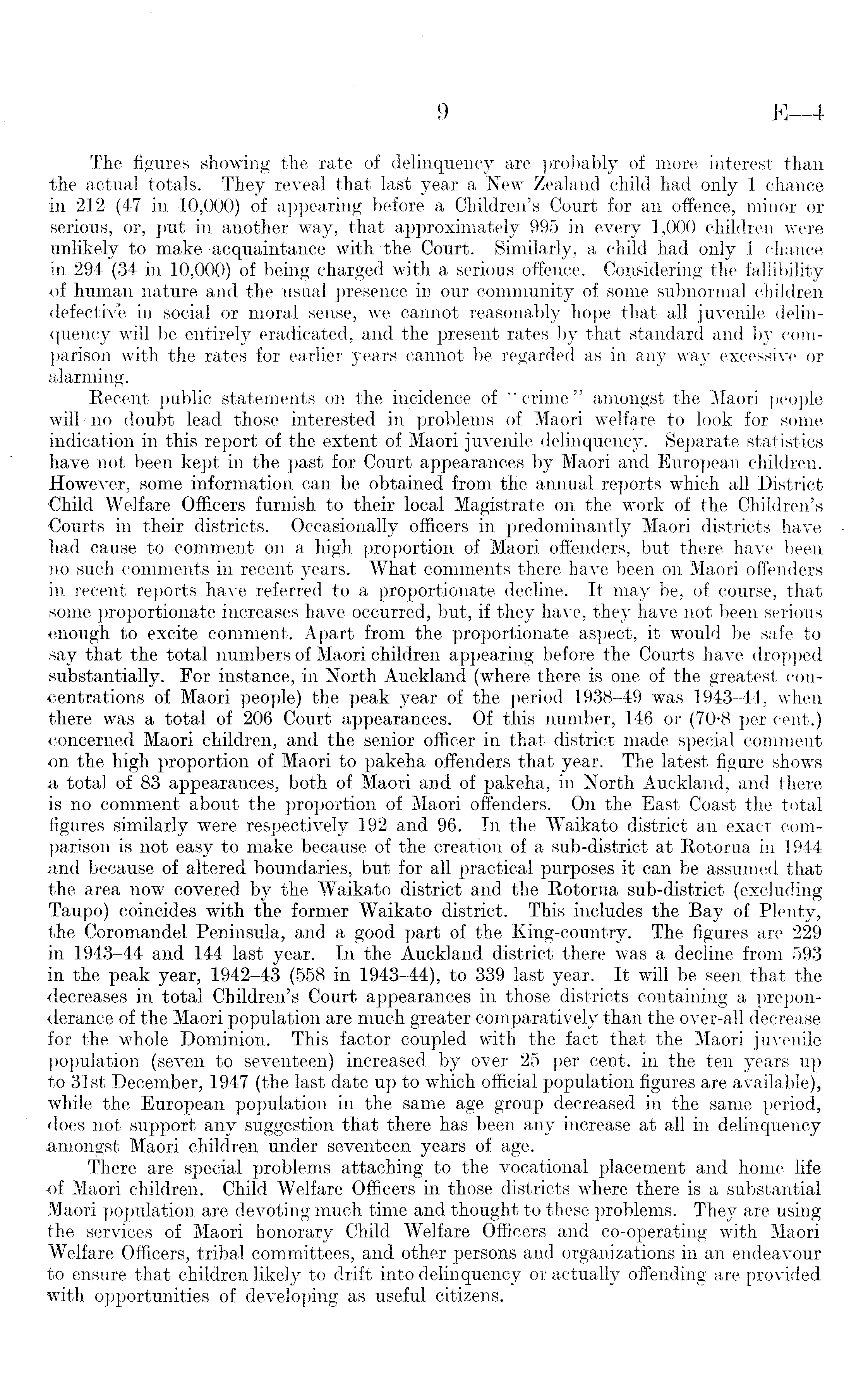 The figures showing the rate of delinquency are probably of more interest than the actual totals. They reveal that last year a New Zealand child had only 1 chance in 212 (47 in 10,000) of appearing before a Children's Court for an offence, minor or serious, or, put in another way, that approximately 995 in every 1,000 children were unlikely to make acquaintance with the Court. Similarly, a child had only 1 chance in 294 (34 in 10,000) of being charged with a serious offence. Considering the fallibility of human nature and the usual presence in our community of some subnormal children defective in social or moral sense, we cannot reasonably hope that all juvenile delinquency will be entirely eradicated, and the present rates by that standard and by comparison with the rates for earlier years cannot be regarded as in any way excessive or alarming. Recent public statements on the incidence of " crime " amongst the Maori people will no doubt lead those interested in problems of Maori welfare to look for some indication in this report of the extent of Maori juvenile delinquency. Separate statistics have not been kept in the past for Court appearances by Maori and European children. However, some information can be obtained from the annual reports which all District Child Welfare Officers furnish to their local Magistrate on the work of the Children's Courts in their districts. Occasionally officers in predominantly Maori districts have had cause to comment on a high proportion of Maori offenders, but there have been no such comments in recent years. What comments there have been on Maori offenders in recent reports have referred to a proportionate decline. It may be, of course, that some proportionate increases have occurred, but, if they have, they have not been serious enough to excite comment. Apart from the proportionate aspect, it would be safe to say that the total numbers of Maori children appearing before the Courts have dropped substantially. For instance, in North Auckland (where there is one of the greatest concentrations of Maori people) the peak year of the period 1938-49 was 1943-44, when there was a total of 206 Court appearances. Of this number, 146 or (70-8 per cent.) concerned Maori children, and the senior officer in that district made special comment on the high proportion of Maori to pakeha offenders that year. The latest figure shows a total of 83 appearances, both of Maori and of pakeha, in Norfch Auckland, and there is no comment about the proportion of Maori offenders. On the East Coast the total figures similarly were respectively 192 and 96. In the Waikato district an exact comparison is not easy to make because of the creation of a sub-district at Rotorua in 1944 and because of altered boundaries, but for all practical purposes it can be assumed that the area now covered by the Waikato district and the Rotorua sub-district (excluding Taupo) coincides with the former Waikato district. This includes the Bay of Plenty, the Coromandel Peninsula, and a good part of the King-country. The figures are 229 in 1943-44 and 144 last year. In the Auckland district there was a decline from 593 in the peak year, 1942-43 (558 in 1943-44), to 339 last year. It will be seen that the decreases in total Children's Court appearances in those districts containing a preponderance of the Maori population are much greater comparatively than the over-all decrease for the whole Dominion. This factor coupled with the fact that the Maori juvenile population (seven to seventeen) increased by over 25 per cent, in the ten years up to 31 st December, 1947 (the last date up to which official population figures are available), while the European population in the same age group decreased in the same period, does not support any suggestion that there has been any increase at all in delinquency amongst Maori children under seventeen years of age. There are special problems attaching to the vocational placement and home life of Maori children. Child Welfare Officers in those districts where there is a substantial Maori population are devoting much time and thought to these problems. They are using the services of Maori honorary Child Welfare Officers and co-operating with Maori Welfare Officers, tribal committees, and other persoiis and organizations in an endeavour to ensure that children likely to drift into delinquency or actually offending are provided with opportunities of developing as useful citizens.