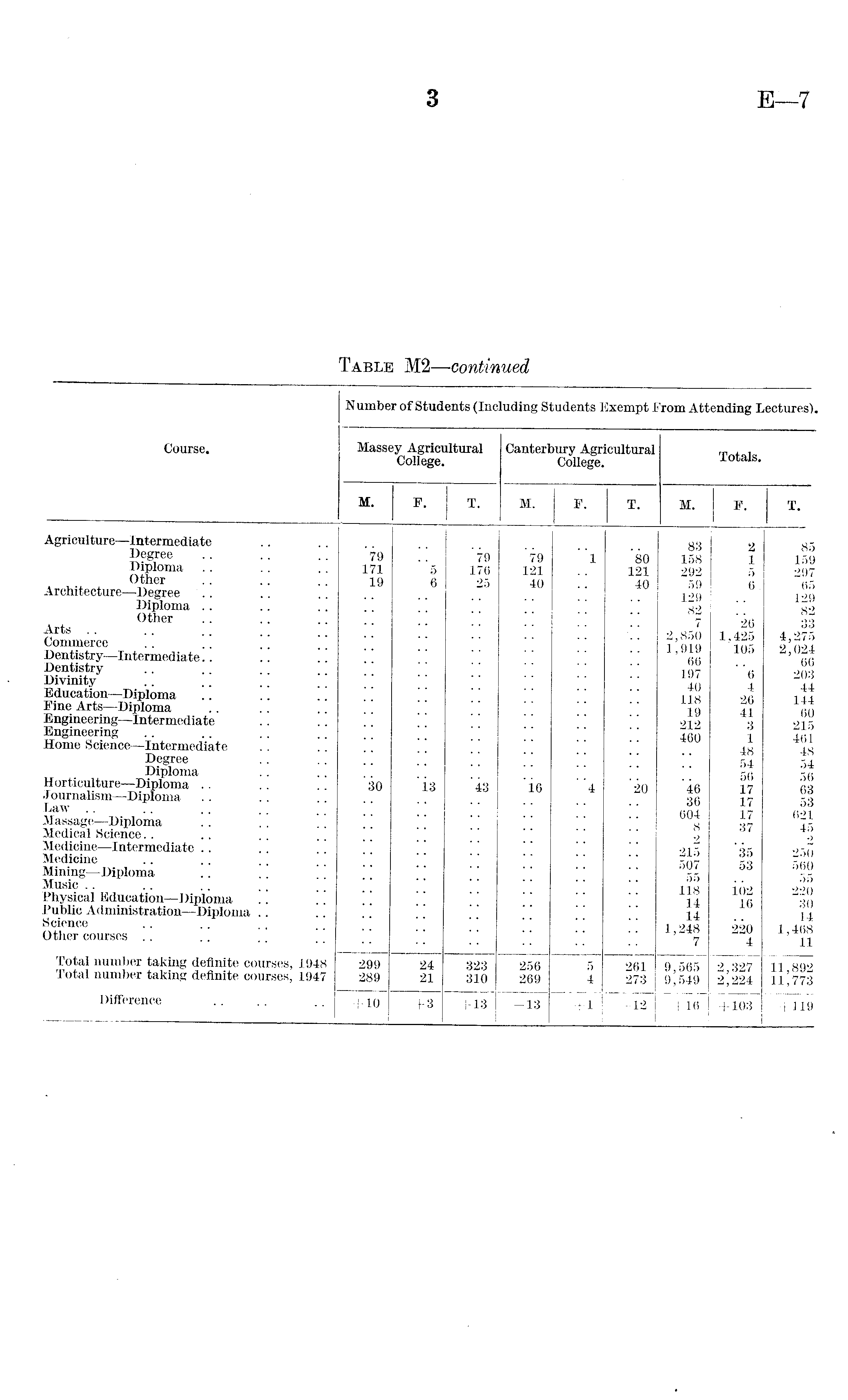 Course. N umber of Students (Including Students Exempt Prom Attending Lectures). Massey Agricultural College. Canterbury Agricultural College. Totals. M. P. T. M. P. T. M. P. T. Agriculture—Intermediate Degree Diploma Other Architecture—Degree Diploma Other Arts Commerce .. .. .' ] ] Dentistry—Intermediate.. .. !! Dentistry Divinity .. .. .. '' Education—Diploma .. .. ! i Pine Arts—Diploma Engineering—Intermediate .. !! Engineering Home Science—Intermediate Degree Diploma Horticulture—Diploma Journalism—Diploma .. .. Law Massage—Diploma .. .. Medical Science Medicine—Intermediate .. .. '' Medicine .. .. .. | ] Mining—Diploma .. " Music Physical Education—Diploma !! . Public Administration—Diploma Science Other courses .. .. .. '' Total number taking definite courses, 1948 Total number taking definite courses, 1947 79 171 19 30 5 6 i3 '79 176 25 '43 79 121 40 "i6 1 ' 4 '80 121 40 20 83 158 292 59 129 82 7 2,850 1,919 66 197 40 118 19 212 460 46 36 604 8 2 215 507 55 118 14 14 1,248 7 2 1 5 6. 26 1,425 105 "6 4 26 41 3 1 48 54 56 17 17 17 37 35 53 io2 16 220 4 85 159 297 65 129 82 33 4,275 2,024 66 203 44 144 60 215 461 48 54 56 63 53 621 45 2 250 560 55 220 30 14 1,468 11 299 289 24 21 323 310 256 269 5 4 261 273 9,565 9,549 2,327 2,224 11,892 11,773 Difference + 10 + 3 + 13 -13 + 1 -12 + 16 + 103 + 119