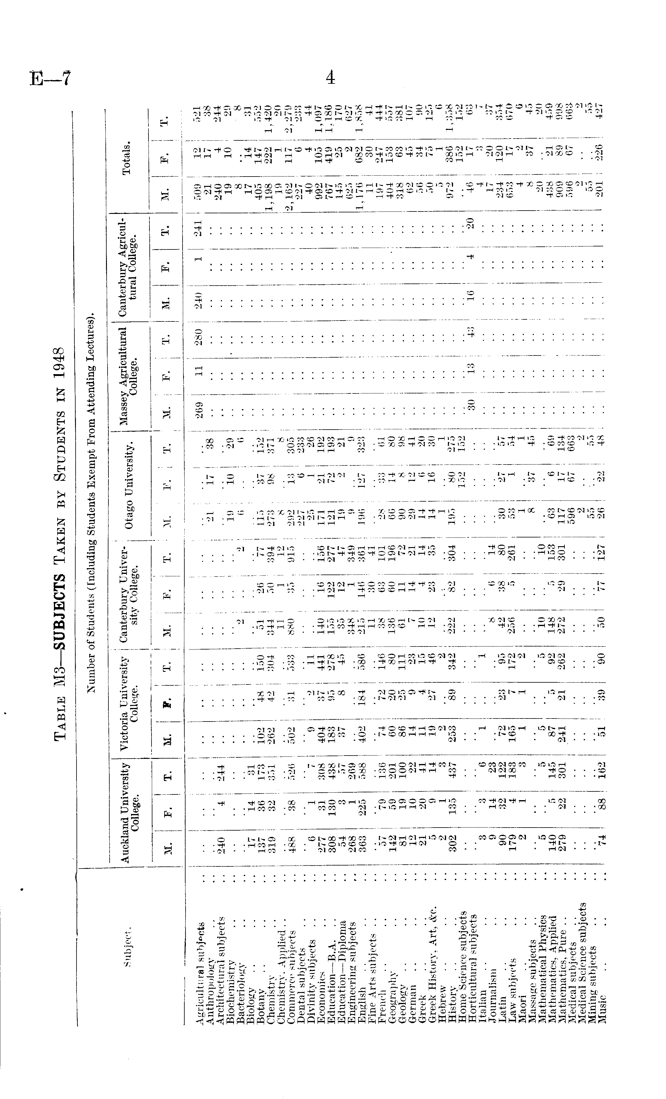 Number of Students (Including Students Exempt From Attending Lectures). Subiect Auckland University Victoria University j Canterbury Univer- n , n TTnivorsifv Massey Agricultural Canterbury Agricul- Totals. SUt)je0t - College. College. sity College. 0tago University. College. tural College. M. F. T. M. T. M. F. T. i M. 1 F. T. M. F. T. M. F. T. M. F. T. Agricultural subjects .. .. .. .. .. .. ■ • ■ • • • I • • 269 11 280 240 1 241 509 12 521 Anthropology .. .. .. .. .. .. .. .. .. .. .. 21 17 38 .. . • •• •• •• 21 It 38 Architectural subjects .. 240 4 244 .. .. .. .. .. .. .. .. .. . • • • • ■ • • • • • • 240 4 -44 Biochemistry 19 10 29 19 10 29 Bacteriology .. .. .. .. .. .. .. .. 2 .. 2 6 .. 6 .. • • • • • • • • • • » .. » Biology .. .. .. 17 14 31 17 14 31 Botany 137 36 173 102 48 150 51 26 77 115 37 152 „ 405 147 552 Chemistry .. ..319 32 351 262 42 304 344 50 394 273 98 371 1 = 198 222 1,420 Chemistry, Applied.. 11 1 12 8 .. 8 19 1 -0 Commerce subjects .. 488 38 526 502 31 533 880 35 915 292 13 305 2,162 117 2,279 Dental subjects 227 6 233 227 6 233 Divinity subjects .. .. 6 1 7 9 2 11 25 1 26 , nm Economics .. .. 277 31 308 404 37 441 140 16 156 171 21 192 992 105 1,097 Education— B.A. .. .. 308 130 438 183 95 278 155 122 277 121 72 193 767 419 1,186 Education— Diploma .. 54 3 57 37 8 45 35 12 47 19 2 21 145 25 170 Engineering subjects .. 268 1 269 .. .. .. 348 1 349 9 . . 9 .. .. . . . . • • 62o 2 627 English .. .. .. 363 225 588 402 184 586 215 146 361 196 127 323 .. .. ■ 1.176 682 .1,858 Fine Arts subjects .. .. .. .. .. .. .. .. 11 30 41 .. .. .. .. .. •• •• •• •• 11 »0 41 French .. .. .. 57 79 136 74 72 146 38 63 101 28 33 61 197 247 444 Geography .. 142 59 201 60 20 80 136 60 196 66 14 80 • 404 153 557 Geology .. .. .. 81 19 100 86 25 111 61 11 72 90 8 98 318 63 381 German .. .. .. 12 10 22 14 9 23 7 14 21 29 12 41 62 45 107 Greek .. .. .. 21 20 41 11 4 15 10 4 14 14 6 20 56 34 90 Greek History, Art, &c. .. 5 9 14 19 27 46 12 23 35 14 16 30 50 7o 125 Hebrew .. .. .. 2 1 3 2 2 . •. .. 1 1 5 1 6 History .. .. .. 302 135 437 253 89 342 222 82 304 195 80 275 972 386 l,3o8 Home Science subjects .. .. .. .. .. .. .. •• •• •• 152 152 .. .. .. .. •• • ■ •• 1»2 lo2 Horticultural subjects .. .. .. .. .. ■ • • • • ■ • • • • • • • • 30 13 43 16 4 20 46 17 63 Italian .. .. .. 3 3 6 1 1 4 3 7 Journalism .. .. 9 14 23 .. .. .. 8 6 14 .. .. .. .. .. • • • • • • • • 17 20 37 Latin . . . . .. 90 32 122 72 23 95 42 38 80 30 27 57 234 120 354 Law subjects .. 179 4 183 165 7 172 256 5 261 53 1 54 653 17 670 Maori .. .. .. 2 1 3 1 1 2 1.. 1 4 2 6 Massage subjects .. .. .. .. .. .. .. .. . • . ■ • • 8 37 45 .. .. . . • ■ • • • • * 8 37 45 Mathematical Physics .. 5 .. 5 5 .. 5 10 .. 10 .. .. .. .. .. •• •• •• •• 20 .. 20 Mathematics, Applied .. 140 5 145 87 5 92 148 5 153 63 6 69 . . . . . . . • . • 438 21 459 Mathematics, Pure .. 279 22 301 241 21 262 272 29 301 117 17 134 909 89 998 Medical subjects .. 596 67 663 596 67 663 Medical Science subjects .. .. .. .. .. • • • ■ • • • • • • 2 .. 2 .. .. .. .. . • • ■ 2 .. a Mining subjects .. .. .. .. .. .. •• •• •• •• •• 55 . 55 .. .. .. .. .. •• 55 &<> Music .. .. .. 74 88 162 51 39 90 50 77 127 26 22 I 48 201 1 226 427
