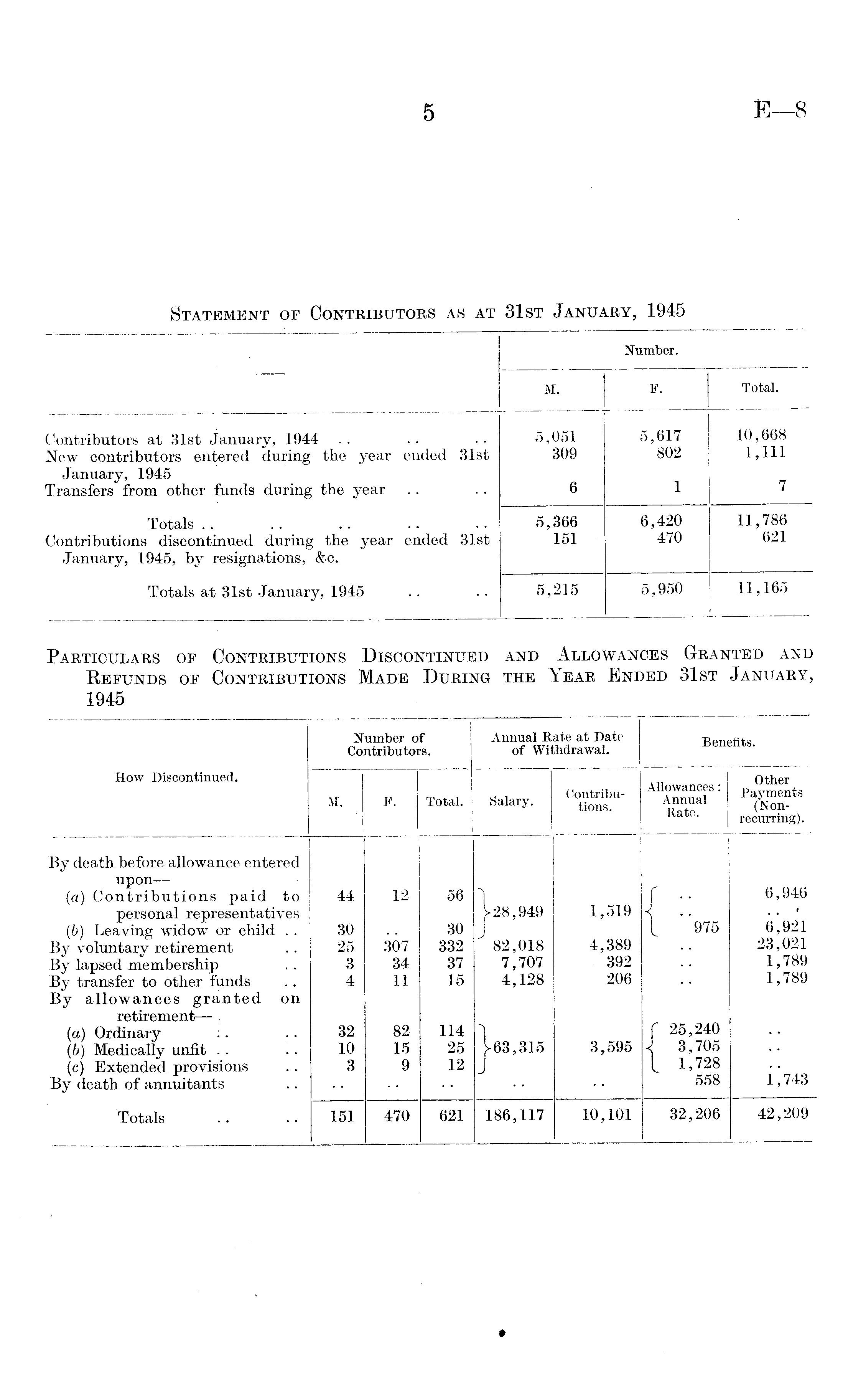 Number. M. P. Total. Contributors at 31st January, 1944 New contributors entered during the year ended 31st January, 1945 Transfers from other funds during the year 5,051 309 6 5,617 802 1 10,668 1,111 7 Totals Contributions discontinued during the year ended 31st January, 1945, by resignations, &c. 5,366 151 6,420 470 11,786 621 Totals at 31st January, 1945 5,215 5,950 11,165