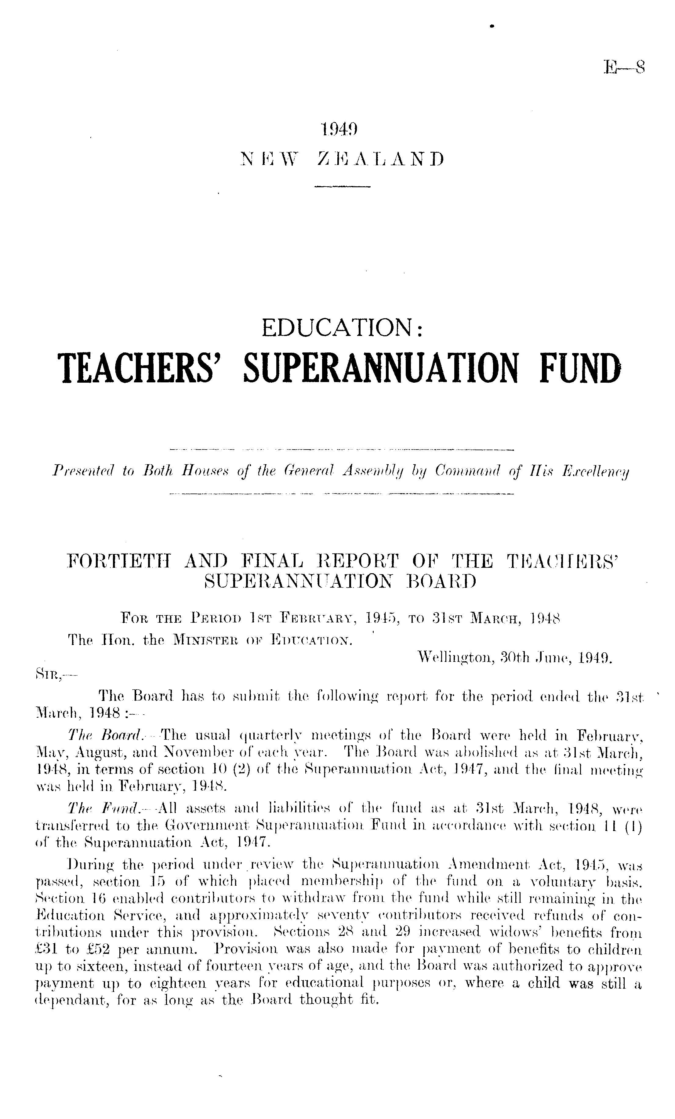 FORTIETH AND FINAL REPORT OF THE TEACHERS' SUPERANNUATION BOARD For the Period Ist February, 1945, to 31st March, 1948 The Hon. the Minister op Education. Wellington, 30th June, 1949. Sir, — The Board has to submit the following report for the period ended the 31st March, 1948 The Board. —The usual quarterly meetings of the Board were held in February, May, August, and November of each year. The Board was abolished as at 31st March, 194-8, in terms of section 10 (2) of the Superannuation Act, 1947, and the final meeting was held in February, 1948. The Fund. —All assets and liabilities of the fund as at 31st March, 1948, were transferred to the Government Superannuation Fund in accordance with section 11 (1) of the Superannuation Act, 1947. During the period under .review the Superannuation Amendment Act, 1945, was passed, section 15 of which placed membership of the fund on a voluntary basis.' Section 16 enabled,contributors to withdraw from the fund while still remaining in the Education Service, and approximately seventy contributors received refunds of contributions under this provision. Sections 28 and 29 increased widows' benefits from £3l to £52 per annum. Provision was also made for payment of benefits to children up to sixteen, instead of fourteen years of age, and the Board was authorized to approve payment up to eighteen years for educational purposes or, where a child was still a dependant, for as long as the Board thought fit.