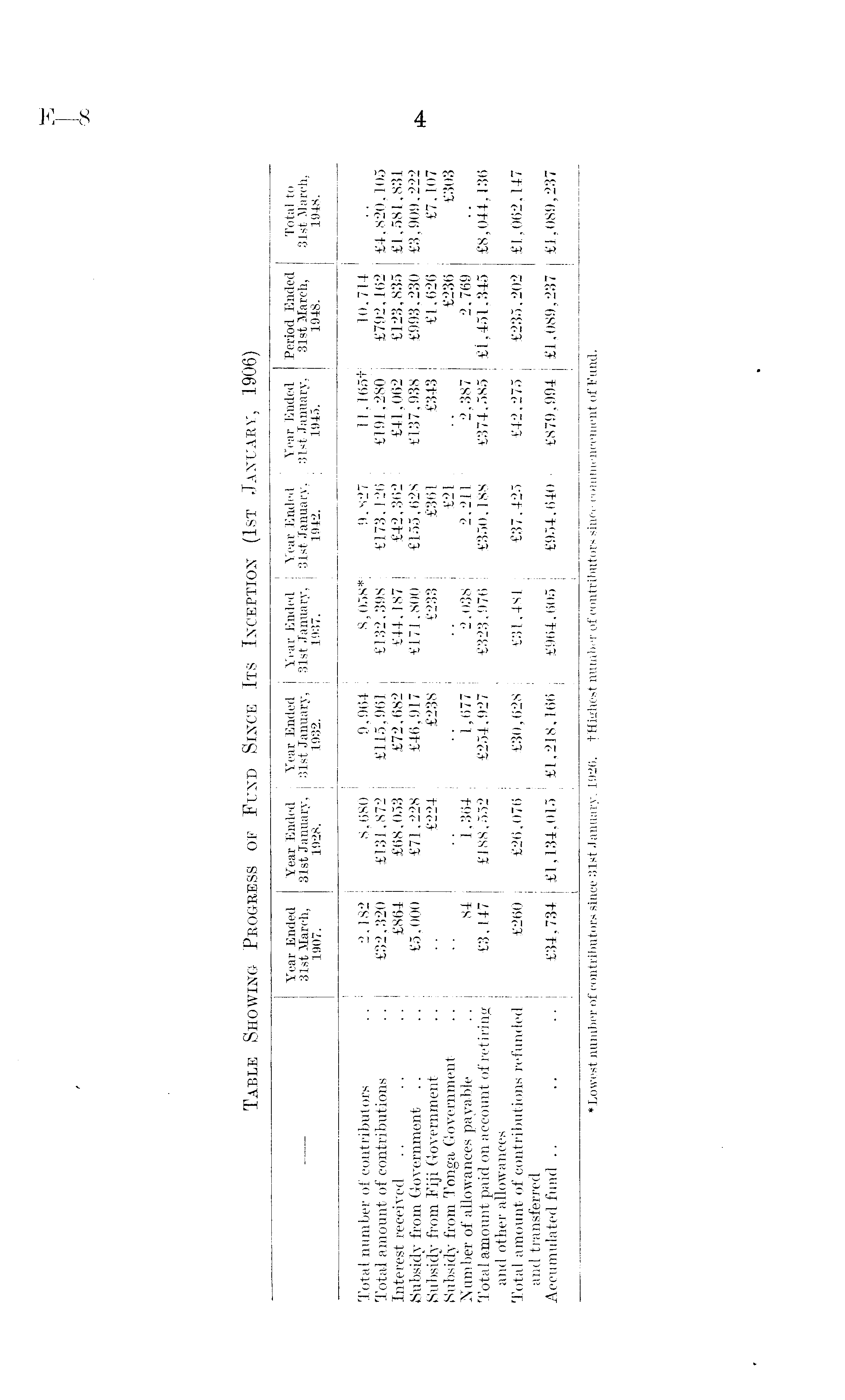 Year Ended Year Ended Year Ended Year Ended Year Ended j Year Ended Period Ended Total to * 31st March, 31st January, 31st January, 31st January, 31st January, 31st January, 31st March, 31st March, 1907. 1928. * 1932. * 1937. * 1942. | 1945. 1948. 1948. Total number of contributors .. 2,182 8,680 9,964 8,058* 9,827 | ll,165f 10,714 i Total amount of contributions .. £32, 320 £131,872 £115,961 £132,398 £173,126 i £191,280 £792,162 £4,820,105 Interest received .. .. .. £864 £68,053 £72,682 £44,187 £42,362 £41,062 £123,835 £1,581,831 Subsidy from Government .. .. £5,000 £71,228 £46,917 £171,800 £155,628; £137,938 £993,230 £3,909,222 Subsidy from Fiji Government .. .. £224 £238 £233 £361 £343 £1,626 £7,107 Subsidy from Tonga Government .. . . .. .. .. £21 j .. £236 £303 Number of allowances payable .. 84 1,364 1,677 2,038 2,211 j 2,387 2,769 Total amount paid on account of retiring £3,147 £188,552 £254,927 £323,976 £350,188 £374,585 £1,451,345 £8,044,136 and other allowances Total amount of contributions refunded £260 £26,076 £30,628 £31,481 £37,425 ; £42,275 £235,202 £1,062,147 ancl transferred Accumulated fund .. .. .. £34,734 £1,134,015 £1,218,166 £964,605 £954,640 j £879,994 £1,089,237 £1,089,237 ♦Lowest number of contributors since 31st January, 1926. fHighest number of contributors since commencement of Fund.