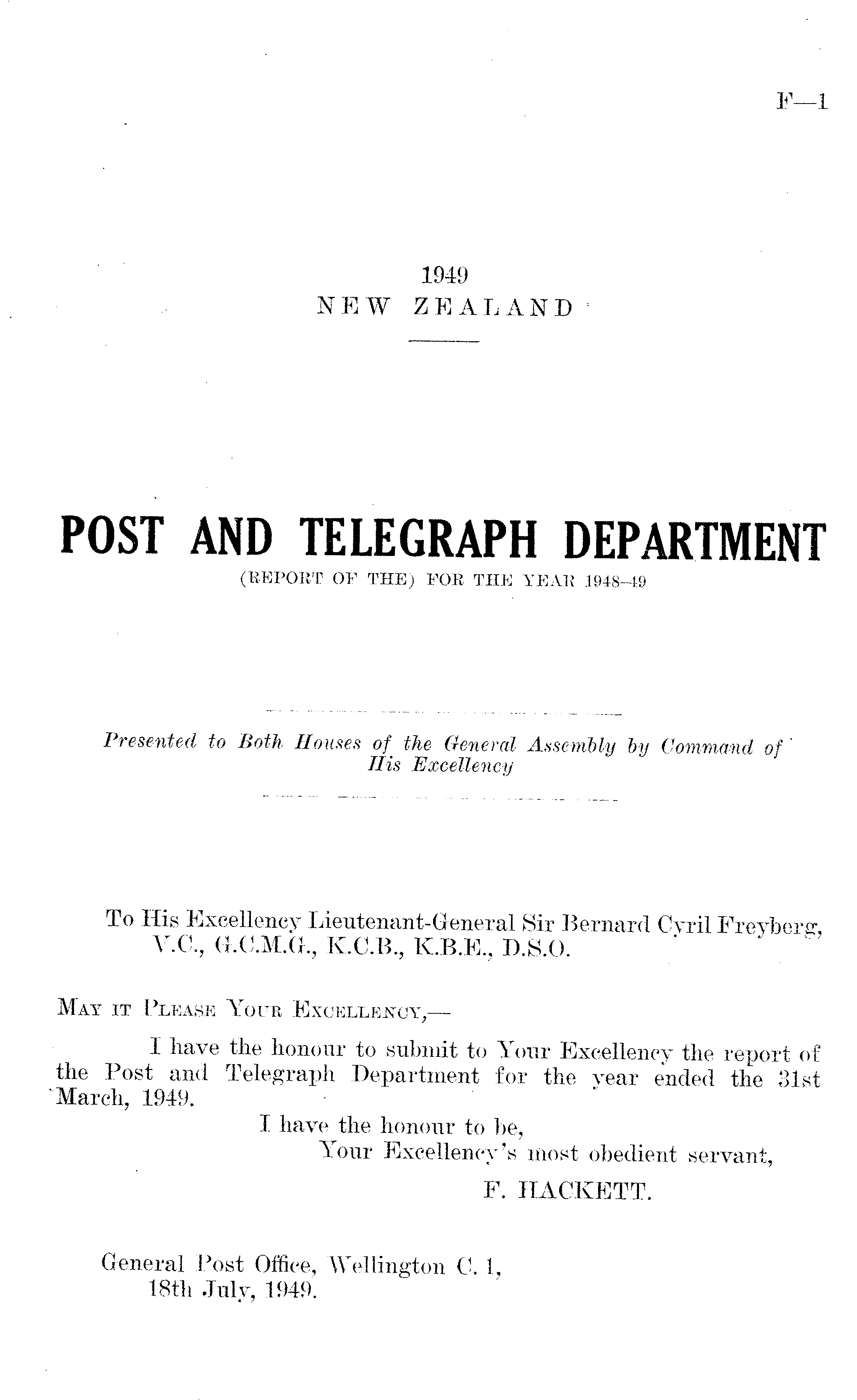 To His Excellency Lieutenant-General Sir Bernard Cyril Freybersr V.C., G.C.M.G., K.C.B, K.8.E., D.S.O. May it Please Your Excellency,— I have the honour to submit to Your Excellency the report of the Post and Telegraph Department for the year ended the 31st March, 1949. I have the honour to be, Your Excellency's most obedient servant, F. HACKETT. General Post Office, Wellington C. 1, 18th July, 1949.