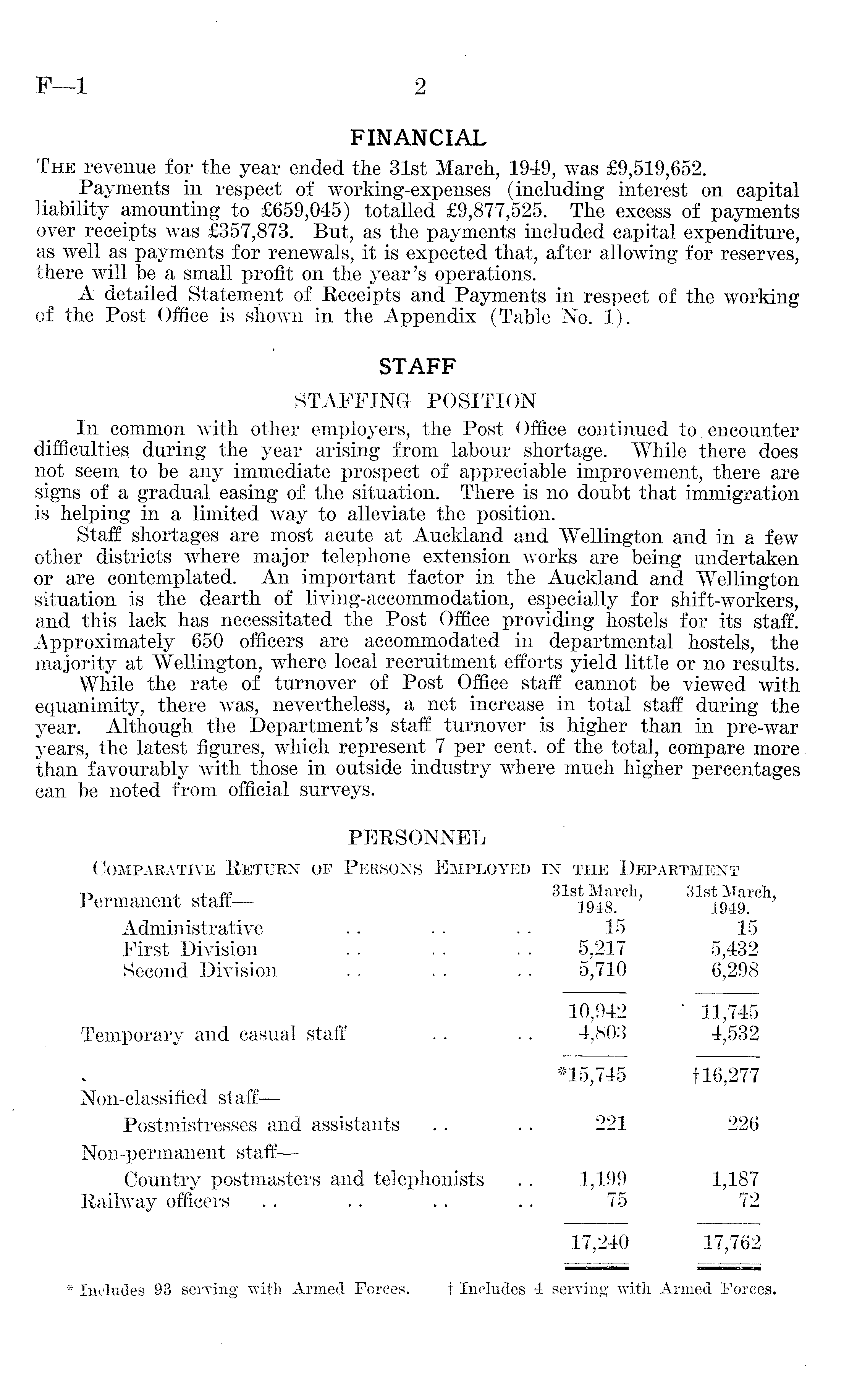 FINANCIAL The revenue for the year ended the 31st March, 1949, was £9,519,652. Payments in respect of working-expenses (including interest on capital liability amounting to £659,045) totalled £9,877,525. The excess of payments over receipts was £357,873. But, as the payments included capital expenditure, as well as payments for renewals, it is expected that, after allowing for reserves, there will be a small profit on the year's operations. A detailed Statement of Receipts and Payments in respect of the working of the Post Office is shown in the Appendix (Table No. 1). STAFF STAFFING POSITION In common with other employers, the Post Office continued to. encounter difficulties during the year arising from labour shortage. While there does not seem to be any immediate prospect of appreciable improvement, there are signs of a gradual easing of the situation. There is no doubt that immigration is helping in a limited way to alleviate the position. Staff shortages are most acute at Auckland and Wellington and in a few other districts where major telephone extension works are being undertaken or are contemplated. An important factor in the Auckland and Wellington situation is the dearth of living-accommodation, especially for shift-workers, and this lack has necessitated the Post Office providing hostels for its staff. Approximately 650 officers are accommodated in departmental hostels, the majority at Wellington, where local recruitment efforts yield little or no results. While the rate of turnover of Post Office staff cannot be viewed with equanimity, there was, nevertheless, a net increase in total staff during the year. Although the Department's staff turnover is higher than in pre-war years, the latest figures, which represent 7 per cent, of the total, compare more than favourably with those in outside industry where much higher percentages can be noted from official surveys. PERSONNEL Comparative Return op Persons Employed in the Department ~ , , n, 31st March, 31st March, Permanent staff— :]94B> 7 1949. Administrative . . . . . . . 15 15 First Division . . . . . . 5,217 5,432 Second Division . . . . . . 5,710 6,298 10,942 ' 11,745 Temporary and casual staff • . • . 4,803 4,532 *15,745 f 16,277 Non-classified staff — Postmistresses and assistants .. .. 221 226 Non-permanent staff— Country postmasters and telephonists . . 1,199 1,187 Railway officers . . .. .. .. 75 72 17,240 17,762