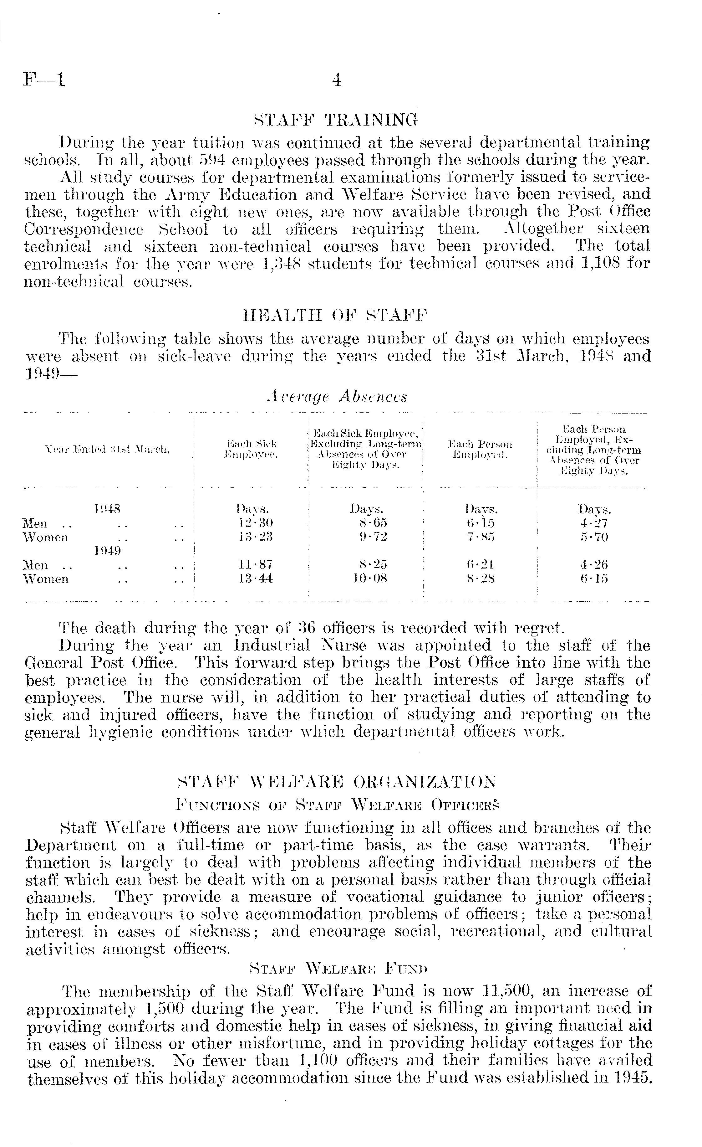 STAFF TRAINING During the year tuition was continued at the several departmental training schools. In all, about 594 employees passed through the schools during the year. All study courses for departmental examinations formerly issued to servicemen through the Army Education and Welfare Service have been revised, and these, together with eight new ones, are now available through the Post Office Correspondence School to all officers requiring them. Altogether sixteen technical and sixteen non-technical courses have been provided. The total enrolments for the year were 1,348 students for technical courses and 1,108 for non-technical courses. HEALTH OF STA^F The following table shows the average number of days on which employees were absent on sick-leave during the years ended the 31st March, 194S and 1949