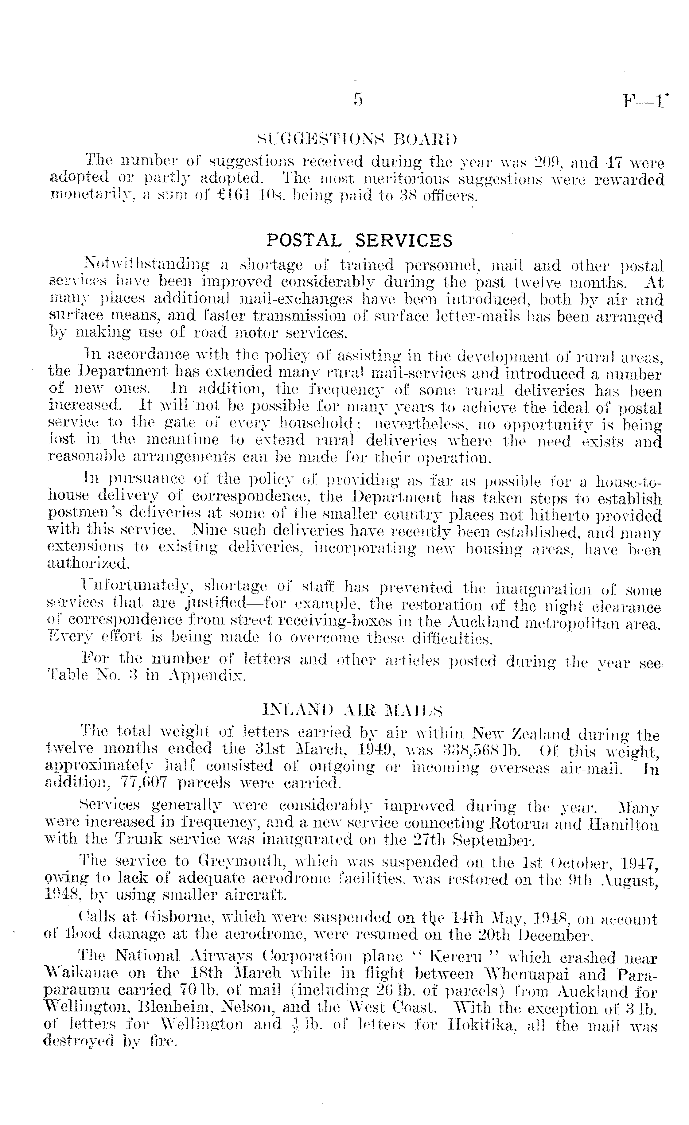 SUGGESTIONS BOARD The number of suggestions received during the year was 209, and 47 were adopted or partly adopted. The most meritorious suggestions were rewarded monetarily, a sum of £l6l 10s. being paid to 38 officers. POSTAL SERVICES Notwithstanding a shortage of trained personnel, mail and other postal services have been improved considerably during the past twelve months. At many places additional mail-exchanges have been introduced, both by air and surface means, and faster transmission of surface letter-mails has been arranged by making use of road motor services. In accordance with the policy of assisting in the development of rural areas, the Department has extended many rural mail-services and introduced a number of new ones. In addition, the frequency of some rural deliveries has been increased. It will not be possible for many years to achieve the ideal of postal service to the gate of every household; nevertheless, no opportunity is being lost in the meantime to extend rural deliveries where the need exists and reasonable arrangements can be made for their operation. In pursuance of the policy of providing as far as possible for a house-to-house delivery of correspondence, the Department has taken steps to establish postmen's deliveries at some of the smaller country places not hitherto provided with this Nine such deliveries have recently been established, and many extensions to existing deliveries, incorporating new housing areas, have been authorized. Unfortunately, shortage of staff has prevented the inauguration of some services that are justified—for example, the restoration of the night clearance of correspondence from street receiving-boxes in the Auckland metropolitan area. Every effort is being made to overcome these difficulties. For the number of letters and other articles posted during the year seeTable No. 3 in Appendix. INLAND AIR MAILS The total weight of letters carried by air within New Zealand during the twelve months ended the 31st March, 1949, was 338,568 lb. Of "this weight, approximately half consisted of outgoing or incoming overseas air-mail. In addition, 77,607 parcels were carried. Services generally were considerably improved during the year. Many were increased in frequency, and a new service connecting Rotorua and Hamilton with the Trunk service was inaugurated on the 27th September. The serviee to Greymouth, which was suspended on the Ist October, 1947, Qwing to lack of adequate aerodrome facilities, was restored on the 9th August, 1948, by using smaller aircraft. Calls at Gisborne, which were suspended on tlje 14th May, 1948, on account of flood damage at the aerodrome, were resumed on the 20th December. The National Airways Corporation plane " Kereru " which crashed near Waikanae on the 18th March while in flight between Whenuapai and Paraparaumu carried 70 lb. of mail (including 26 lb. of parcels) from Auckland for Wellington, Blenheim, Nelson, and the West Coast. With the exception of 3 lb. of letters for Wellington and | lb. of letters for Hokitika, all the mail was destroyed by fire.