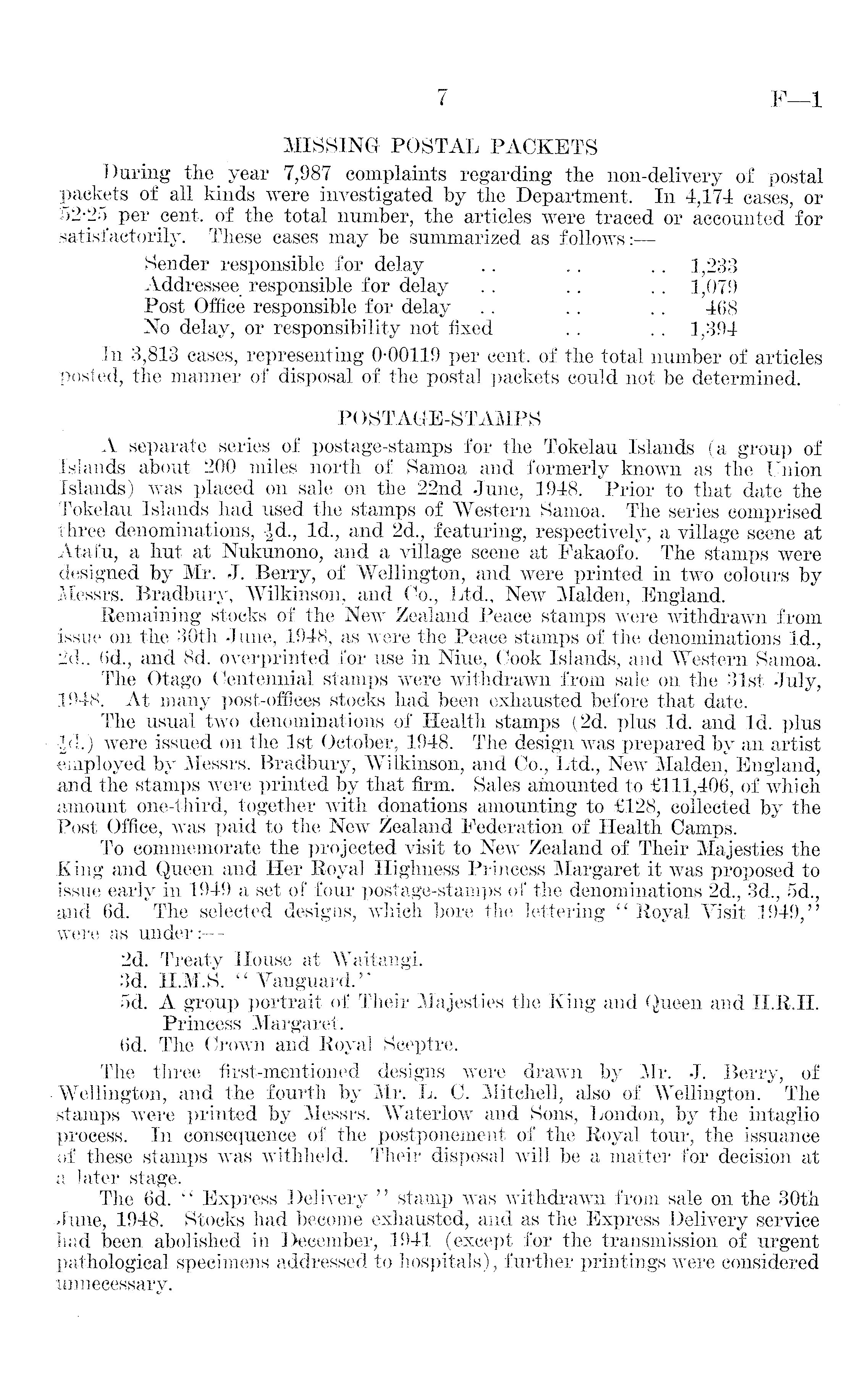 MISSING POSTAL PACKETS During the year 7,987 complaints regarding the non-delivery of postal packets of all kinds were investigated by the Department. In 4,174 cases, or 52-25 per cent, of the total number, the articles were traced or accounted for satisfactorily. These cases may be summarized as follows: Sender responsible for delay .. .. .. 1,233 Addressee responsible for delay . . .. . . 1,079 Post Office responsible for delay .. .. .. 468 No delay, or responsibility not fixed .. .. 1,394 In 3,813 cases, representing 0-00119 per cent, of the total number of articles posted, the manner of disposal of the postal packets could not be determined. POSTAGE-STAMPS A separate series of postage-stamps for the Tokelau Islands (a group of Islands about 200 miles north of Samoa and formerly known as the Union Islands) was placed on sale on the 22nd June, 1948. Prior to that date the Tokelau Islands had used the stamps of Western Samoa. The series comprised three denominations, |d., Id., and 2d., featuring, respectively, a village scene at Atafu, a hut at Nukunono, and a village scene at Fakaofo. The stamps were designed by Mr. J. Berry, of Wellington, and were printed in two colours by Messrs. Bradbury, Wilkinson, and Co., Ltd., New Maiden, England. Remaining stocks of the New Zealand Peace stamps were withdrawn from issue on the 30th June, 1948, as were the Peace stamps of the denominations Id., 2d., 6d., and Bd. overprinted for use in Niue, Cook Islands, and Western Samoa. The Otago Centennial stamps were withdrawn from sale on the 31st July, 1948. At many post-offices stocks had been exhausted before that date. The usual two denominations of Health stamps (2d. plus Id. and Id. plus -Jd.) were issued on the Ist October, 1948. The design was prepared by an artist employed by Messrs. Bradbury, Wilkinson, and Co., Ltd., New Maiden, England, and the stamps were printed by that firm. Sales amounted to £111,406, of which amount one-third, together with donations amounting to £l2B, collected by the Post Office, was paid to the New Zealand Federation of Health Camps. To commemorate the projected visit to New Zealand of Their Majesties the King and Queen and Her Royal Highness Princess Margaret it was proposed to issue early in 1949 a set of four postage-stamps of the denominations 2d., 3d., 5d., and 6d. The selected designs, which bore the lettering " Royal Visit 1949," were as under: — 2d. Treaty House at Waitangi. 3d. H.M.S. " Vanguard.' * sd. A group portrait of Their Majesties the King and Queen and H.R.H. Princess Margaret. 6d. The Crown and Royal Sceptre. The three first-mentioned designs were drawn by Mr. J. Berry, of ■Wellington, and the fourth by Mr. L. C. -Mitchell, also of Wellington. The stamps were printed by Messrs. Waterlow and Sons, London, by the intaglio process. In consequence of the postponement of the Royal tour, the issuance of these stamps was withheld. Their disposal will be a matter for decision at & later stage. The 6d. l< Express Delivery " stamp was withdrawn from sale on the 30th June, 1948. Stocks had become exhausted, and as the Express Delivery service had been abolished in December, 1941 (except for the transmission of urgent pathological specimens addressed to hospitals), further printings were considered unnecessary.