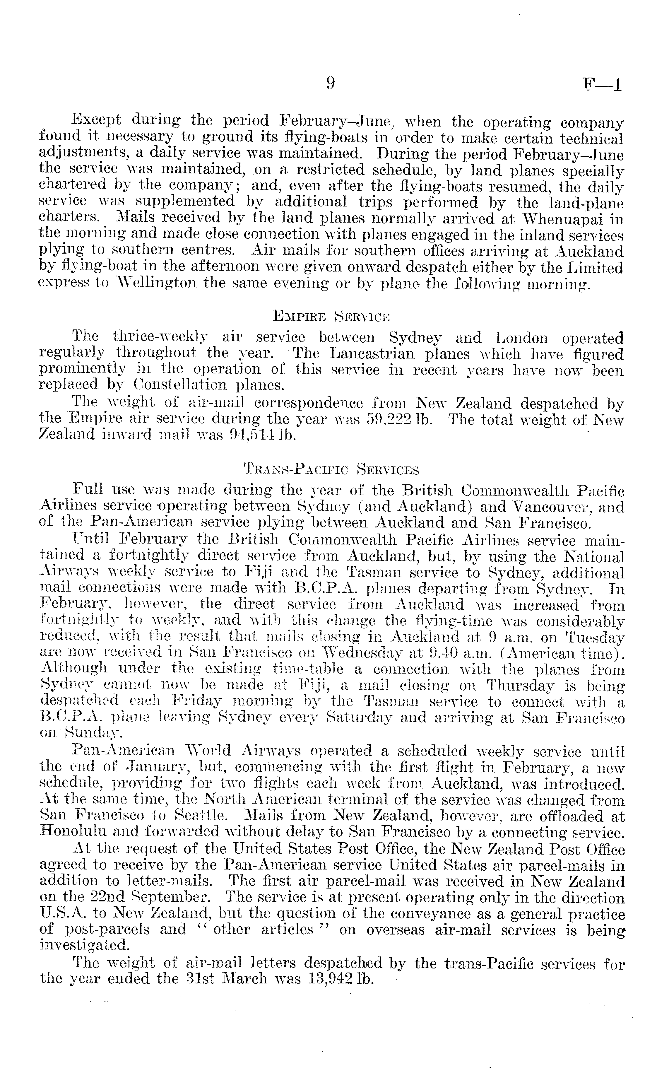 Except during the period February—June, when the operating company found it necessary to ground its flying-boats in order to make certain technical adjustments, a daily service was maintained. During the period February—June the service was maintained, on a restricted schedule, by land planes specially chartered by the company; and, even after the flying-boats resumed, the daily service was supplemented by additional trips performed by the land-plane charters. Mails received by the land planes normally arrived at Whenuapai in the morning and made close connection with planes engaged in the inland services plying to southern centres. Air mails for southern offices arriving at Auckland by flying-boat in the afternoon were given onward despatch either by the Limited express to .Wellington the same evening or by plane the following morning. Empire Service The thrice-weekly air service between Sydney and London operated regularly throughout the year. The Lancastrian planes which have figured prominently in the operation of this service in recent years have now been replaced by Constellation planes. The weight of air-mail correspondence from New Zealand despatched by the Empire air service during the year was 59,222 lb. The total weight of New Zealand inward mail was 94,514 lb. Trans-Pacific Services Full use was made during the year of the British Commonwealth Pacific Airlines service-operating between Sydney (and Auckland) and Vancouver, and of the Pan-American service plying between Auckland and San Francisco. Until February the British Commonwealth Pacific Airlines service maintained a fortnightly direct service from Auckland, but, by using the National Airways weekly service to Fiji and the Tasman service to Sydney, additional mail connections were made with B.C.P.A. planes departing from Sydney. In February, however, the direct service from Auckland was increased from fortnightly _ to weekly, and with this change the flying-time was eonsiderably reduced, with the result that mails closing in Auckland at 9 a.m. on Tuesday are now received in San Francisco on Wednesday at 9.40 a.m. (American time). Although under the existing time-table a connection with the planes from Sydney cannot now be made at Fiji, a mail closing on Thursday is being despatched each Friday morning by the Tasman service to connect with a B.C.P.A. plane leaving Sydney every Saturday and arriving at San Francisco on Sunday. Pan-American World Airways operated a scheduled weekly service until the end of January, but, commencing with the first flight in February, a new schedule, providing for two flights each week froiji Auckland, was introduced. At the same time,"the North American terminal of the service was changed from San Francisco to Seattle. Mails from New Zealand, however, are offloaded at Honolulu and forwarded without delay to San Francisco by a connecting service. At the request of the United States Post Office, the New Zealand Post Office agreed to receive by the Pan-American service United States air parcel-mails in addition to letter-mails. The first air parcel-mail was received in New Zealand on the 22nd September. The service is at present operating only in the direction U.S.A. to New Zealand, but the question of the conveyance as a general practice of post-parcels and <£ other articles " on overseas air-mail services is being investigated. The weight of air-mail letters despatched by the trans-Pacific services for the year ended the 31st March was 13,942 lb.