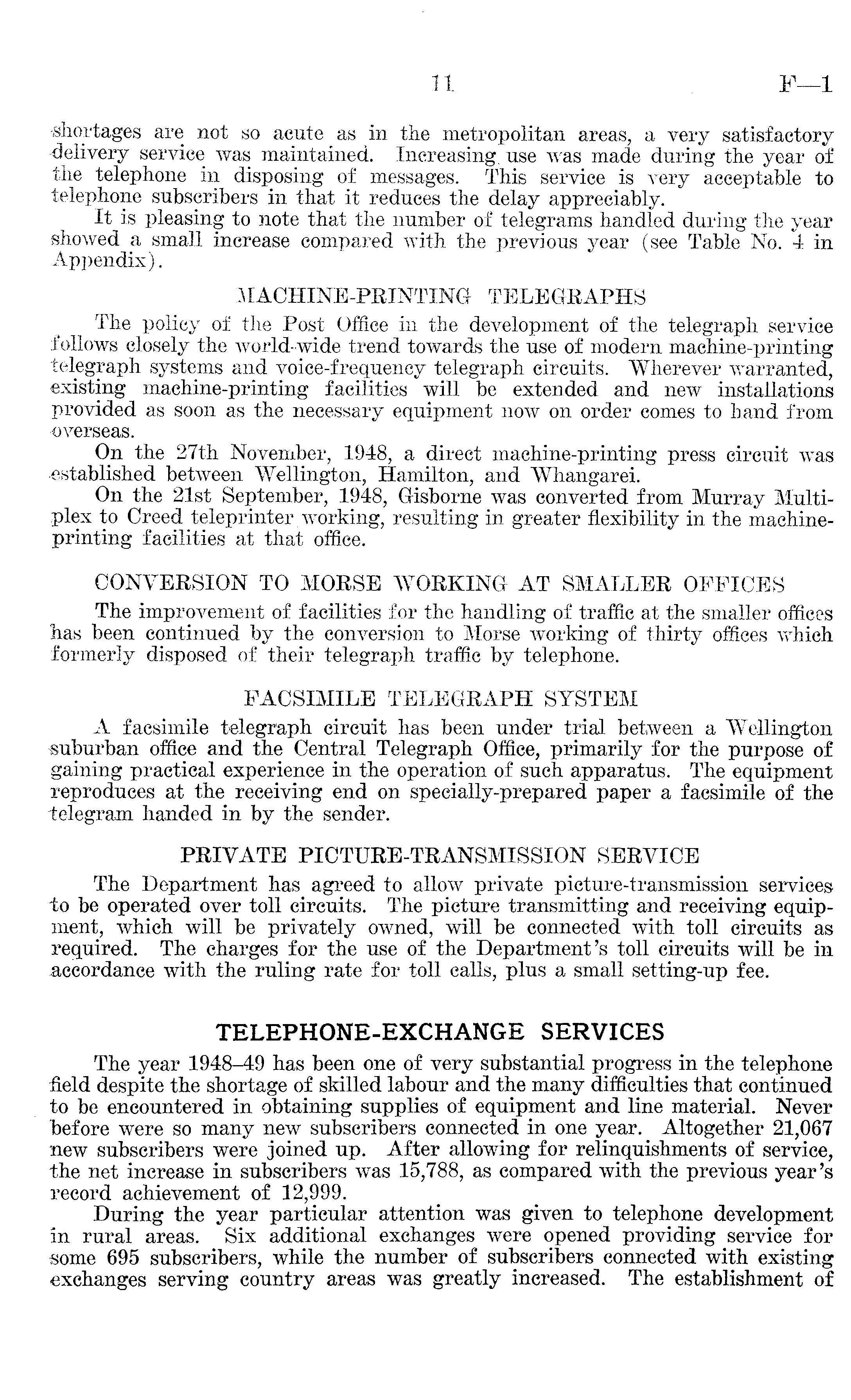shortages are not so acute as in the metropolitan areas, a very satisfactory -delivery service was maintained. Increasing, use was made during the year of the telephone in disposing of messages. This service is very acceptable to telephone subscribers in that it reduces the delay appreciably. It is pleasing to note that the number of telegrams handled during the year showed a small increase compared with the previous year (see Table No. 4 in Appendix). MACHINE-PRINTING TELEGRAPHS The policy of the Post Office in the development of the telegraph service follows closely the world-wide trend towards the use of modern machine-printing telegraph systems and voice-frequency telegraph circuits. Wherever warranted, existing machine-printing facilities will be extended and new installations provided as soon as the necessary equipment now on order comes to hand from overseas. On the 27th November, 1948, a direct machine-printing press circuit was established between Wellington, Hamilton, and Whangarei. On the 21st September, 1948, Gisborne was converted from Murray Multiplex to Creed teleprinter working, resulting in greater flexibility in the machineprinting facilities at that office. CONVERSION TO MORSE WORKING AT SMALLER OFFICES The improvement of facilities for the handling of traffic at the smaller offices has been continued by the conversion to Morse working of thirty offices which formerly disposed of their telegraph traffic by telephone. FACSIMILE TELEGRAPH SYSTEM A facsimile telegraph circuit has been under trial between a Wellington suburban office and the Central Telegraph Office, primarily for the purpose of gaining practical experience in the operation of such apparatus. The equipment reproduces at the receiving end ©n specially-prepared paper a facsimile of the telegram handed in by the sender. PRIVATE PICTURE-TRANSMISSION SERVICE The Department has agreed to allow private picture-transmission services to be operated over toll circuits. The picture transmitting and receiving equipment, which will be privately owned, will be connected with toll circuits as required. The charges for the use of the Department's toll circuits will be in accordance with the ruling rate for toll calls, plus a small setting-up fee. TELEPHONE-EXCHANGE SERVICES The year 1948-49 has been one of very substantial progress in the telephone field despite the shortage of skilled labour and the many difficulties that continued to be encountered in obtaining supplies of equipment and line material. Never before were so many new subscribers connected in one year. Altogether 21,067 new subscribers were joined up. After allowing for relinquishments of service, the net increase in subscribers was 15,788, as compared with the previous year's •record achievement of 12,999. During the year particular attention was given to telephone development in rural areas. Six additional exchanges were opened providing service for some 695 subscribers, while the number of subscribers connected with existing exchanges serving country areas was greatly increased. The establishment of