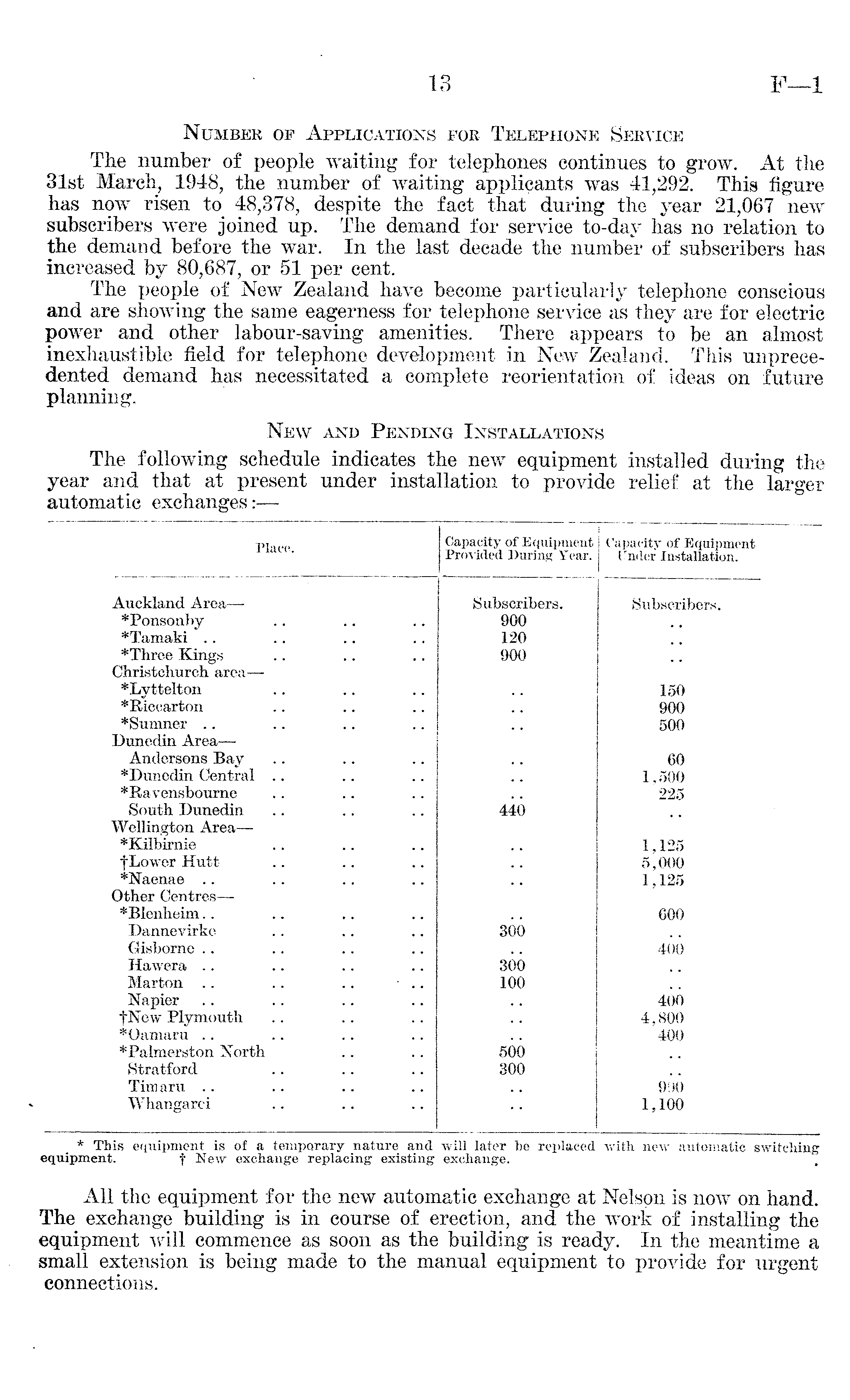 Number of Applications for Telephone Service The number of people waiting for telephones continues to grow. At the 31st March, 1948, the number of waiting applicants was 41,292. This figure has now risen to 48,378, despite the fact that during the year 21,067 new subscribers were joined up. The demand for service to-day has no relation to the demand before the war. In the last decade the number of subscribers has increased by 80,687, or 51 per cent. The people of New Zealand have become particularly telephone conscious and are showing the same eagerness for telephone service as they are for electric power and other labour-saving amenities. There appears to be an almost inexhaustible field for telephone development in New Zealand. This unprecedented demand has necessitated a complete reorientation of ideas on future planning.