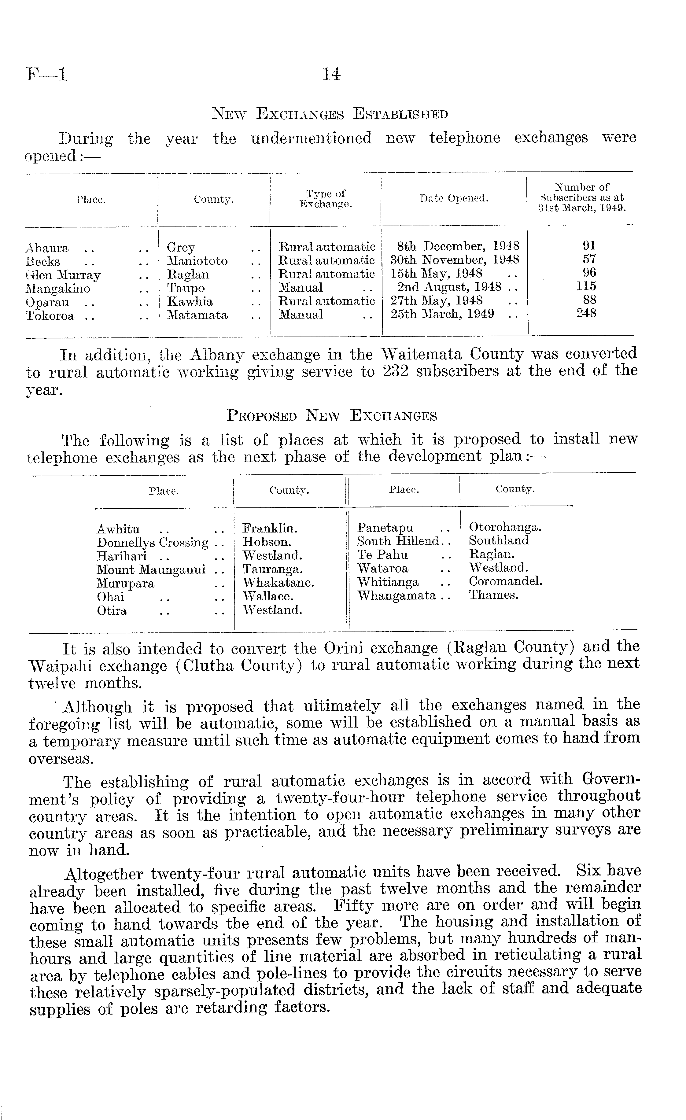 Place. County. Type of Exchange. Date Opened. Number of Subscribers as at 31st March, 1949. A h aura Becks Glen Murray Mangakino Oparau Tokoroa Grey Maniototo Raglan Taupo Kawhia Matamata Rural automatic Rural automatic Rural automatic Manual Rural automatic Manual 8th December, 1948 30th November, 1948 15th May, 1948 2nd August, 1948 .. 27th May, 1948 25th March, 1949 .. 91 57 96 115 88 248