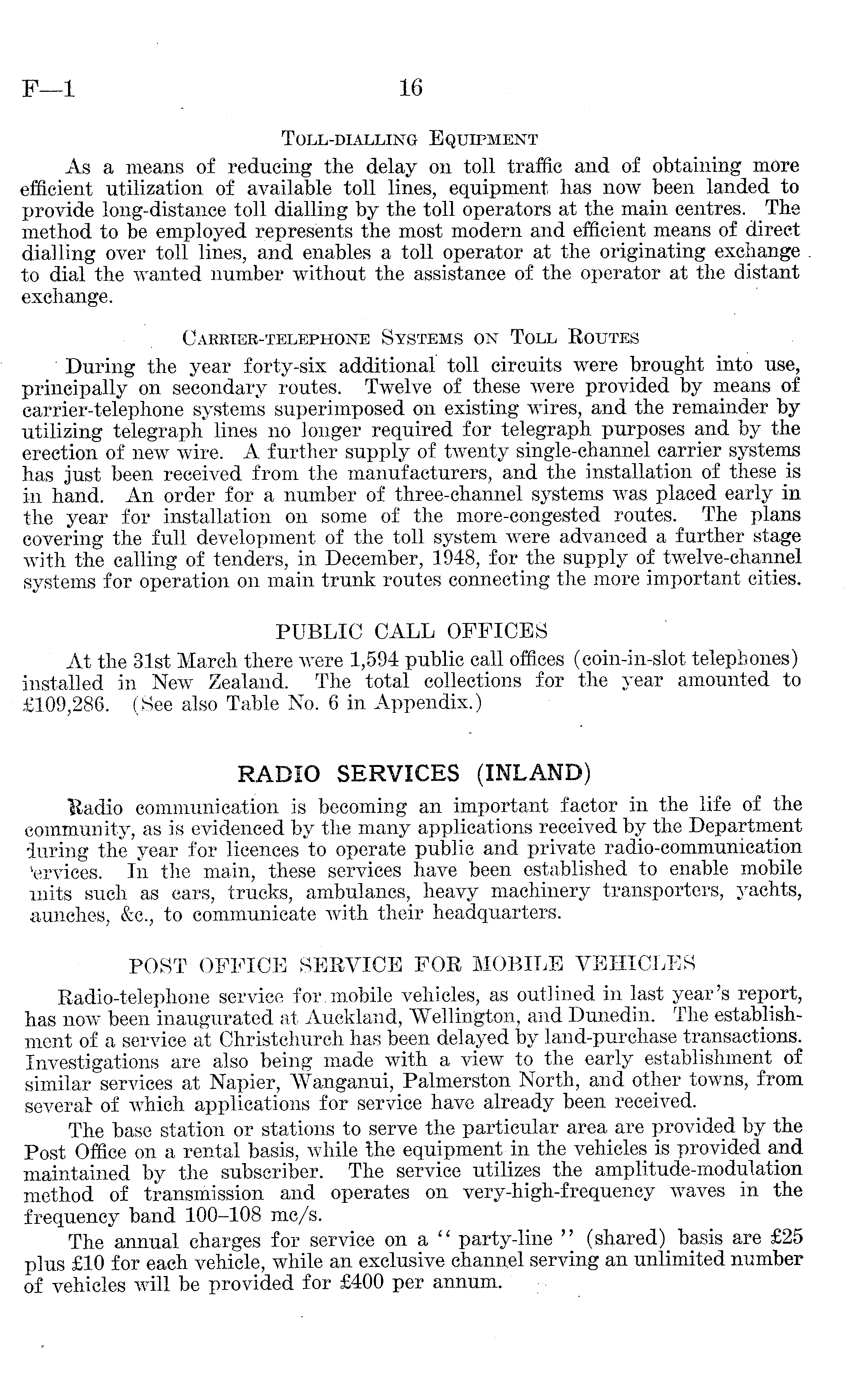 Toll-dialling Equipment As a means of reducing the delay on toll traffic and of obtaining more efficient utilization of available toll lines, equipment has now been landed to provide long-distance toll dialling by the toll operators at the main centres. The method to be employed represents the most modern and efficient means of direct dialling over toll lines, and enables a toll operator at the originating exchange to dial the wanted number without the assistance of the operator at the distant exchange. Carrier-telephone Systems on Toll Routes During the year forty-six additional toll circuits were brought into use, principally on secondary routes. Twelve of these were provided by means of carrier-telephone systems superimposed on existing wires, and the remainder by utilizing'telegraph lines no longer required for telegraph purposes and by the erection of new wire. A further supply of twenty single-channel carrier systems has just been received from the manufacturers, and the installation of these is in hand. An order for a number of three-channel systems was placed early in the year for installation on some of the more-congested routes. The plans covering the full development of the toll system were advanced a further stage with the calling of tenders, in December, 1948, for the supply of twelve-channel systems for operation on main trunk routes connecting the more important cities, PUBLIC CALL OFFICES At the 31st March there were 1,594 public call offices (coin-in-slot telephones) installed in New Zealand. The total collections for the year amounted to £109,286. (See also Table No. 6in Appendix.) RADIO SERVICES (INLAND) Kadio communication is becoming an important factor in the life of the community, as is evidenced by the many applications received by the Department iuring the year for licences to operate public and private radio-communication '•ervices. In the main, these services have been established to enable mobile mits such as cars, trucks, ambulancs, heavy machinery transporters, yachts, aunches, &c., to communicate with their headquarters. POST OFFICE SERVICE FOR MOBILE VEHICLES Radio-telephone service for.mobile vehicles, as outlined in last year's report, has now been inaugurated at Auckland, "Wellington, and Dunedin. The establishment of a service at Christchurch has been delayed by land-purchase transactions. Investigations are also being made with a view to the early establishment of similar services at Napier, Wanganui. Palmerston North, and other towns, from several- of which applications for service have already been received. The base station or stations to serve the particular area are provided by the Post Office on a rental basis, while the equipment in the vehicles is provided and maintained by the subscriber. The service utilizes the amplitude-modulation method of transmission and operates on very-high-frequency waves in the frequency band 100-108 mc/s. The annual charges for service ona" party-line " (shared) basis are £25 plus £lO for each vehicle, while an exclusive channel serving an unlimited number of vehicles will be provided for £4OO per annum.