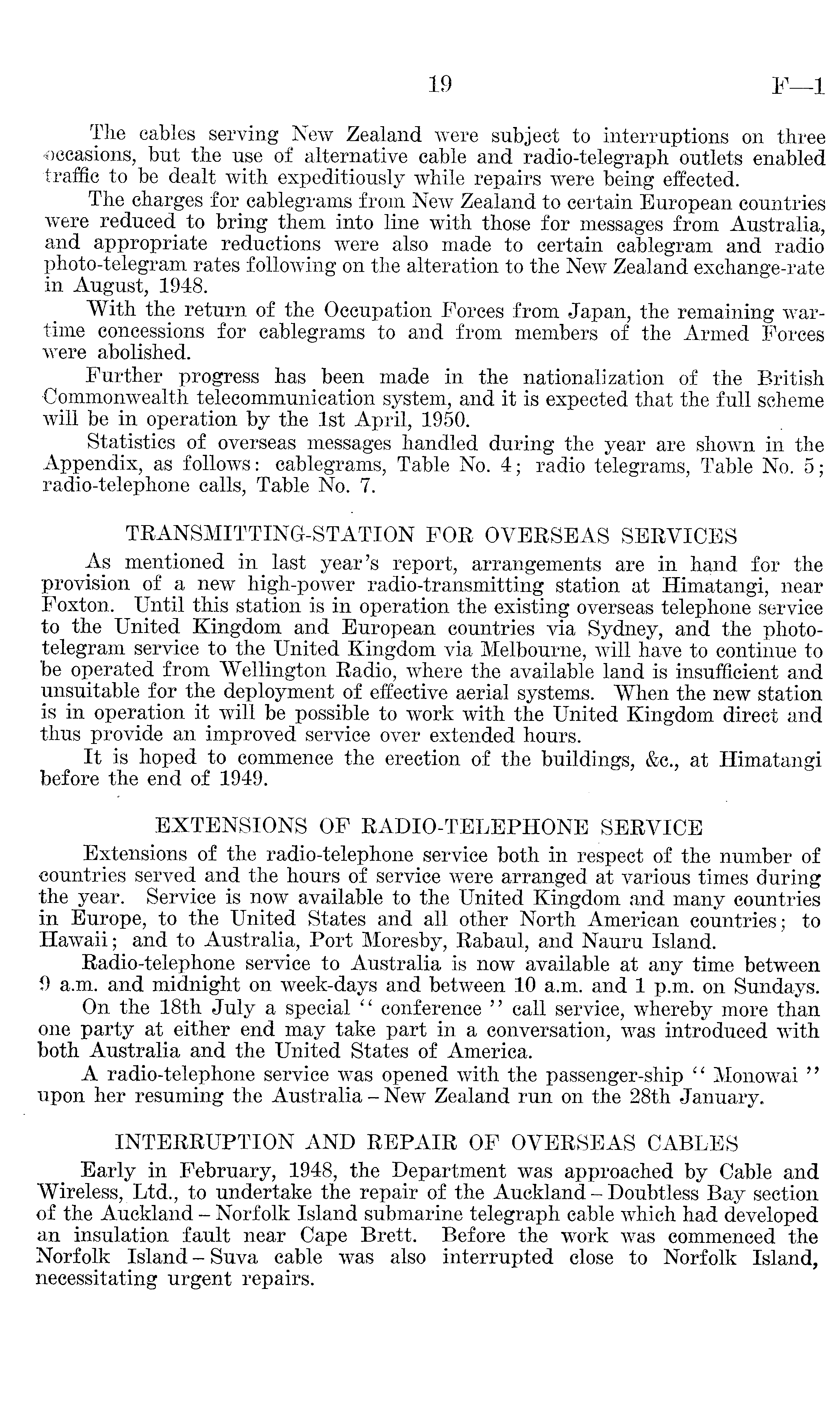 The cables serving New Zealand were subject to interruptions on three •occasions, but the use of alternative cable and radio-telegraph outlets enabled traffic to be dealt with expeditiously while repairs were being effected. The charges for cablegrams from New Zealand to certain European countries were reduced to bring them into line with those for messages from Australia, and appropriate reductions were also made to certain cablegram and radio photo-telegram rates following on the alteration to the New Zealand exchange-rate in August, 1948. With the return of the Occupation Forces from Japan, the remaining wartime concessions for cablegrams to and from members of the Armed Forces were abolished. Further progress has been made in the nationalization of the British •Commonwealth telecommunication system, and it is expected that the full scheme will be in operation by the Ist April, 1950. Statistics of overseas messages handled during the year are shown in the Appendix, as follows: cablegrams, Table No. 4; radio telegrams, Table No. 5; radio-telephone calls, Table No. 7. TRANSMITTING-STATION FOR OVERSEAS SERVICES As mentioned in last year's report, arrangements are in hand for the provision of a new high-power radio-transmitting station at Himatangi, near Foxton. Until this station is in operation the existing overseas telephone service to the United Kingdom and European countries via Sydney, and the phototelegram service to the United Kingdom via Melbourne, will have to continue to be operated from Wellington Radio, where the available land is insufficient and unsuitable for the deployment of effective aerial systems. When the new station is in operation it will be possible to work with the United Kingdom direct and thus provide an improved service over extended hours. It is hoped to commence the erection of the buildings, &c., at Himatangi before the end of 1949. EXTENSIONS OF RADIO-TELEPHONE SERVICE Extensions of the radio-telephone service both in respect of the number of countries served and the hours of service were arranged at various times during the year. Service is now available to the United Kingdom and many countries in Europe, to the United States and all other North American countries; to Hawaii; and to Australia, Port Moresby, Rabaul, and Nauru Island. Radio-telephone service to Australia is now available at any time between 9 a.m. and midnight on week-days and between 10 a.m. and 1 p.m. on Sundays. On the 18th July a special " conference " call service, whereby more than one party at either end may take part in a conversation, was introduced with both Australia and the United States of America. A radio-telephone service was opened with the passenger-ship " Monowai " upon her resuming the Australia - New Zealand run on the 28th January, INTERRUPTION AND REPAIR OF OVERSEAS CABLES Early in February, 1948, the Department was approached by Cable and Wireless, Ltd., to undertake the repair of the Auckland - Doubtless Bay section of the Auckland - Norfolk Island submarine telegraph cable which had developed an insulation fault near Cape Brett. Before the work was commenced the Norfolk Island - Suva cable was also interrupted close to Norfolk Island, necessitating urgent repairs.