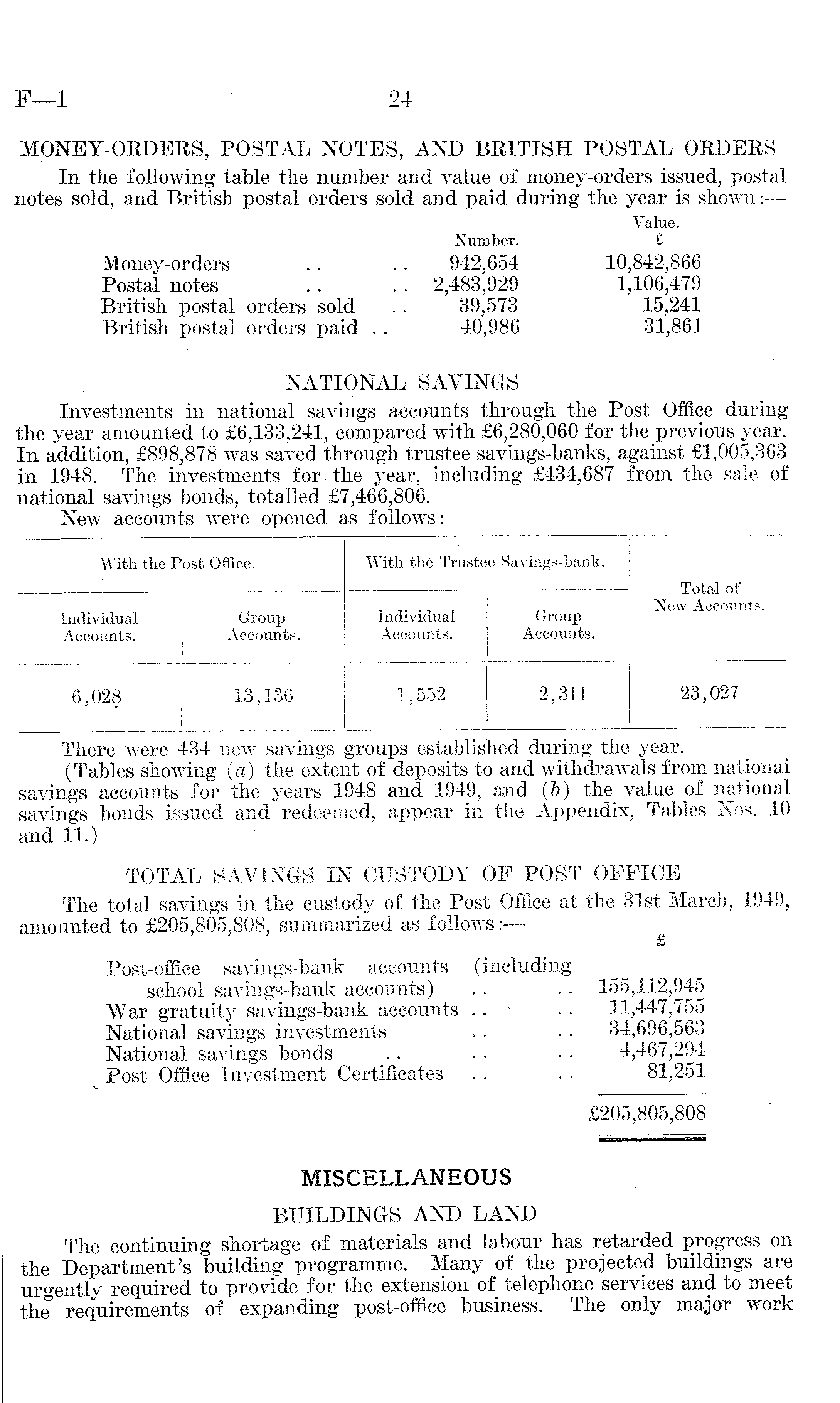 There were 434 new savings groups established during the year. (Tables showing (a) the extent of deposits to and withdrawals from national savings accounts for the years 1948 and 1949, and (b) the value of national savings bonds issued and redeemed, appear in the Appendix, Tables Nos. .10 and 11.) TOTAL SAYINGS IN CUSTODY OF POST OFFICE The total savings in the custody of the Post Office at the 31st March, 1949, amounted to £205,805,808, summarized as follows: — Post-office savings-bank accounts (including school savings-bank accounts) . . . . 155,112,945 War gratuity savings-bank accounts . . • .. 11,447,755 National savings investments . . • • 34,696,563 National savings bonds . . . . • • 4,467,294 Post Office Investment Certificates . . . . 81,251 £205,805,808 MISCELLANEOUS BUILDINGS AND LAND The continuing shortage of materials and labour has retarded progress on the Department's building programme. Many of the projected buildings are urgently required to provide for the extension of telephone services and to meet the requirements of expanding post-office business. The only major work