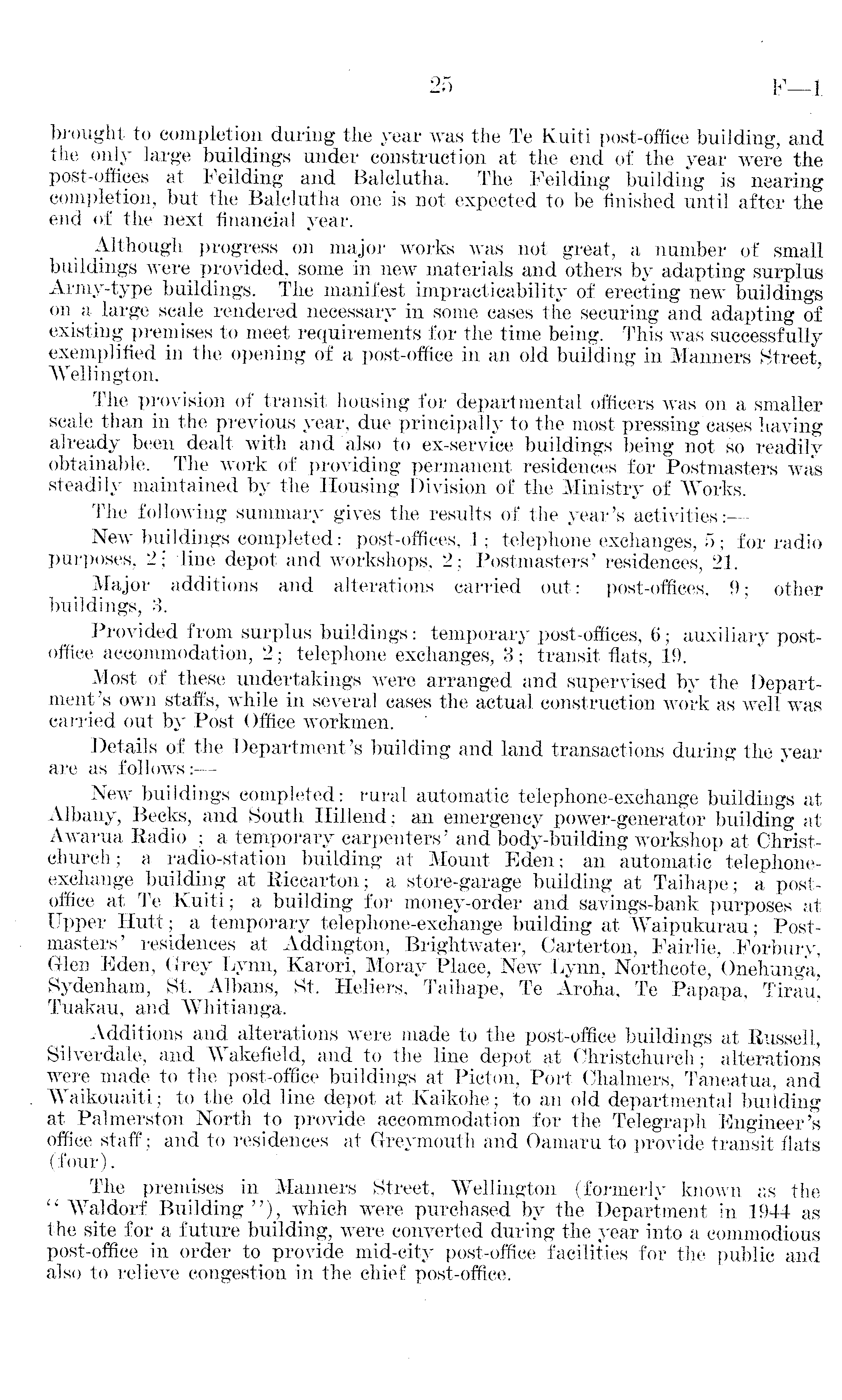 brought to completion during the year was the Te Kuiti post-office building, and the only large buildings under construction at the end of the year were the post-offices at Feilding and Balclutha. The Feilding building is nearing completion, but the Balclutha one is not expected to be finished until .after the end of the next financial year. Although progress 011 major works was not great, a number of small buildings were provided, some in new materials and others by adapting surplus Armv-type buildings. The manifest impracticability of erecting new buildings 011 a large scale rendered necessary in some cases the securing and adapting of existing premises to meet requirements for the time being. This was successfully exemplified in the opening of a post-office in an old building in Manners Street, Wellington. The provision of transit housing for departmental officers was on a smaller scale than in the previous year, due principally to the most pressing cases having already been dealt with and also to ex-service buildings being not so readily obtainable. The work of providing permanent residences for Postmasters was steadily maintained by the Housing Division of the Ministry of Works. The following summary gives the results of the year's activities:— New buildings completed: post-offices, 1; telephone exchanges, 5; for radio purposes, 2; line depot and workshops, 2; Postmasters' residences, 21. Major additions and alterations carried out: post-offices, 9; other buildings, 3. Provided from surplus buildings: temporary post-offices, 6; auxiliary postoffice accommodation, 2; telephone exchanges, 3; transit flats, 19. Most of these undertakings were arranged and supervised by the Department 's own staffs, while in several cases the actual construction work as well was carried out by Post Office workmen. Details of the Department's building and land transactions during the year are as follows: New buildings completed: rural automatic telephone-exchange buildings at Albany, Becks, and South Hillend; an emergency power-generator building at Awarua Radio ; a temporary carpenters' and body-building workshop at Christchurch; a radio-station building at Mount Eden; an automatic telephoneexchange building at Riccarton; a store-garage building at Taihape; a postoffice at Te Kuiti; a building for money-order and savings-bank purposes at Upper Hutt; a temporary telephone-exchange building at Waipukurau; Postmasters' residences at Addington, Brightwater, Carterton, Fairlie, Forbury, Glen Eden, Grey Lynn, Karori, Moray Place, New Lynn, Northcote, Onehunga, Sydenham,- St. Albans, St. Heliers, Taihape, Te Aroha, Te Papapa, Tirau, Tuakau, and Whitianga. Additions and alterations were made to the post-office buildings at Russell, Silverdale, and Wakefield, and to the line depot at Christchurch; alterations were made to the post-office buildings at Picton, Port Chalmers, Taneatua, and Waikouaiti; to the old line depot at Kaikohe; to an old departmental building at Palmerston North to provide accommodation for the Telegraph Engineer's office staff; and to residences at Greymouth and Oamaru to provide transit flats (four). The premises in Manners Street, Wellington (formerly known as the " Waldorf Building "), which were purchased by the Department in 1944 as the site for a future building, were converted during the year into a commodious post-office in order to provide mid-city post-office facilities for the public and also to relieve congestion in the chief post-office.