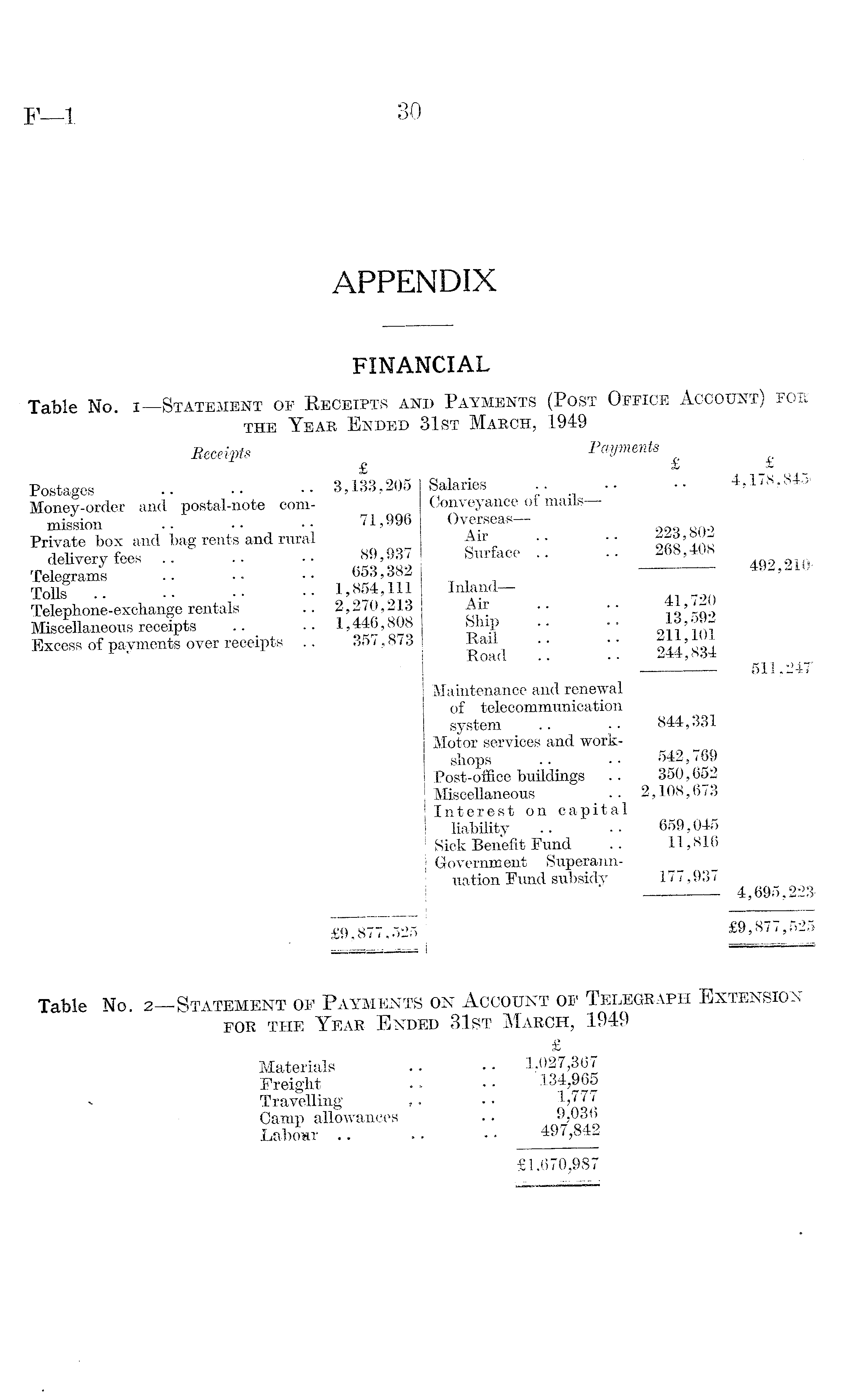 APPENDIX FINANCIAL Table No. I —Statement of Receipts and Payments (Post Office Account) fok the Year Ended 31st March, 1949 Receipts Payments £ A Postages .. •• •• 3,133,205 Salaries .. •• •• 4,178,843 Money-order and postal-note com- Conveyance ot mails mission .. •• 71,996 Overseas — LLLlfeblUII • • • • • 7 . . Of>q QAO Private box and bag rents and rural Air .. • - delivery fees 89,937 Surface .. .. 268,408 Telegrams 653,382 492,210 Tolls .. .. •• •• 1,854,111 Inland— Telephone-exchange rentals .. 2,270,213 Air .. • - ' m Miscellaneous receipts .. •• 1,446,808 Ship .. .. 911 ' 101 Excess of payments over receipts .. 357,873 .. •• £44 834 ° a " " 1 511,247" Maintenance and renewal of telecommunication system .. •• 844,331 Motor services and workshops .. . • 542,769 Post-office buildings .. 350,652 Miscellaneous .. 2,108,673 Interest on capital liability .. .. 659,045 Sick Benefit Fund .. 11,816 Government Superannuation Fund subsidy 177,937 4,695,223 £9,877,525 £9,877,525 Table No. 2 —Statement of Payments on Account of Telegraph Extension for the Year Ended 31st March, 1949 £ Materials .. • • Freight .. • • Travelling .. • • Camp allowances • • 9,036 Labour .. .. • • 497,842 £1,670,987
