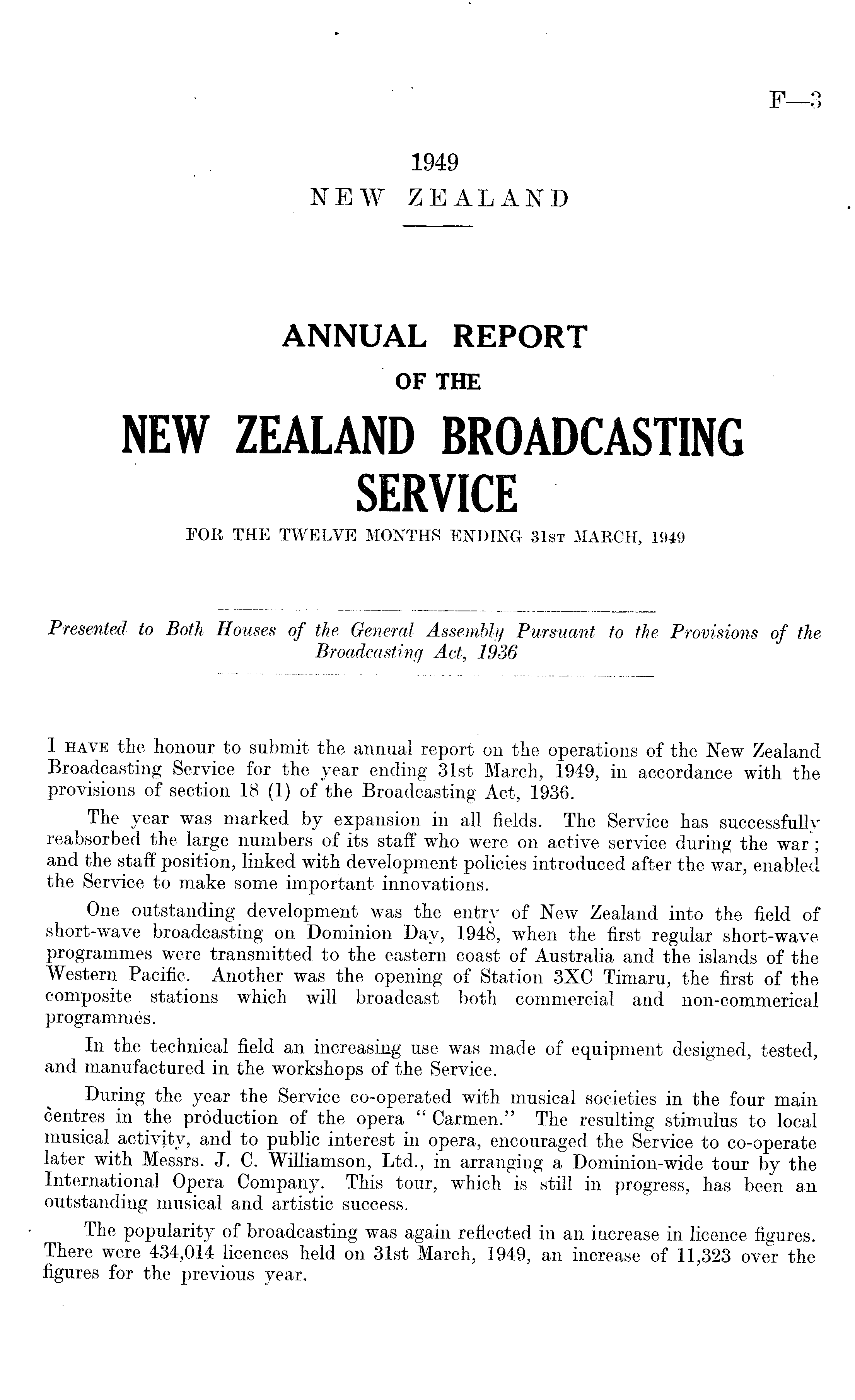 I have the honour to submit the annual report on the operations of the New Zealand Broadcasting Service for the year ending 31st March, 1949, in accordance with the provisions of section 18 (1) of the Broadcasting Act, 1936. The year was marked by expansion in all fields. The Service has successfully reabsorbed the large numbers of its staff who were on active service during the war ; and the staff position, linked with development policies introduced after the war, enabled the Service to make some important innovations. One outstanding development was the entry of New Zealand into the field of short-wave broadcasting on Dominion Day, 1948, when the first regular short-wave programmes were transmitted to the eastern coast of Australia and the islands of the Western Pacific. Another was the opening of Station 3XC Timaru, the first of the composite stations which will broadcast both commercial and non-commerical programmes. In the technical field an increasing use was made of equipment designed, tested, and manufactured in the workshops of the Service. During the year the Service co-operated with musical societies in the four main centres in the production of the opera "Carmen." The resulting stimulus to local musical activity, and to public interest in opera, encouraged the Service to co-operate later with Messrs. J. C. Williamson, Ltd., in arranging a Dominion-wide tour by the Internationa] Opera Company. This tour, which is still in progress, has been an outstanding musical and artistic success. The popularity of broadcasting was again reflected in an increase in licence figures. There were 434,014 licences held on 31st March, 1949, an increase of 11,323 over the figures for the previous year.