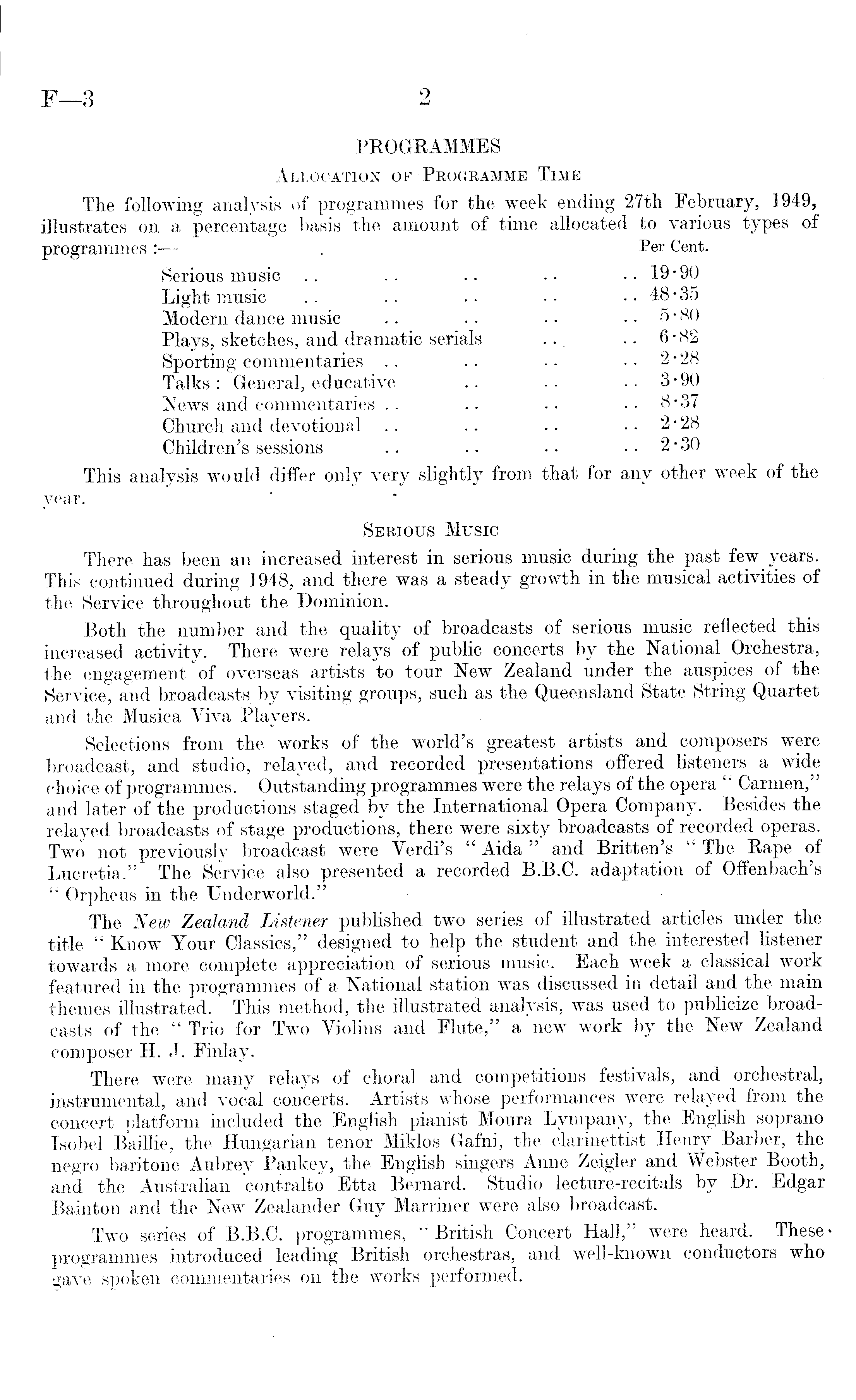 PROGRAMMES Allocation of Programme Time The following analysis of programmes for the week ending 27th February, 1949, illustrates on a percentage basis the amount of time allocated to various types of programmes: — . Per Cent. Serious music .. .. .. .. ..19-90 Light music .. .. .. • - .. 48 •35 Modern dance music .. .. .. .. 5• 80 Plays, sketches, and dramatic serials ... .. 6-82 Sporting commentaries .. .. •• ..2-28 Talks: General, educative .. .. ..3-90 News and commentaries .. .. •• 8'37 Church and devotional .. .. . - 2• 28 Children's sessions .. .. •• .. 2*30 This analysis would differ only very slightly from that for any other week of the year: Serious Music There has been an increased interest in serious music during the past few years. This continued during 1948, and there was a steady growth in the musical activities of the Service throughout the Dominion. Both the number and the quality of broadcasts of serious music reflected this increased activity. There were relays of public concerts by the National Orchestra, the engagement of overseas artists to tour New Zealand under the auspices of the Service, and broadcasts by visiting groups, such as the Queensland State String Quartet and the Musica Viva Players. Selections from the works of the world's greatest artists and composers were broadcast, and studio, relayed, and recorded presentations offered listeners a wide choice of programmes. Outstanding programmes were the relays of the opera " Carmen," and later of the productions staged by the International Opera Company. Besides the relayed broadcasts of stage productions, there were sixty broadcasts of recorded operas. Two not previously broadcast were Verdi's " Aida " and Britten's " The Rape of Lucretia." The Service also presented a recorded 8.8.C. adaptation of Offenbach's " Orpheus in the Underworld." The New Zealand Listener published two series of illustrated articles under the title " Know Your Classics," designed to help the student and the interested listener towards a more complete appreciation of serious music. Each week a classical work featured in the programmes of a National station was discussed in detail and the main themes illustrated. This method, the illustrated analysis, was used to publicize broadcasts of the " Trio for Two Violins and Flute," a new work by the New Zealand composer H. J. Finlay. There were many relays of choral and competitions festivals, and orchestral, instrumental, and vocal concerts. Artists whose performances were relayed from the concert platform included the English pianist Moura Tympany, the English soprano Isobel Baillie, the Hungarian tenor Miklos Gafni, the clarinettist Henry Barber, the negro baritone Aubrey Pankey, the English singers Anne Zeigler and Webster Booth, and the Australian contralto Etta Bernard. Studio lecture-recitals by Dr. Edgar Bainton and the New Zealander Guy Marriner were also broadcast. Two series of 8.8.C. programmes, " British Concert Hall," were heard. These programmes introduced leading British orchestras, and well-known conductors who gave spoken commentaries on the works performed.