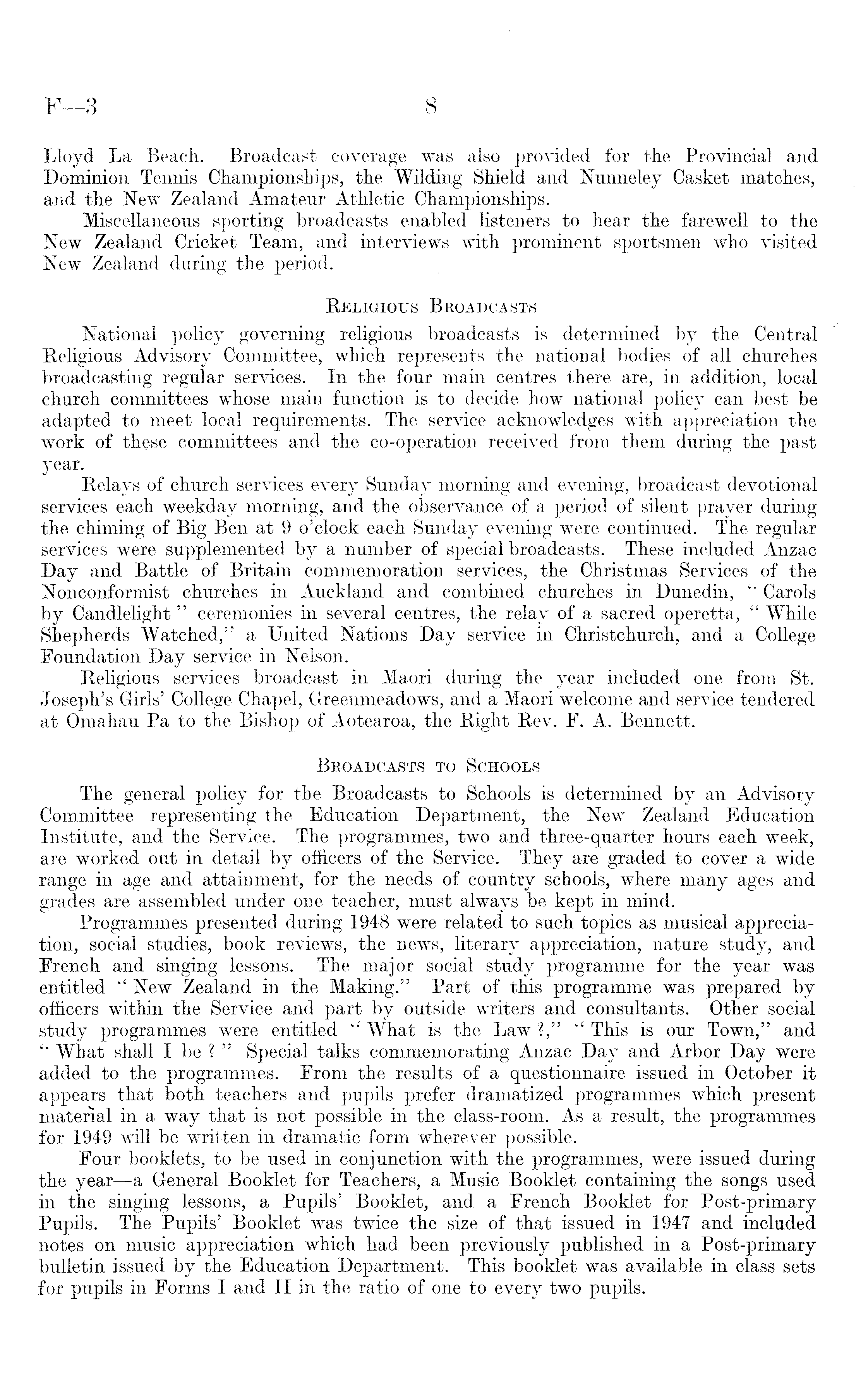 Lloyd La Beach. Broadcast coverage was also provided for the Provincial and Dominion Tennis Championships, the Wilding Shield and Nunneley Casket matches, and the New Zealand Amateur Athletic Championships. Miscellaneous sporting broadcasts enabled listeners to hear the farewell to the New Zealand Cricket Team, and interviews with prominent sportsmen who visited New Zealand during the period. Religious Broadcasts National policy governing religious broadcasts is determined by the Central Religious Advisory Committee, which represents the national bodies of all churches broadcasting regular services. In the four main centres there are, in addition, local church committees whose main function is to decide how national policy can best be adapted to meet local requirements. The service acknowledges with appreciation the work of these committees and the co-operation received from them during the past year. Relays of church services every Sunday morning and evening, broadcast devotional services each weekday morning, and the observance of a period of silent prayer during the chiming of Big Ben at 9 o'clock each Sunday evening were continued. The regular services were supplemented by a number of special broadcasts. These included Anzac Day and Battle of Britain commemoration services, the Christmas Services of the Nonconformist churches in Auckland and combined churches in Dunedin, " Carols by Candlelight " ceremonies in several centres, the relay of a sacred operetta, " While Shepherds Watched," a United Nations Day service in Christchurch, and a College Foundation Day service in Nelson. Religious services broadcast in Maori during the year included one from St. Joseph's Girls' College Chapel, Greenmeadows, and a Maori welcome and service tendered at Omahau Pa to the Bishop of Aotearoa, the Right Rev. F. A. Bennett. Broadcasts to Schools The general policy for the Broadcasts to Schools is determined by an Advisory Committee representing the Education Department, the New Zealand Education Institute, and the Service. The programmes, two and three-quarter hours each week, are worked out in detail by officers of the Service. They are graded to cover a wide range in age and attainment, for the needs of country schools, where many ages and grades are assembled under one teacher, must always be kept in mind. Programmes presented during 1948 were related to such topics as musical appreciation, social studies, book reviews, the news, literary appreciation, nature study, and French and singing lessons. The major social study programme for the year was entitled " New Zealand in the Making." Part of this programme was prepared by officers within the Service and part by outside writers and consultants. Other social study programmes were entitled " What is the Law " This is our Town," and " What shall I be ? " Special talks commemorating Anzac Day and Arbor Day were added to the programmes. From the results of a questionnaire issued in October it appears that both teachers and pupils prefer dramatized programmes which present material in a way that is not possible in the class-room. As a result, the programmes for 1949 will be written in dramatic form wherever possible. Four booklets, to be used in conjunction with the programmes, were issued during the year —a General Booklet for Teachers, a Music Booklet containing the songs used in the singing lessons, a Pupils' Booklet, and a French Booklet for Post-primary Pupils. The Pupils' Booklet was twice the size of that issued in 1947 and included notes on music appreciation which had been previously published in a Post-primary bulletin issued by the Education Department. This booklet was available in class sets for pupils in Forms I and II in the ratio of one to every two pupils.